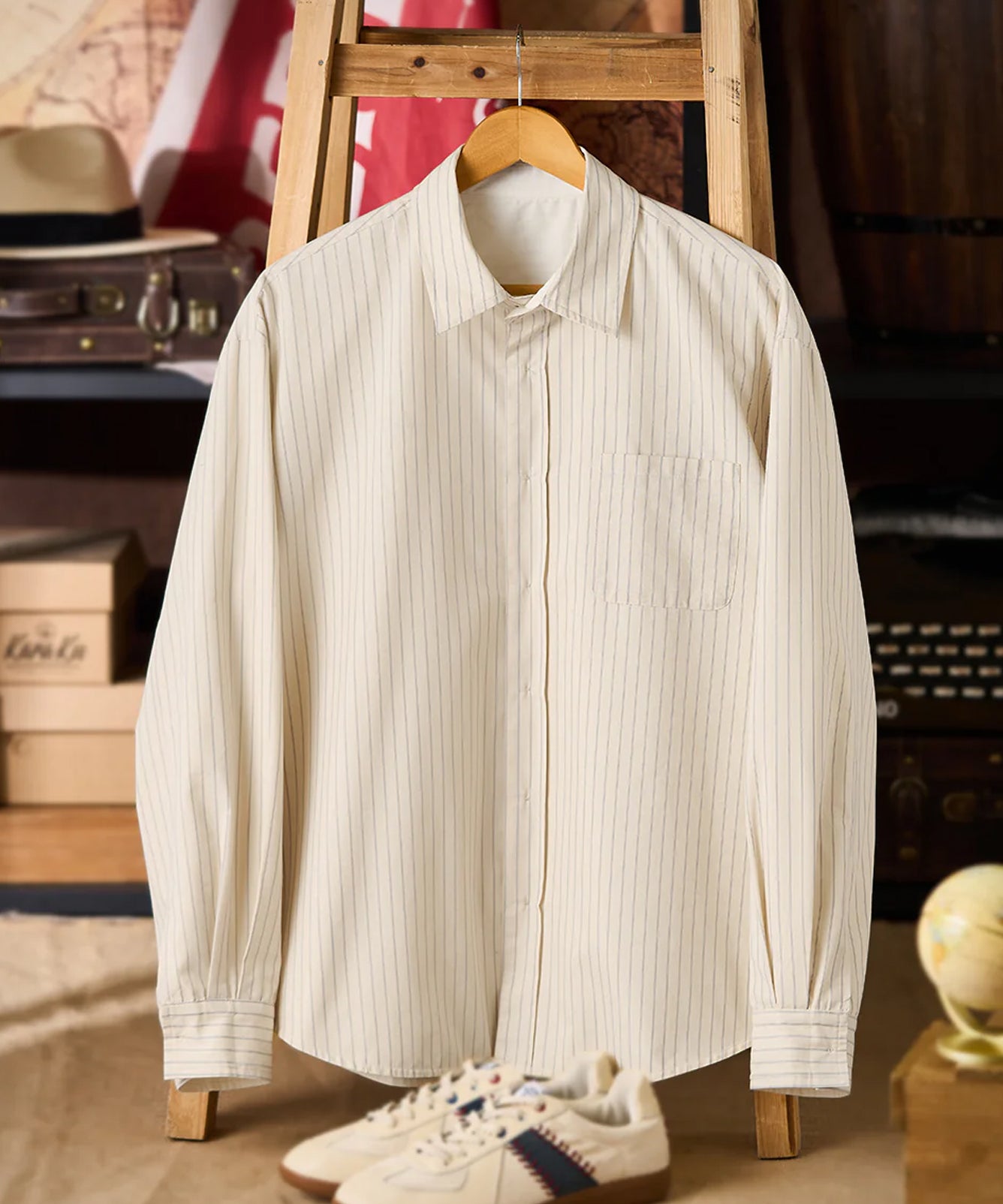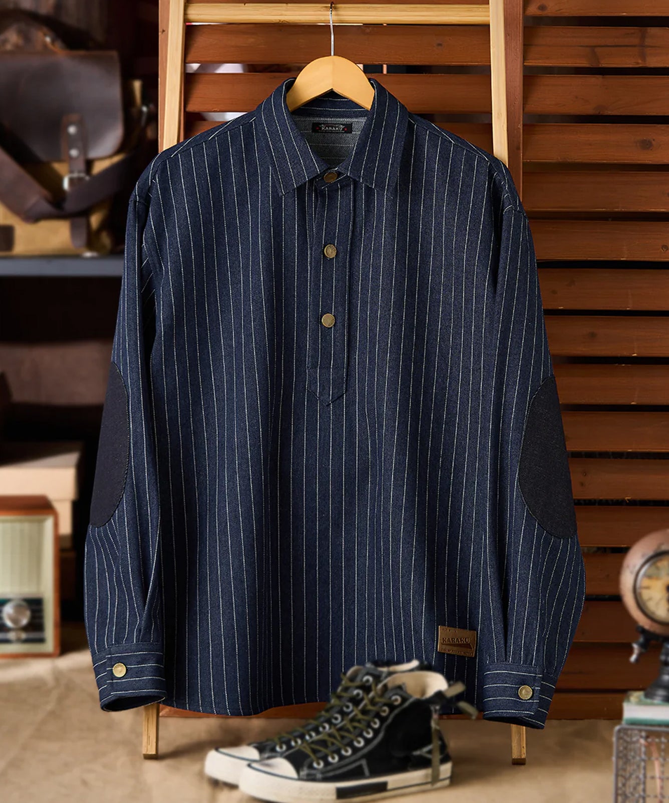 【予約】肘パッチ入り ハーフボタン付きストライプ柄デニムプルオーバーシャツ