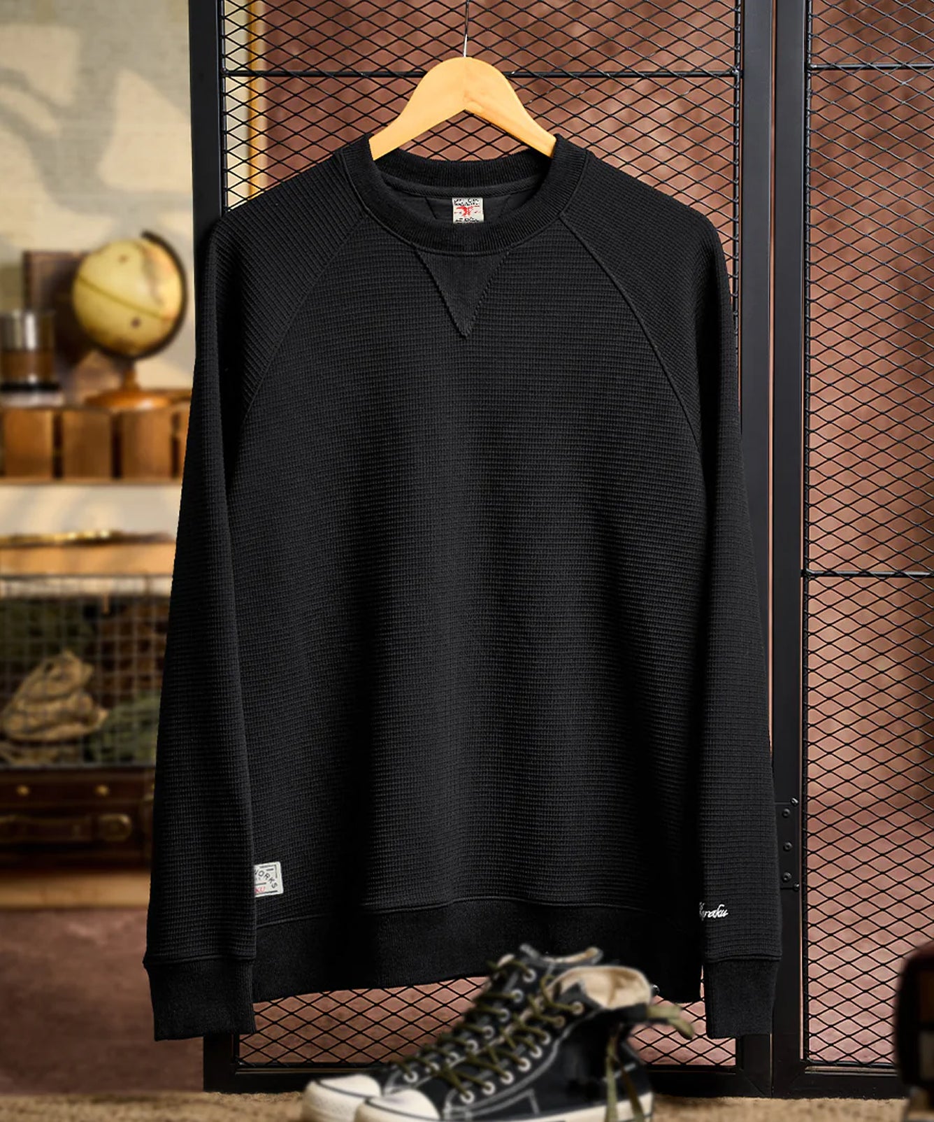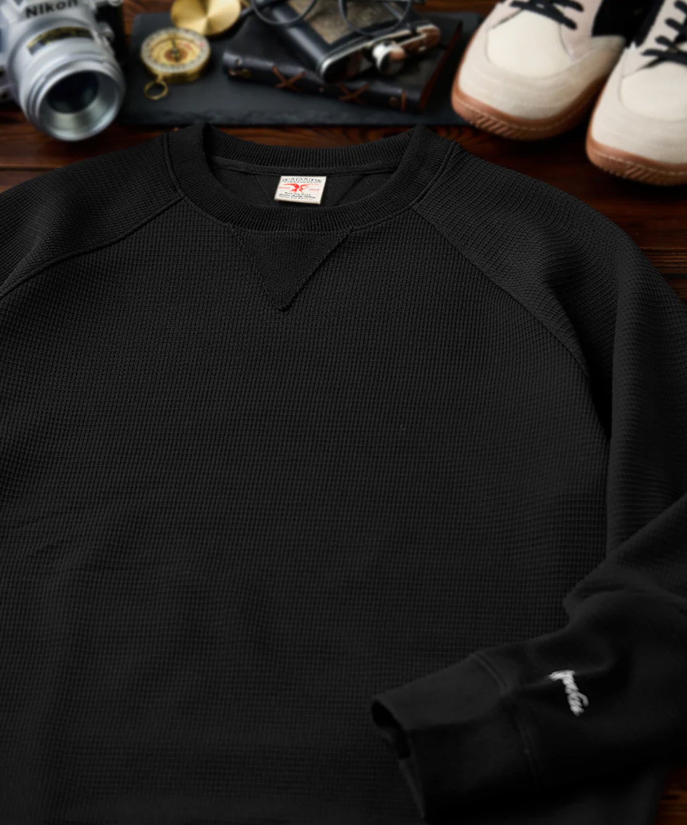 【予約】袖「KaraKu」刺繡ロゴ ワッフルエアレイヤーVガゼットスウェット