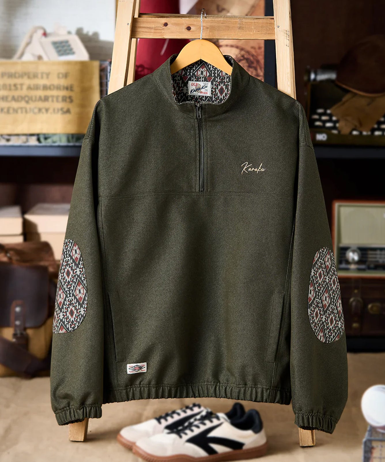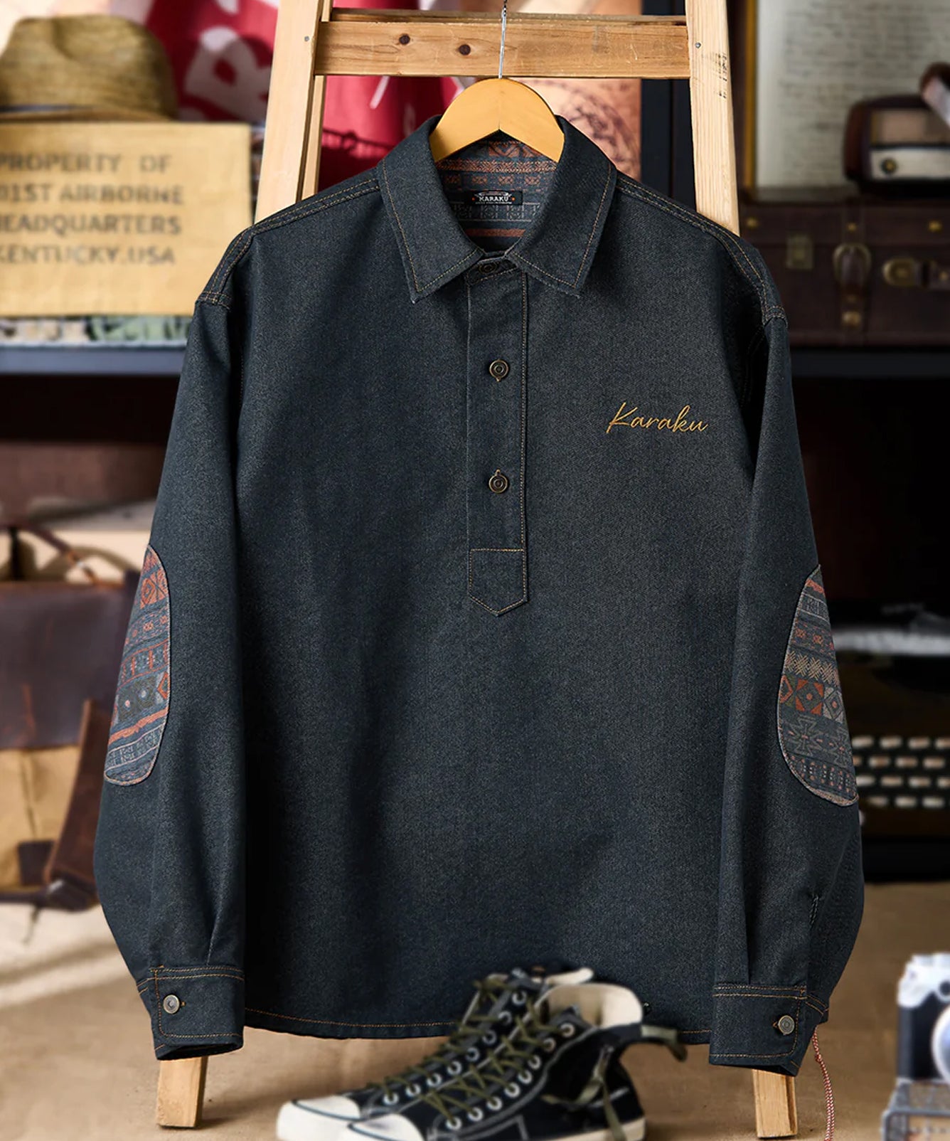 【予約】「KaraKu」ロゴ刺繡 裏ナバホ調柄・肘パッチハーフジップデニムスウェット