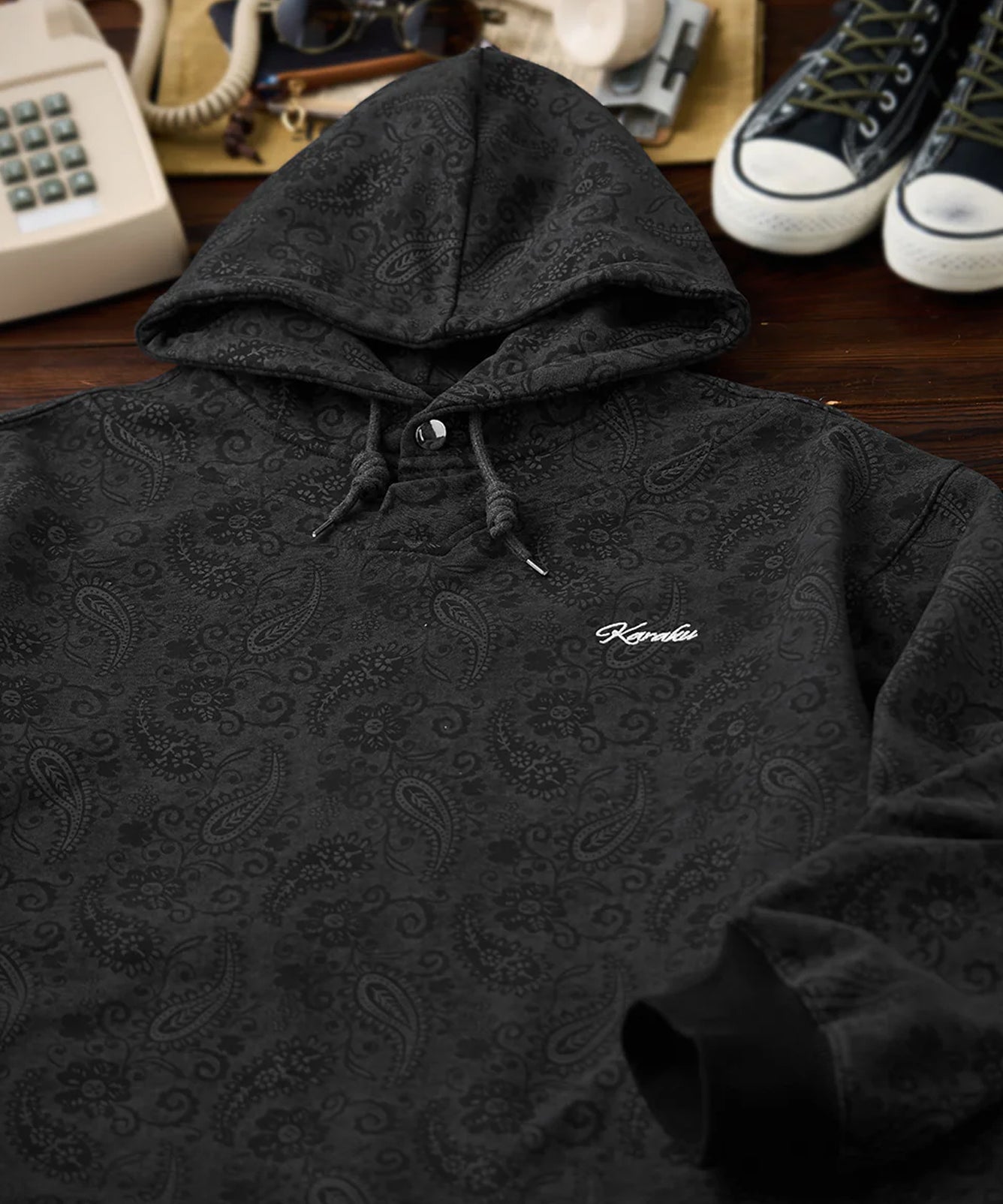 【予約】「KaraKu」刺繡ロゴ ペイズリー総柄コットンフーディー