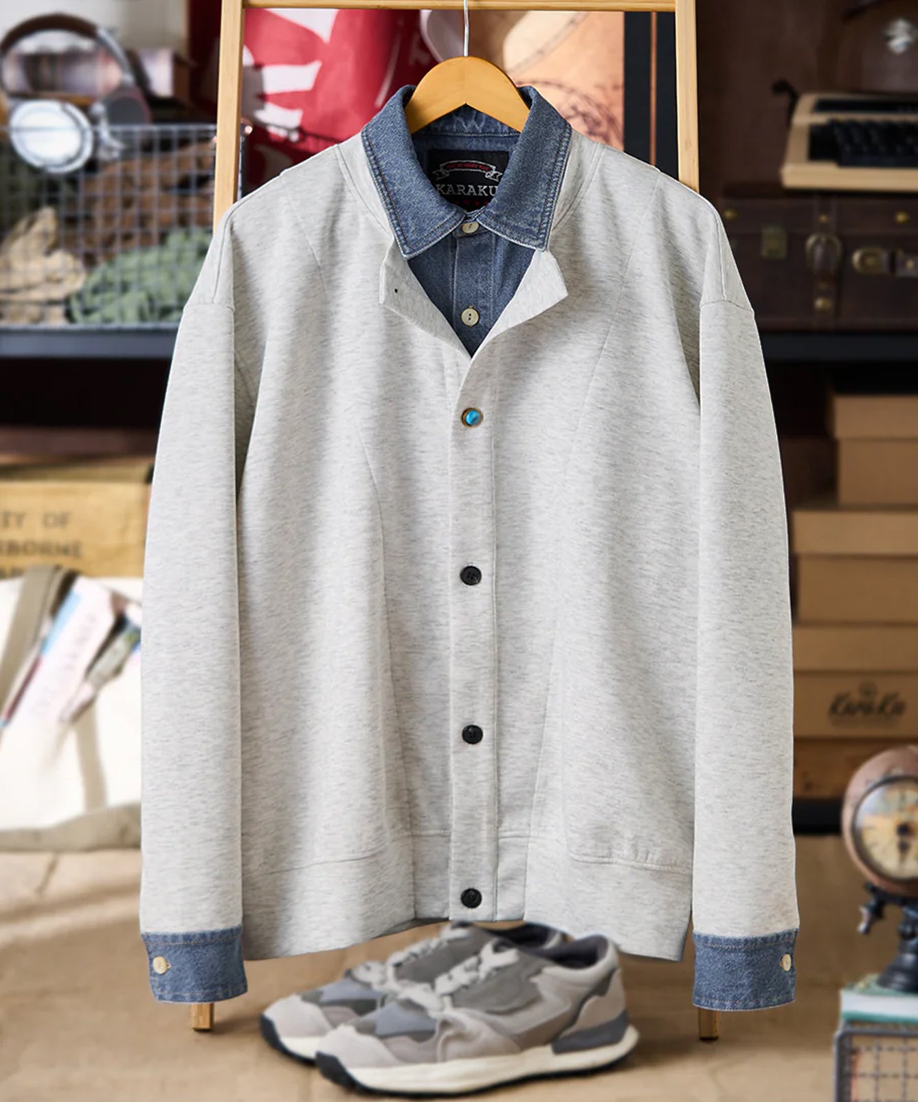【予約】異素材コンビ ポケット・前立てデニム切替ヘンリーネックスウェット