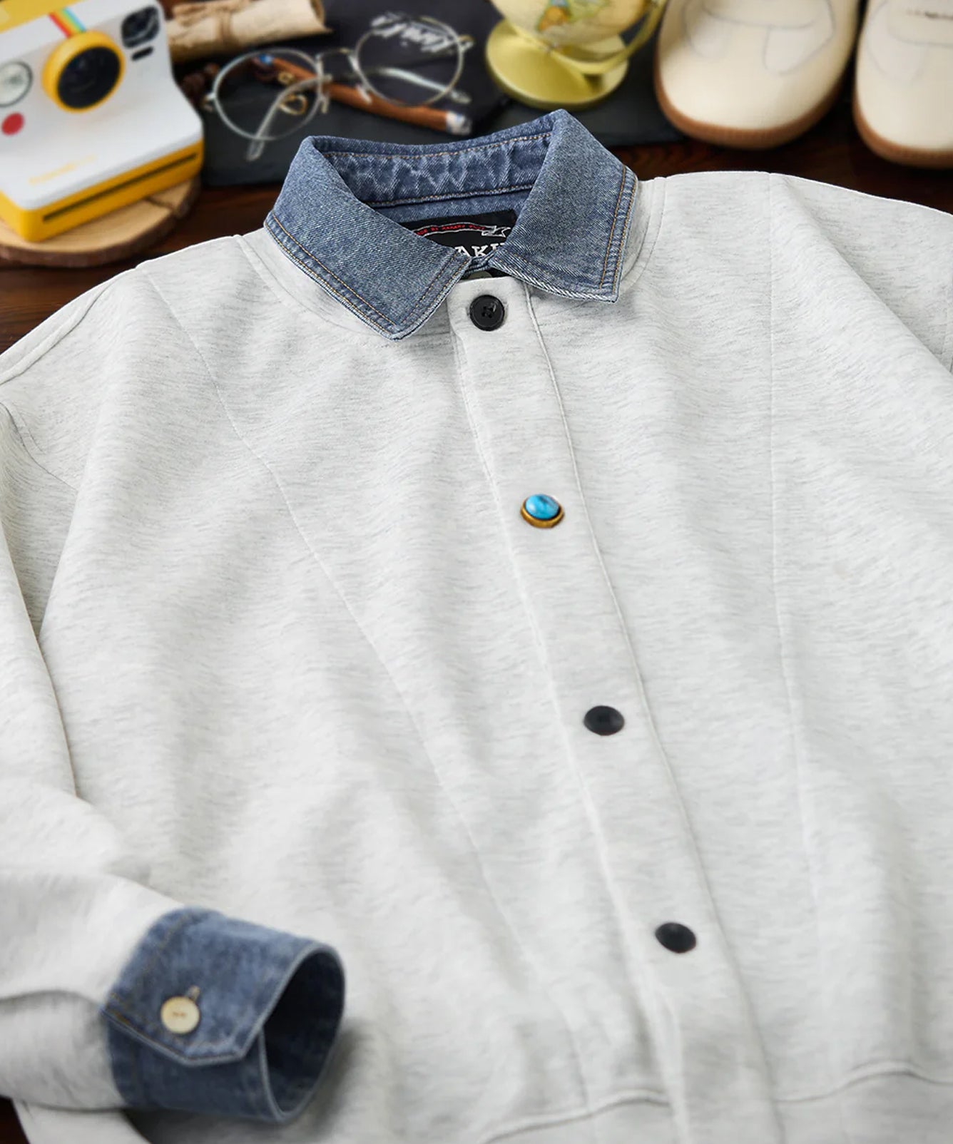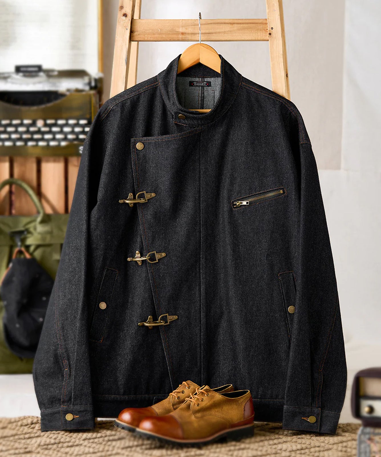 【予約】フックボタン付き斜め前立て スタンドカラーデニムジャケット