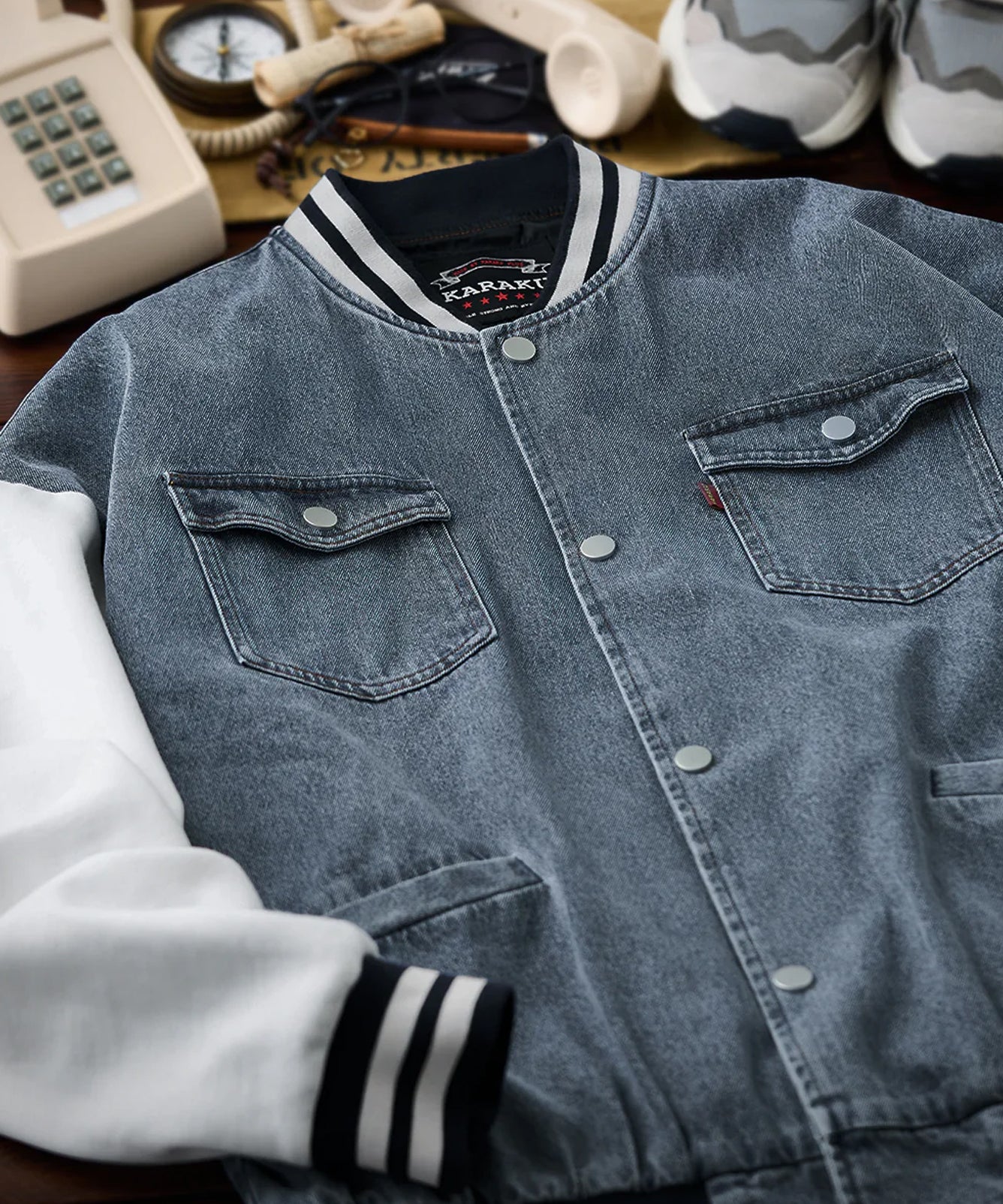 【予約】袖異素材切替 マルチポケット付きデニムスタジャン