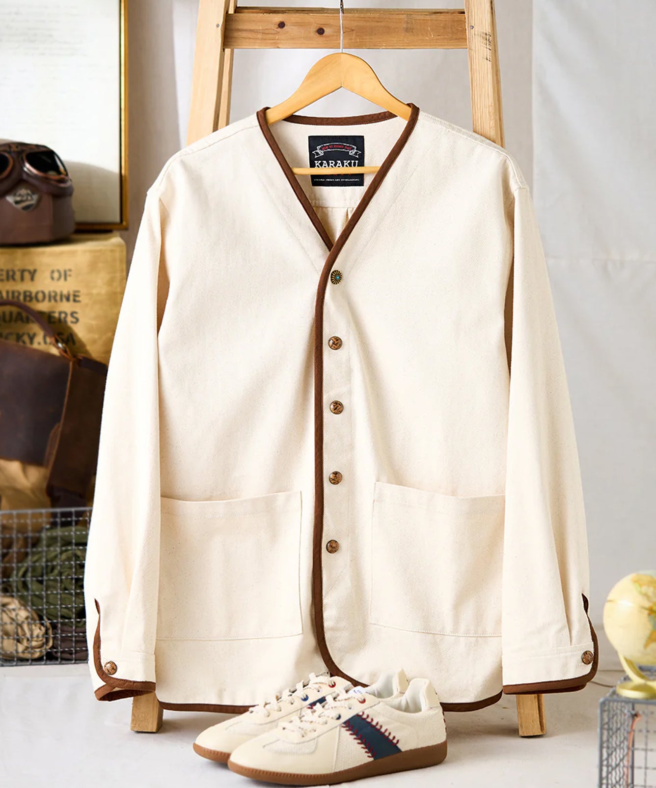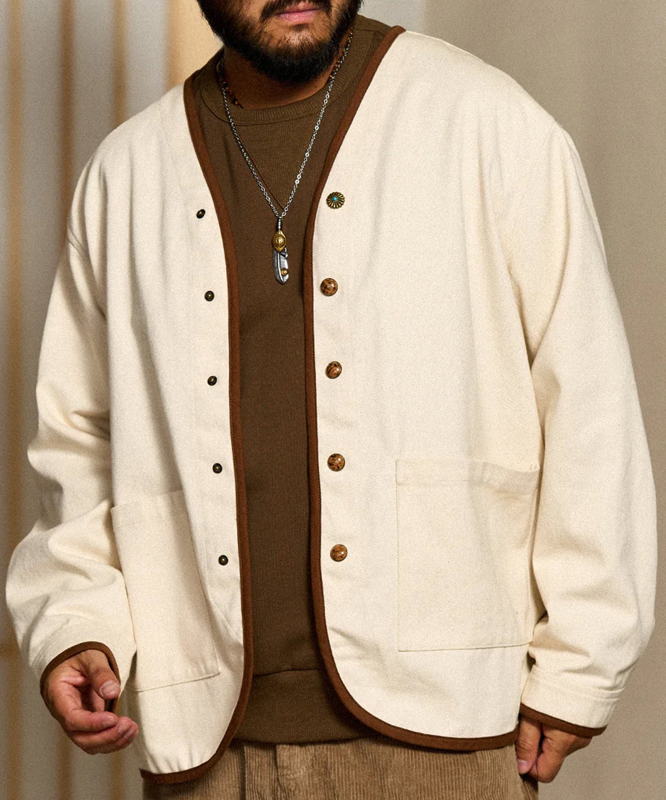 【予約】石調&花型ボタン付き パイピング加工ノーカラージャケット