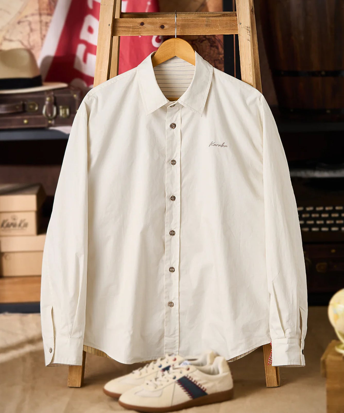 【予約】赤ヒモ付き 無地×ストライプ柄リバーシブル仕様長袖シャツ