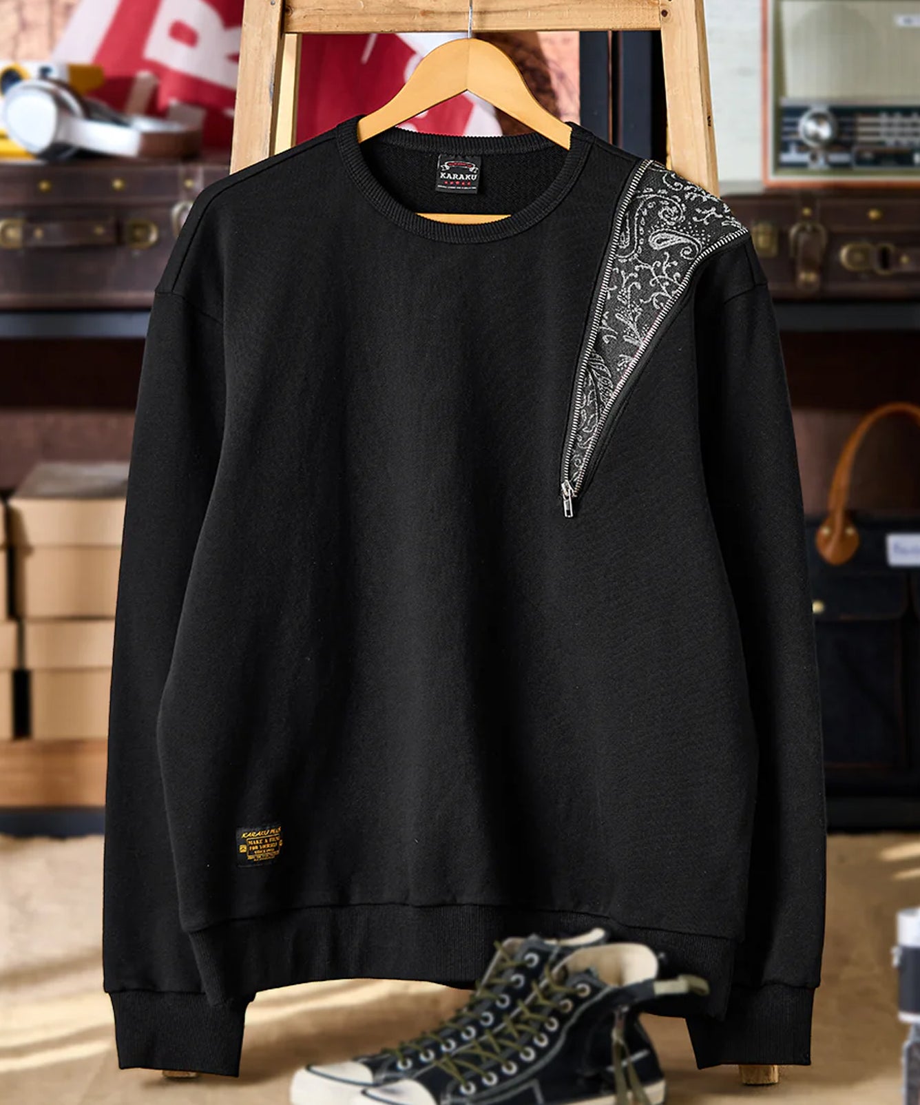 【予約】ペイズリー柄デニム切替&ジップ入り クルーネックプルオーバースウェット