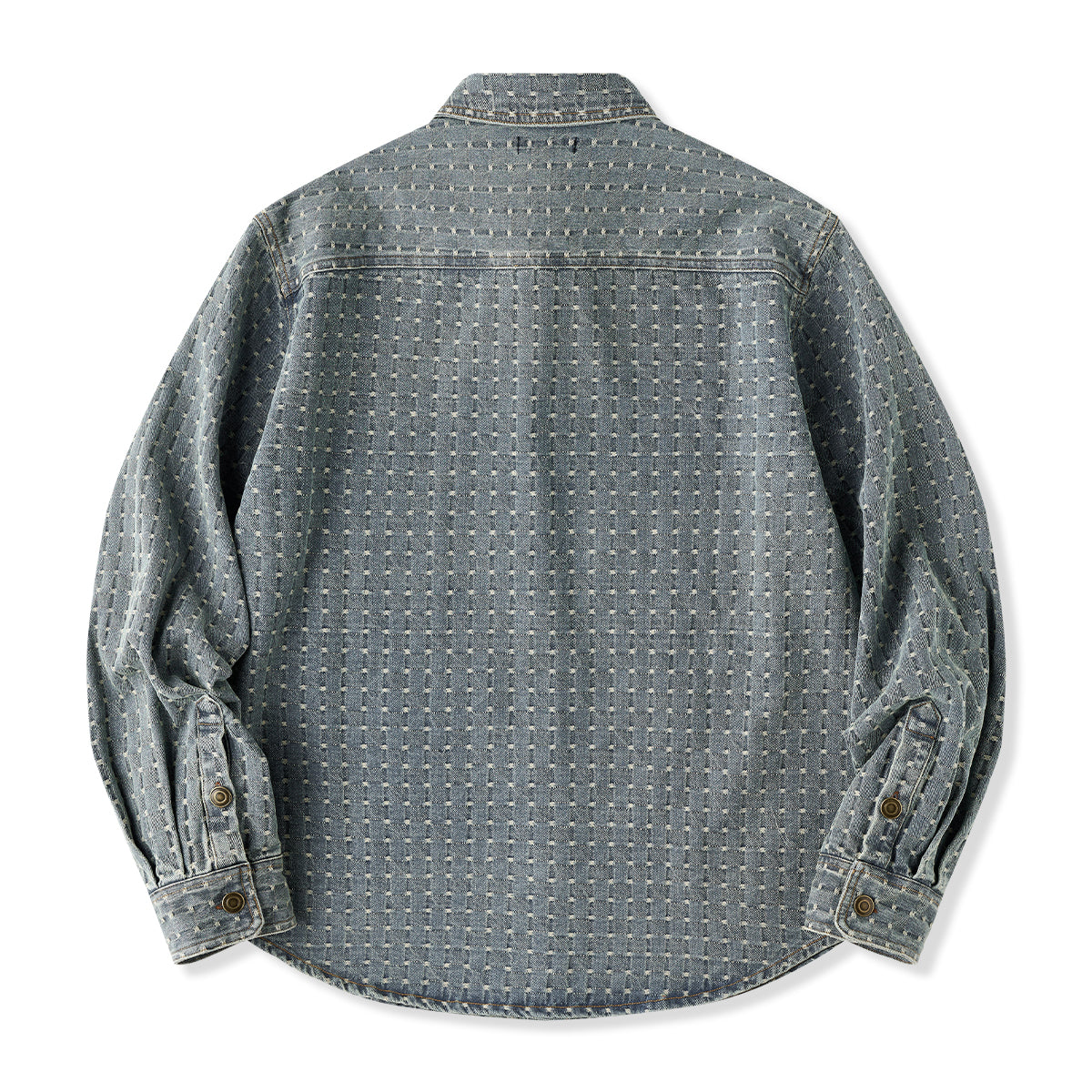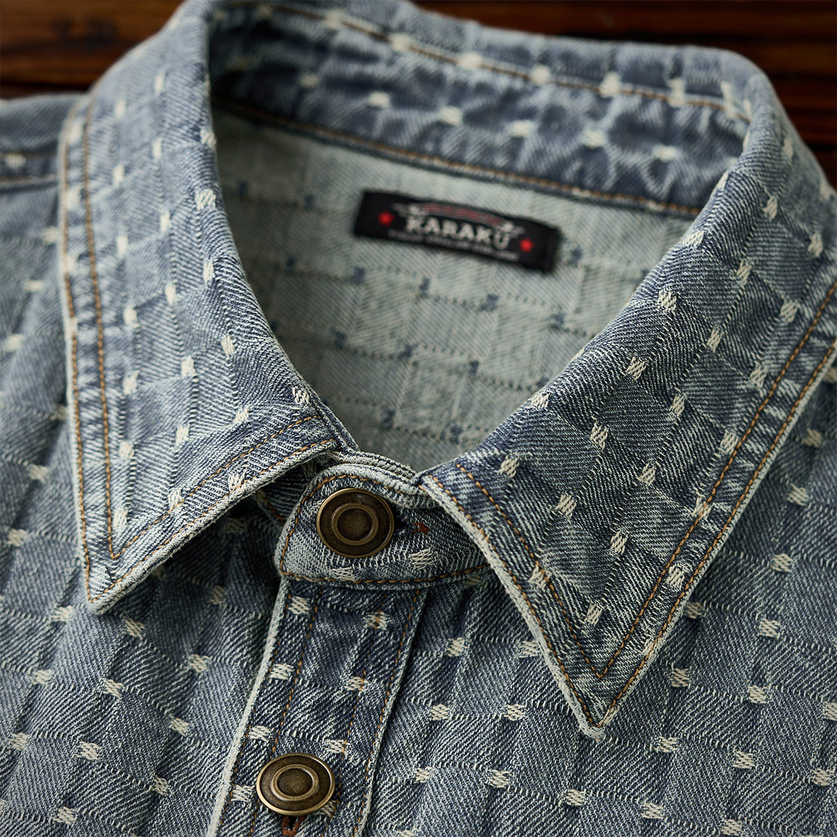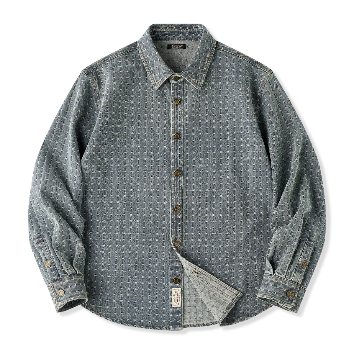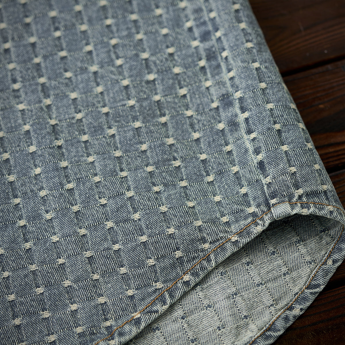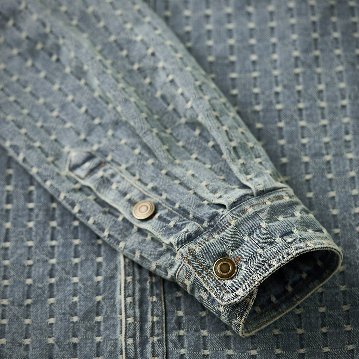 【予約】ジャカード織りチェック柄 アンティーク調ボタン付きデニムシャツ