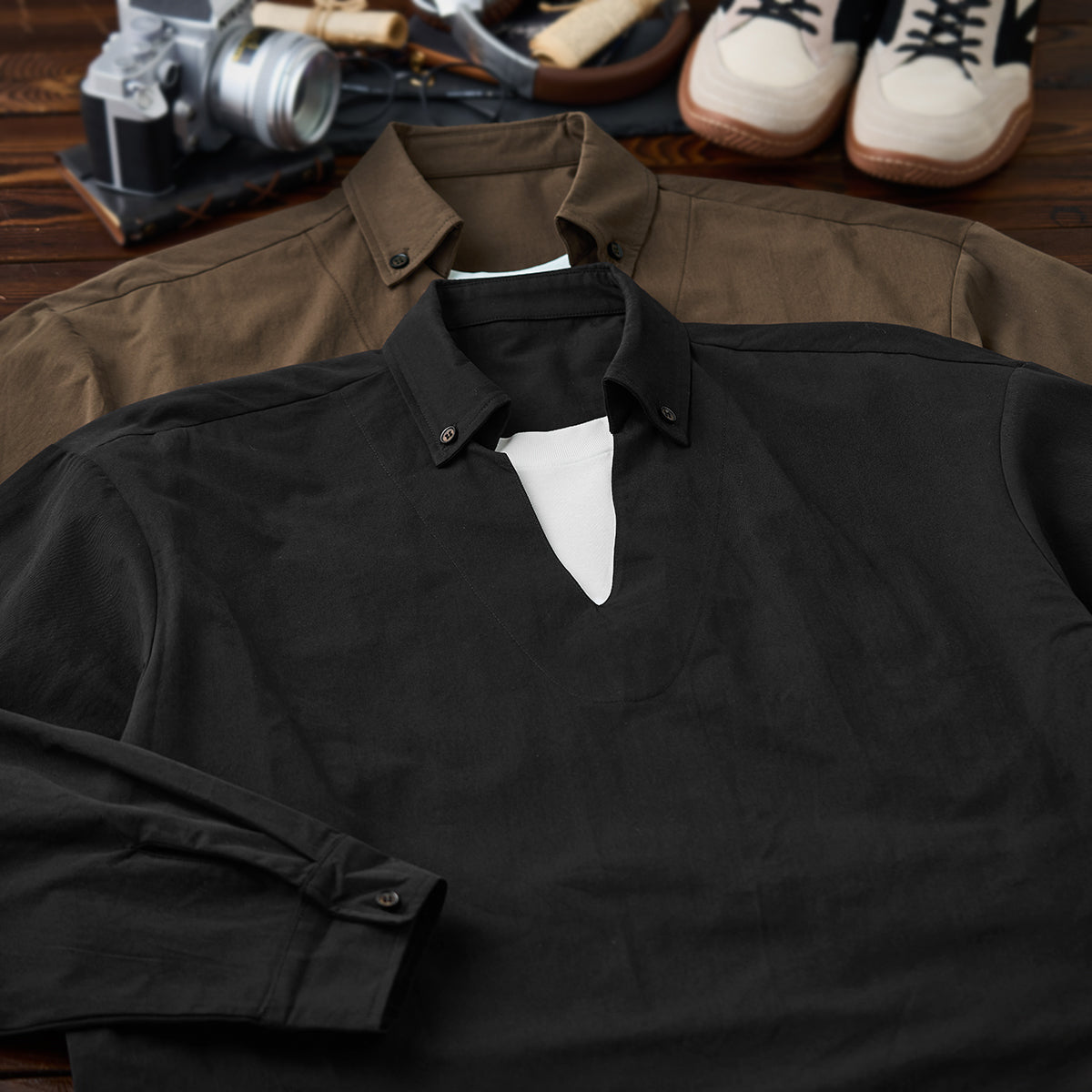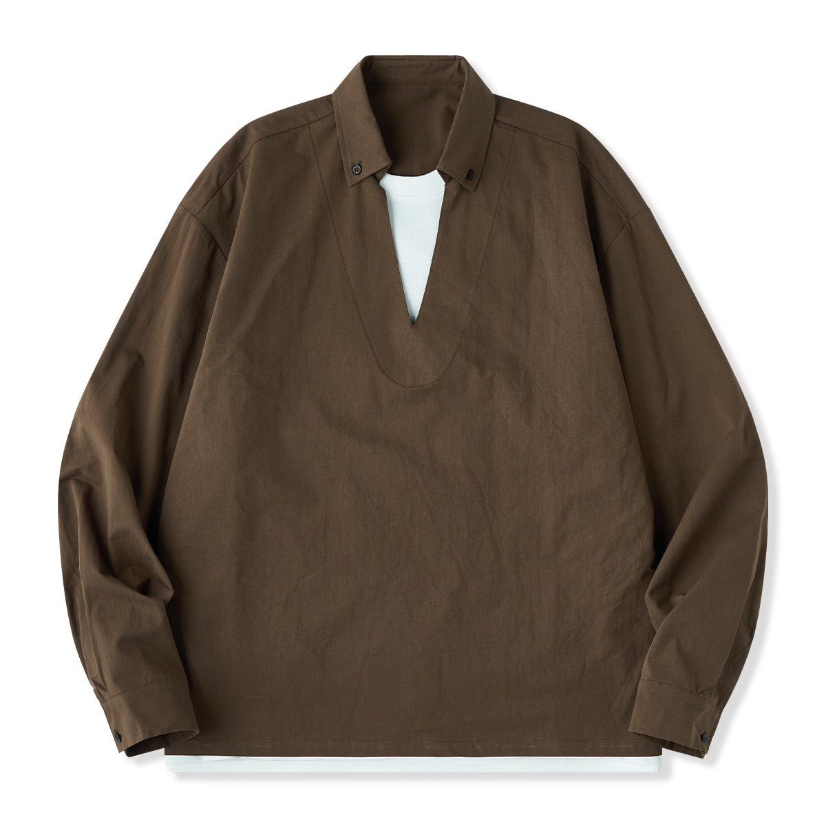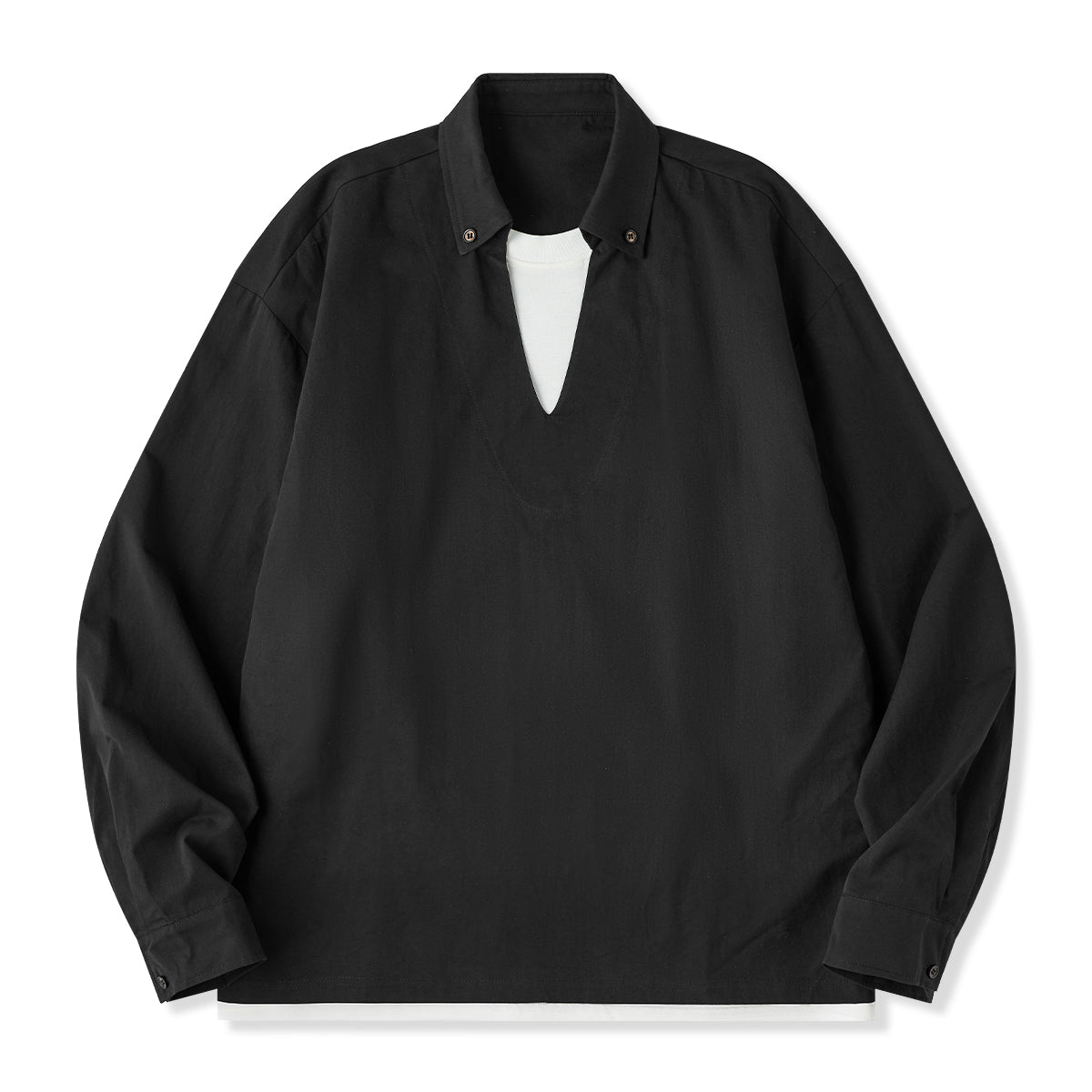 2色展開 フェイクレイヤードポロカラーVネック長袖シャツ