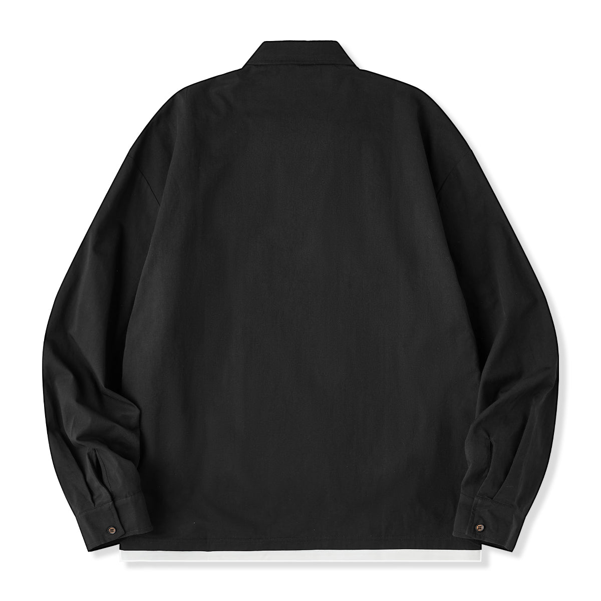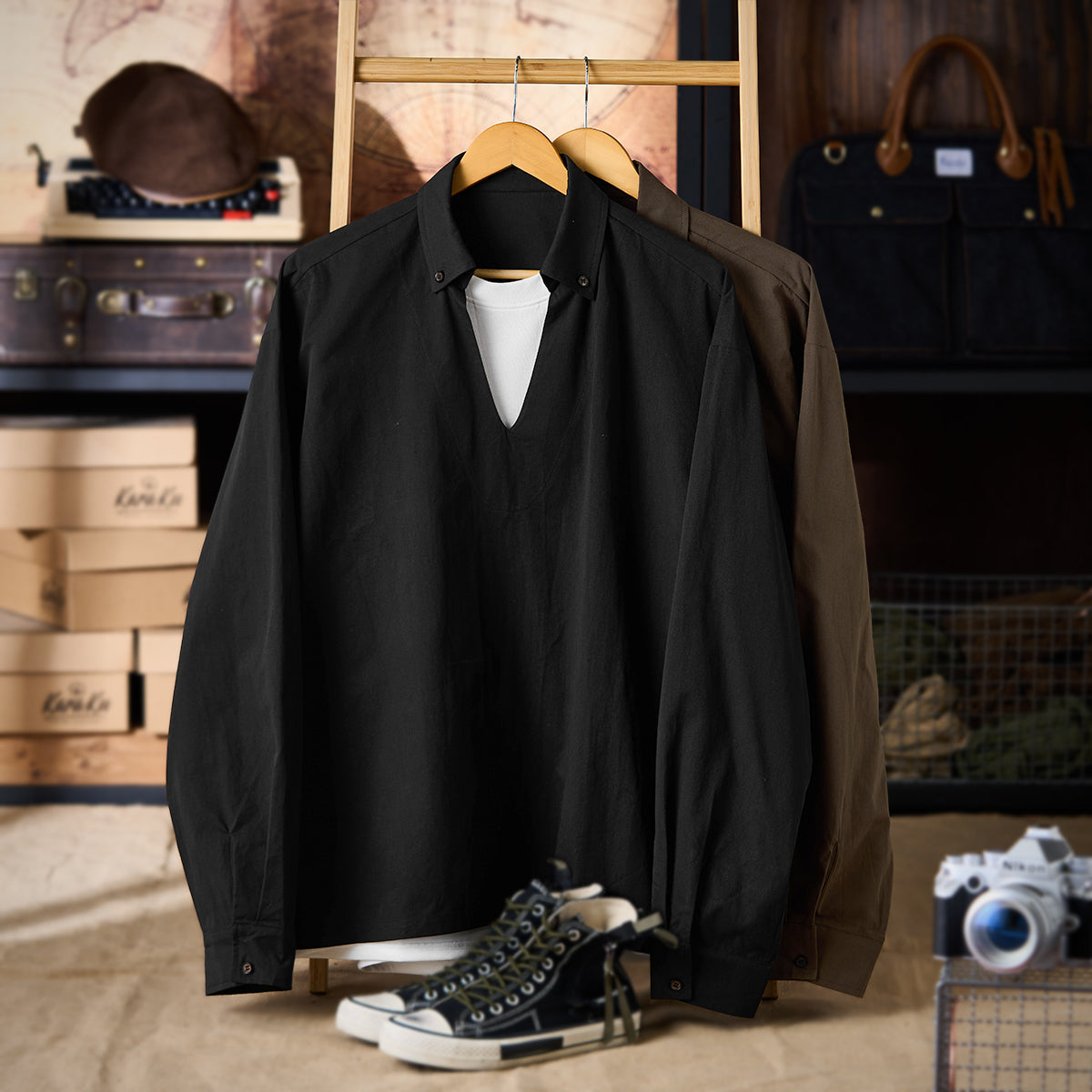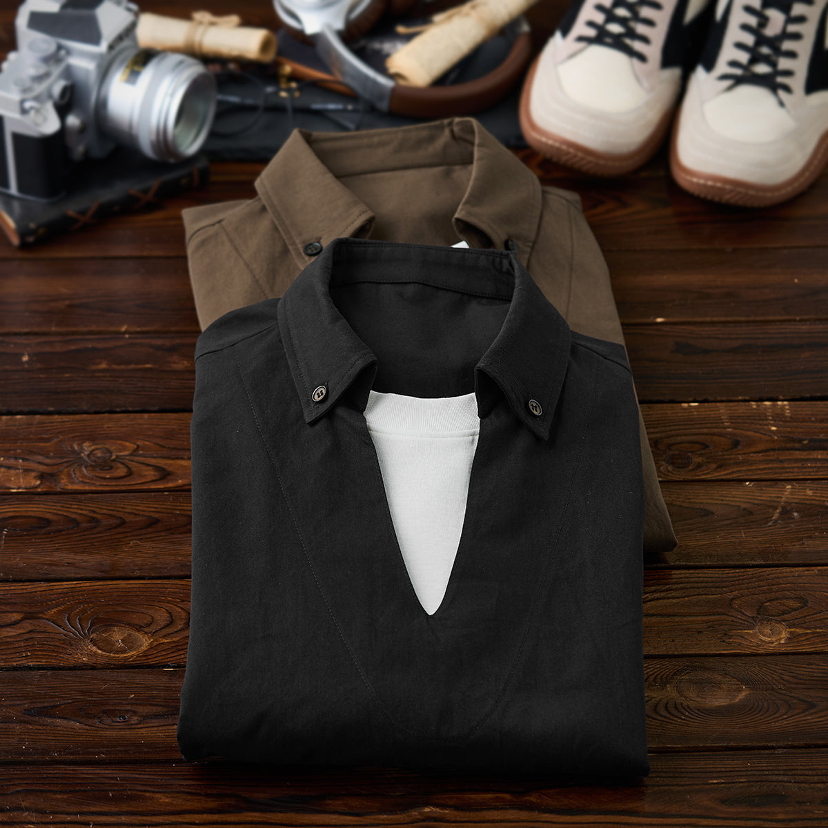 2色展開 フェイクレイヤードポロカラーVネック長袖シャツ