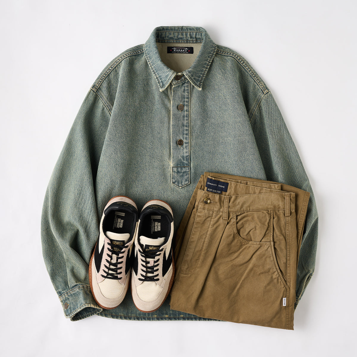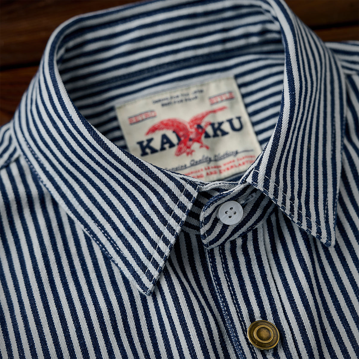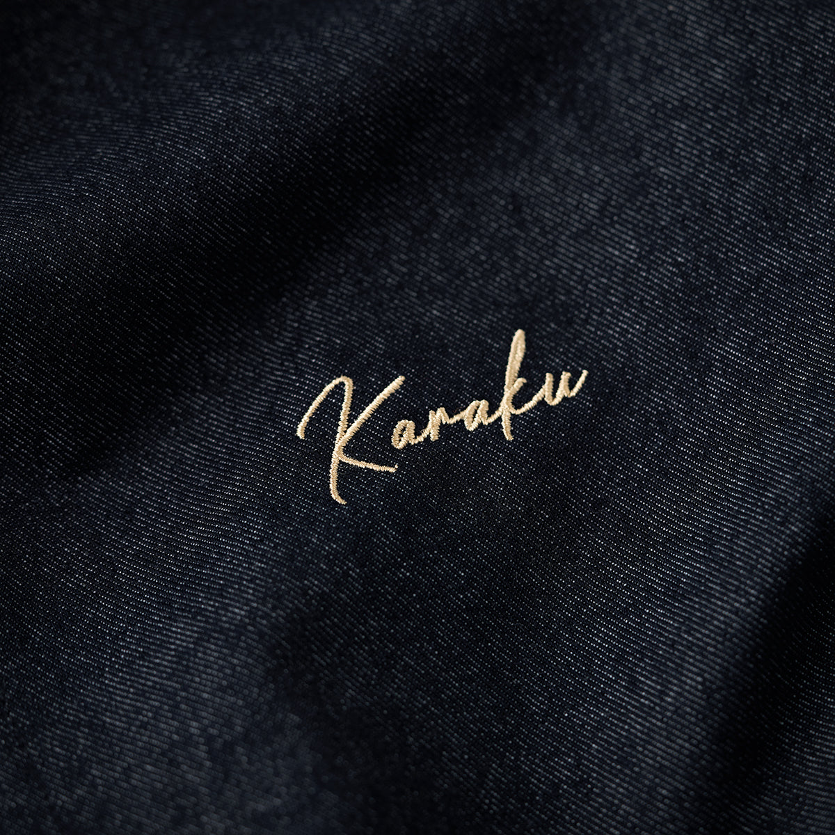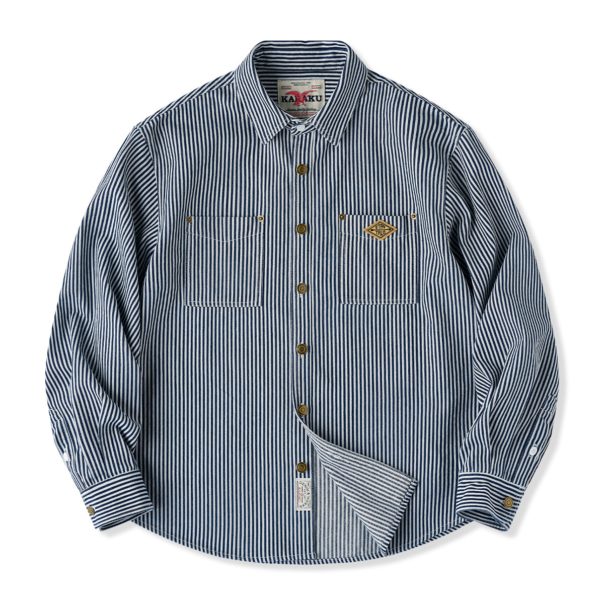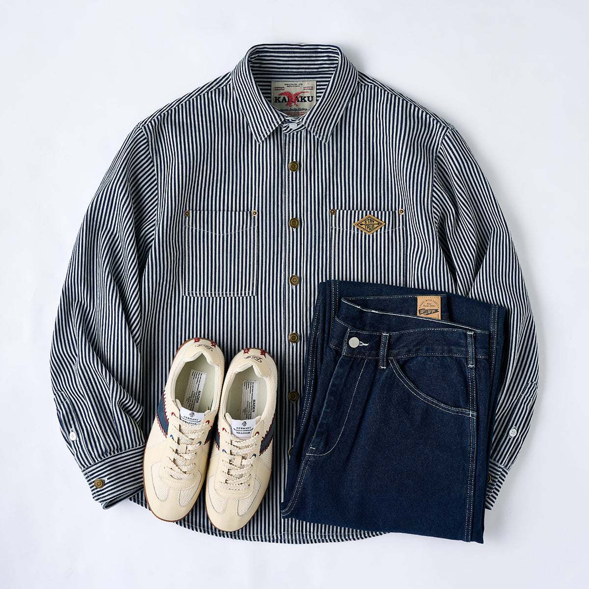 【予約】Karaku「コマ」ロゴ刺繍入り 裏ストライプ柄デニムシャツ