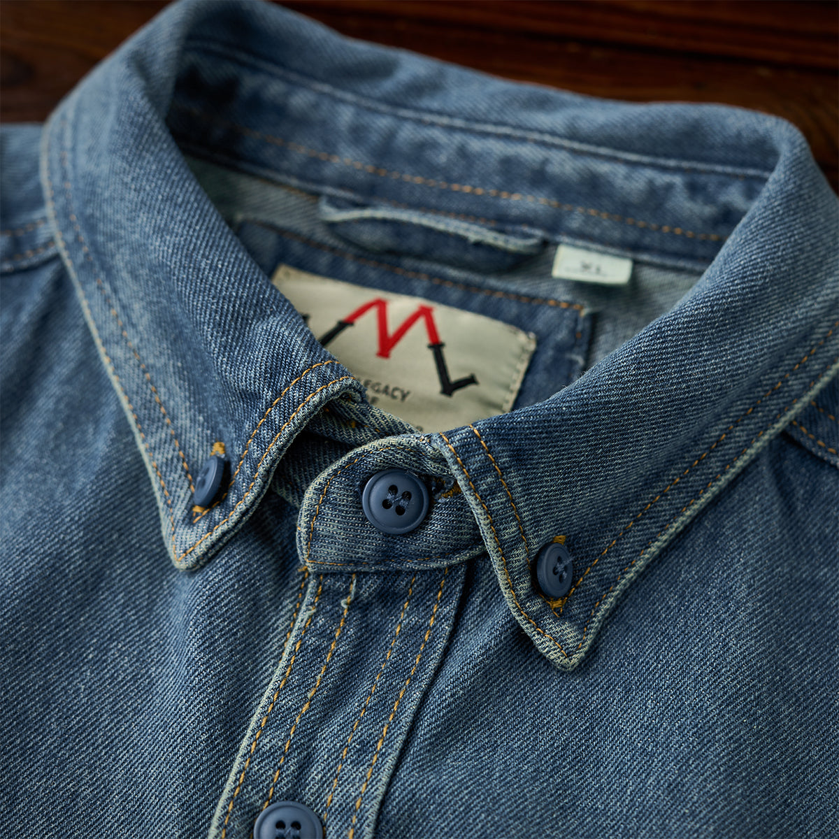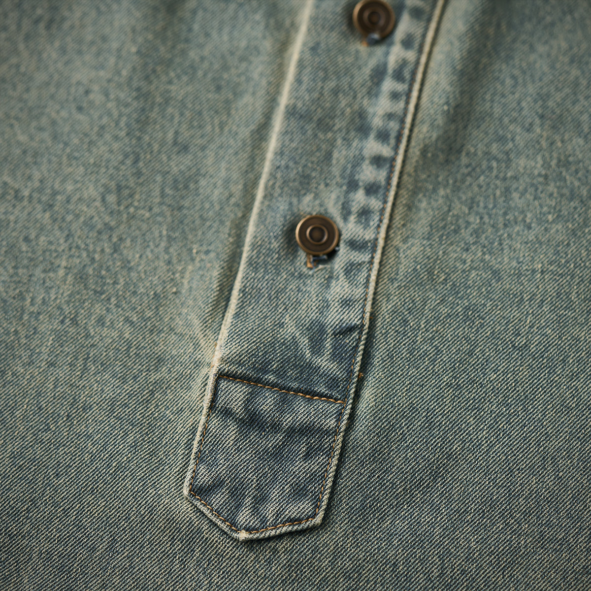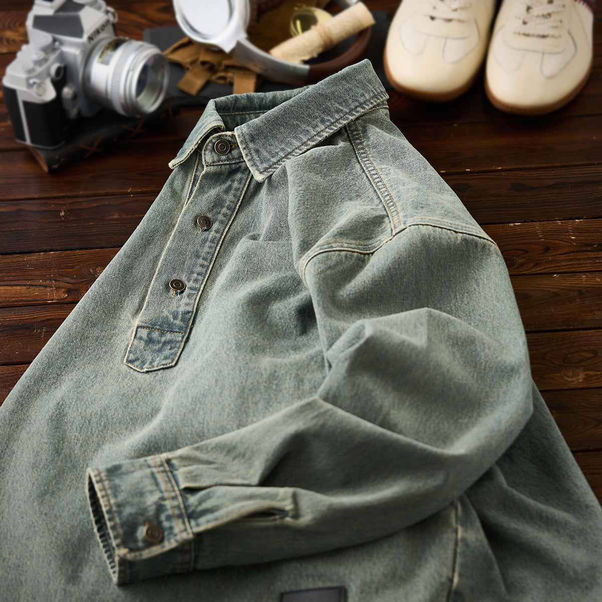 ユーズド&ウォッシュ加工 ハーフボタン長袖デニムシャツ