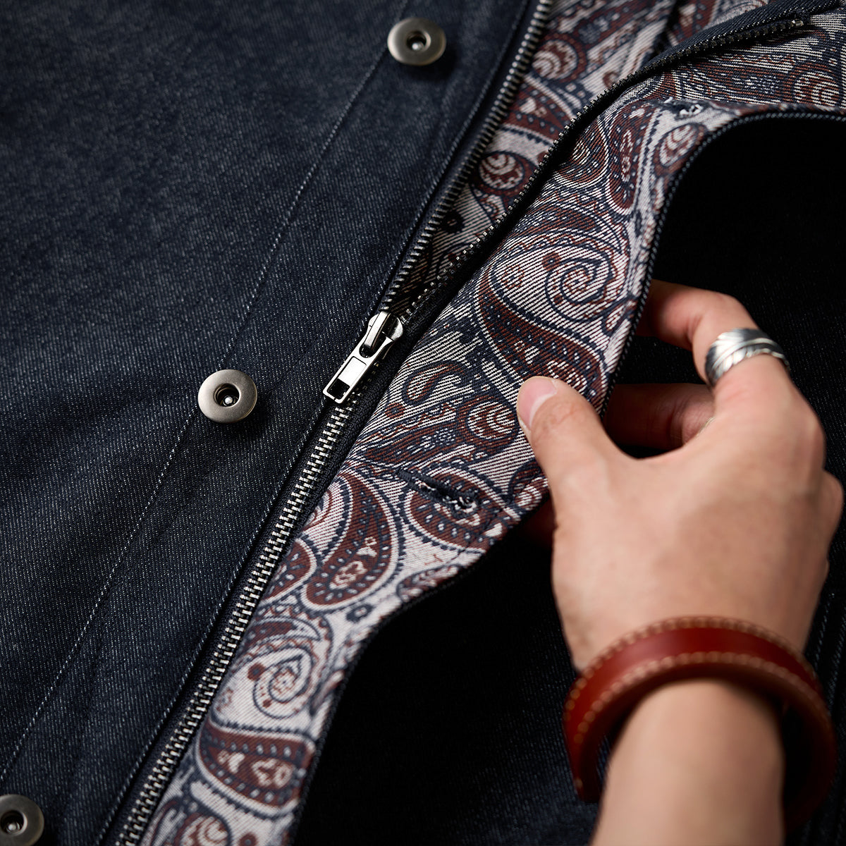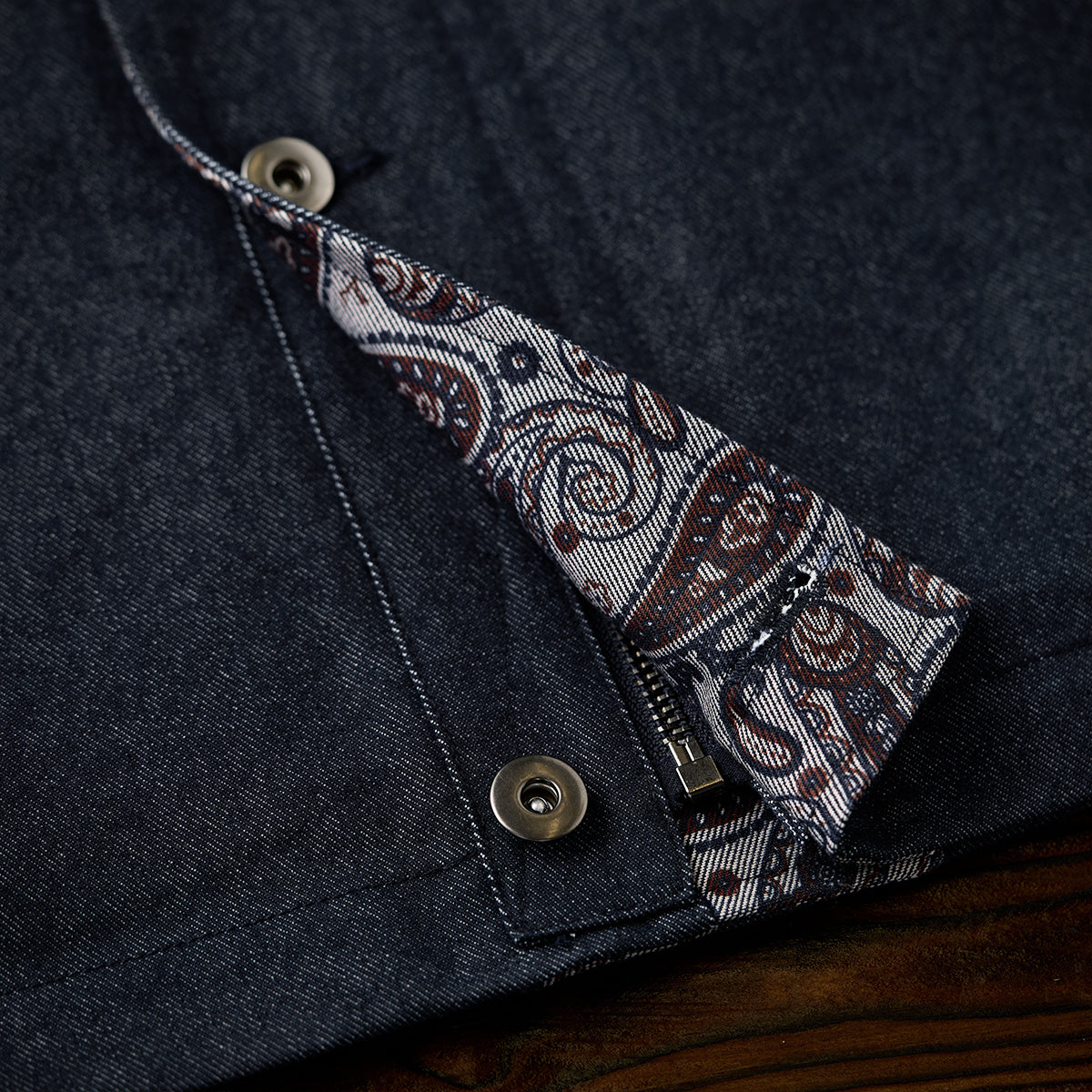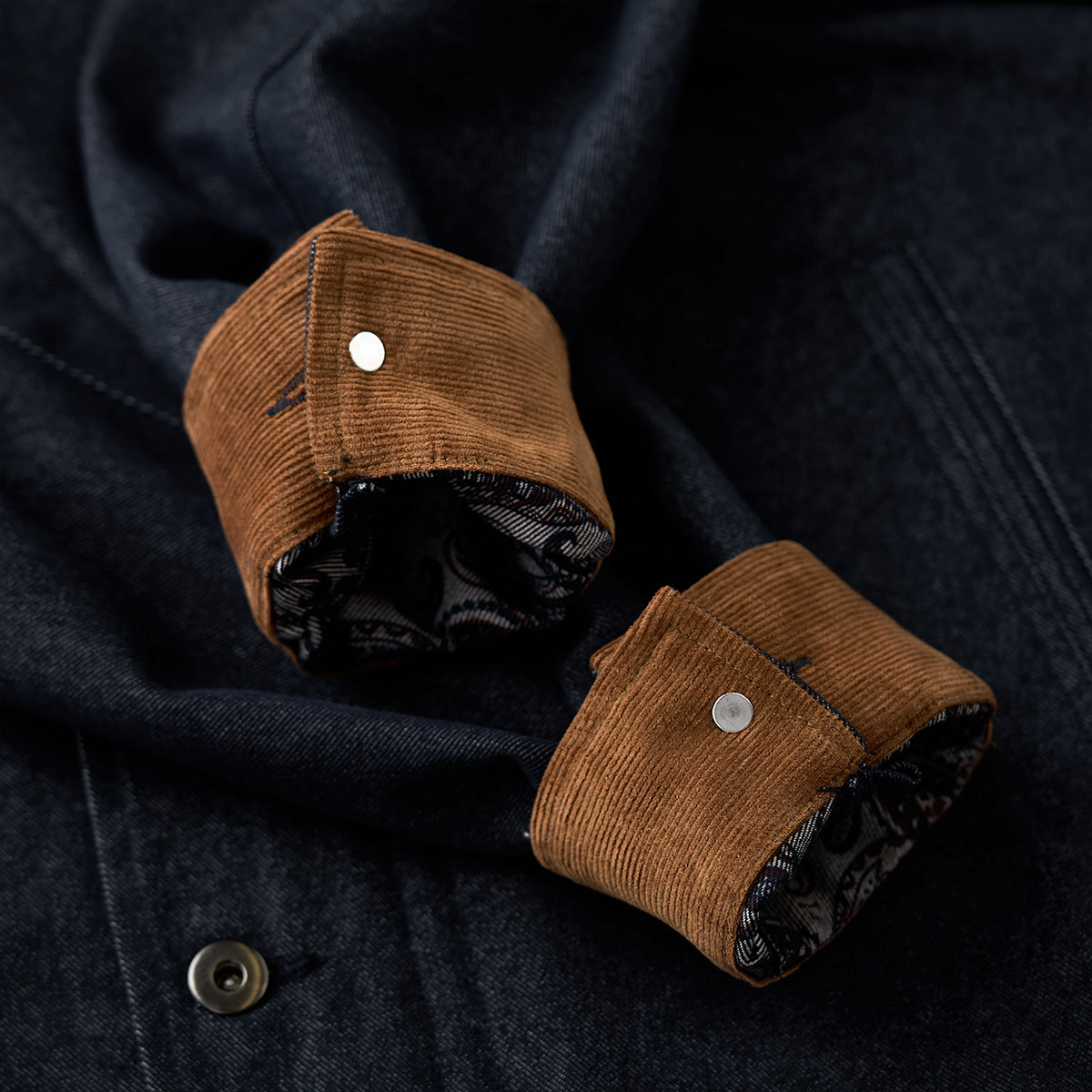 【予約】襟・袖裏コーデュロイ 「KaraKu」刺繡入り裏ペイズリー総柄デニムジャケット