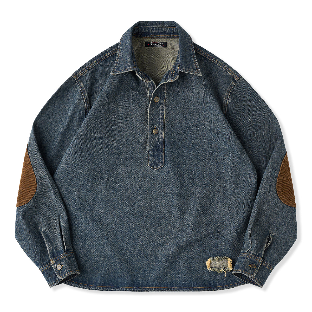 コーデュロイ肘パッチ フリンジパッチワンポイント入りハーフボタンデニムプルオーバー
