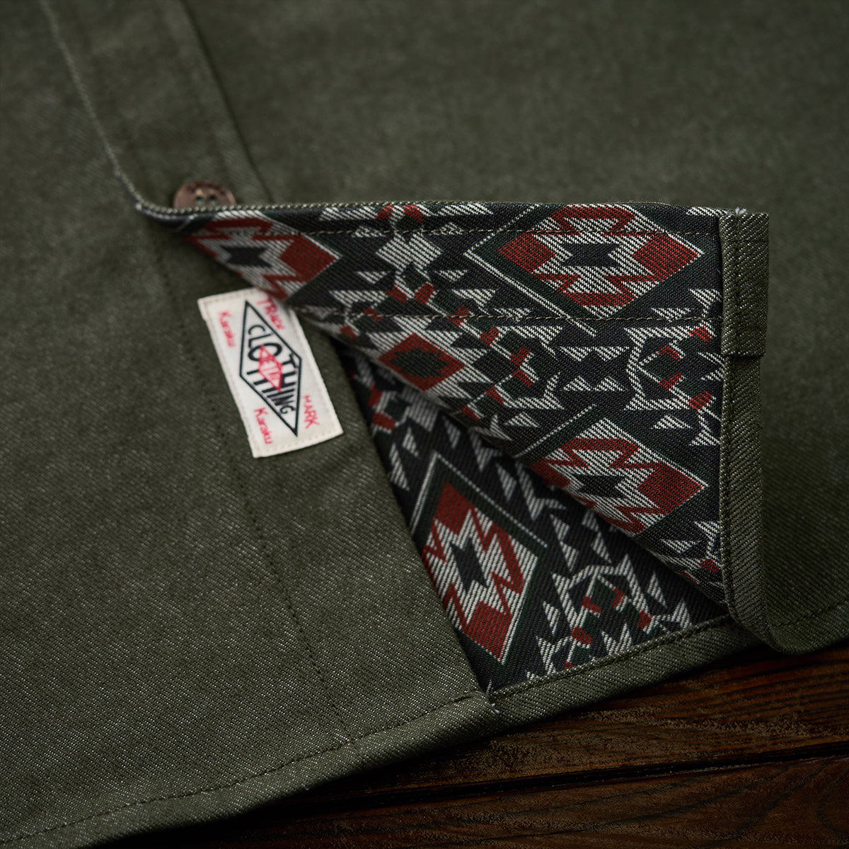 「Karaku」刺繍入り 赤ヒモ付き裏地エスニック調プリントデニムシャツ