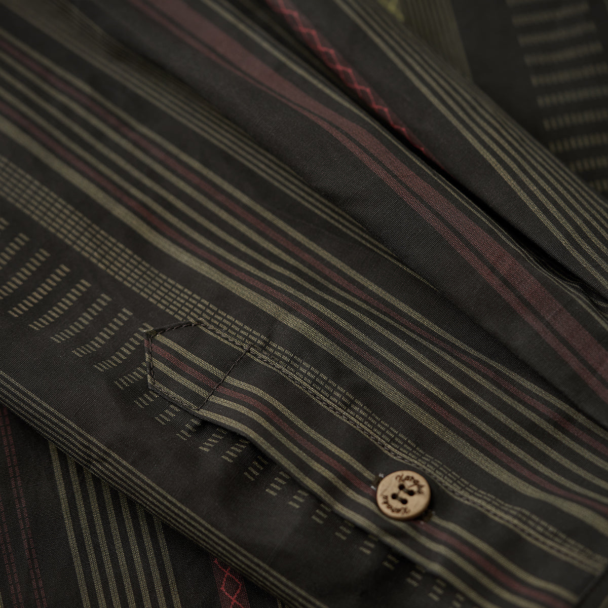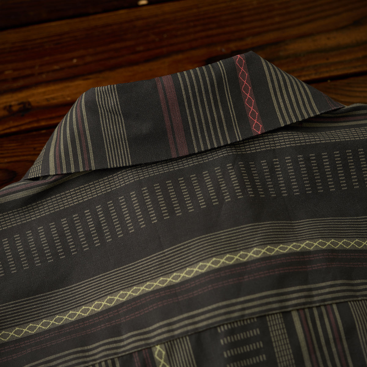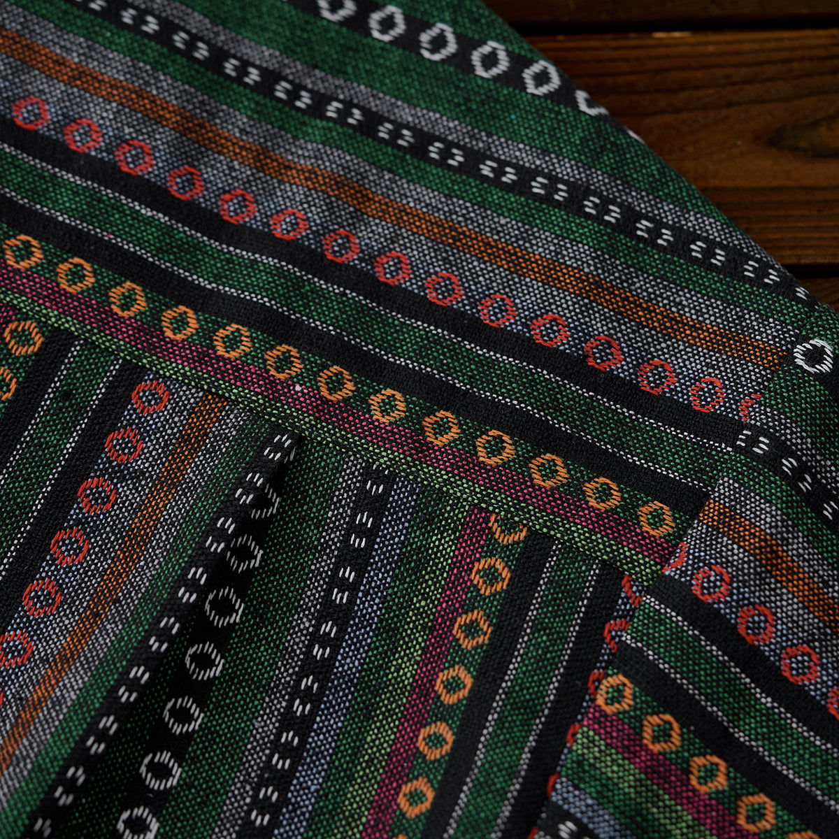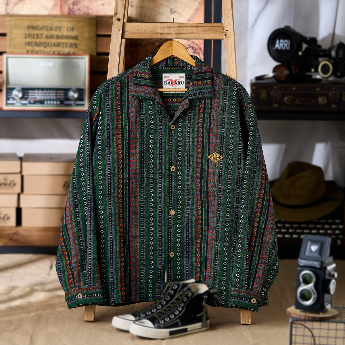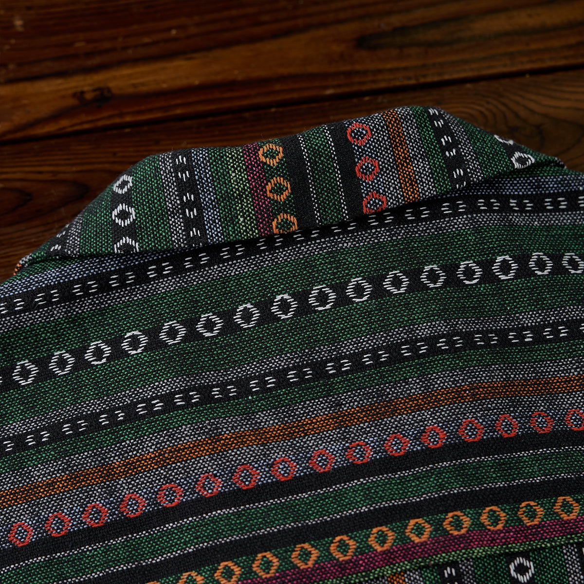 【予約】リネン混 エスニック調ジャカード織りカラフルストライプ柄オープンカラーシャツ