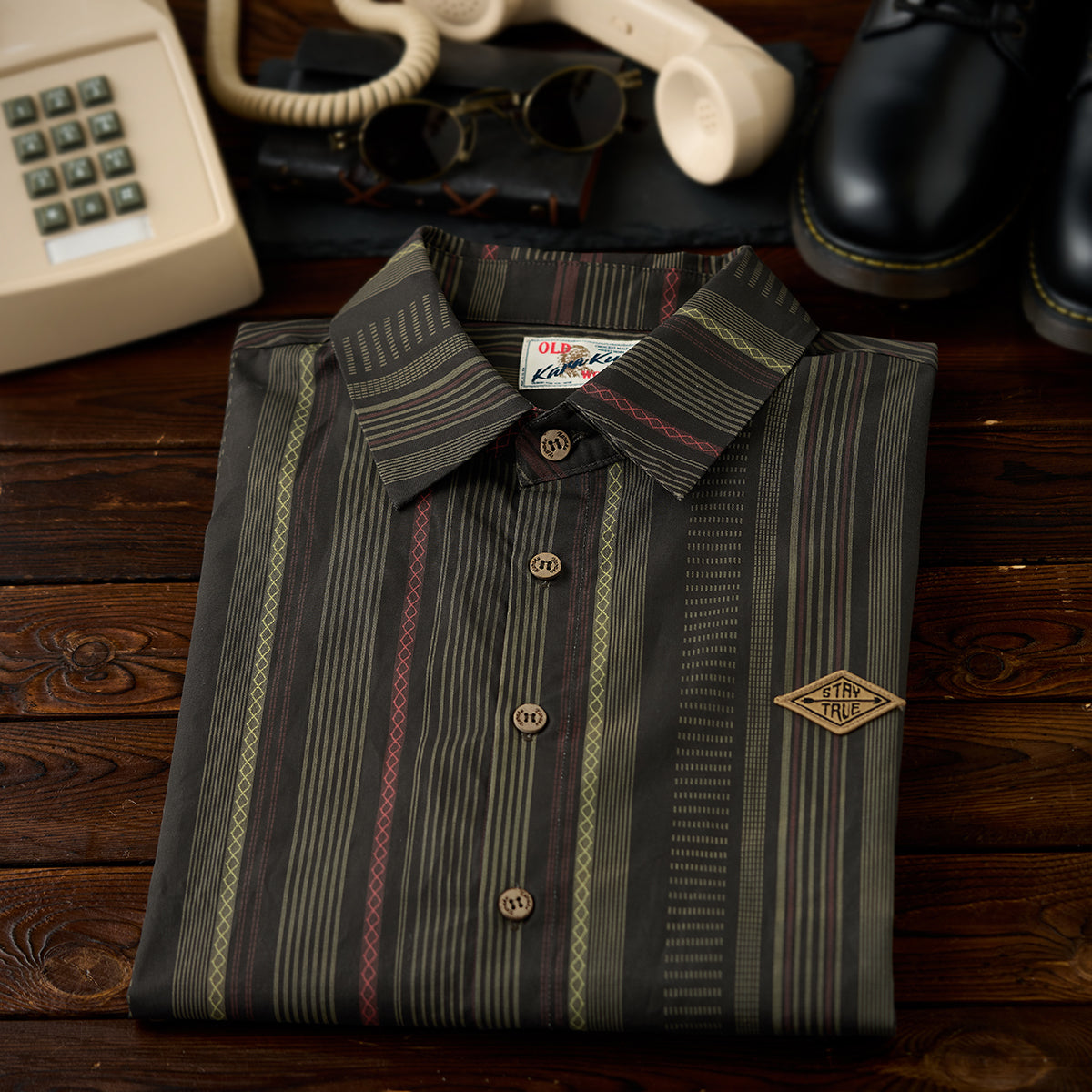 【予約】「STAY TRUE」刺繍ワッペン リネン混マルチストライプ柄キューバカラーシャツ
