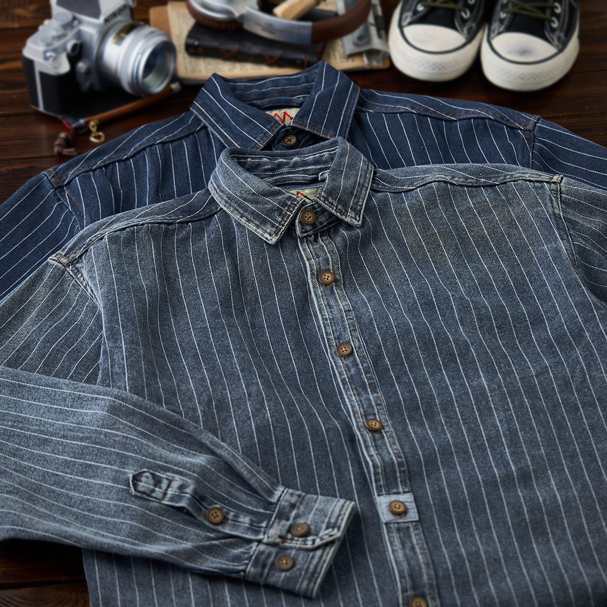 2色展開 WABASHウォバッシュストライプデニムシャツ