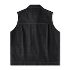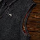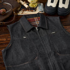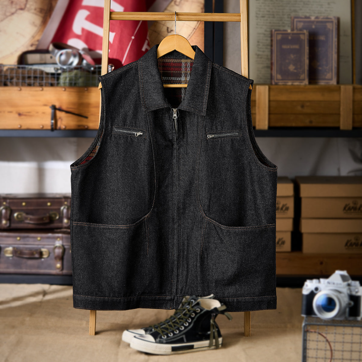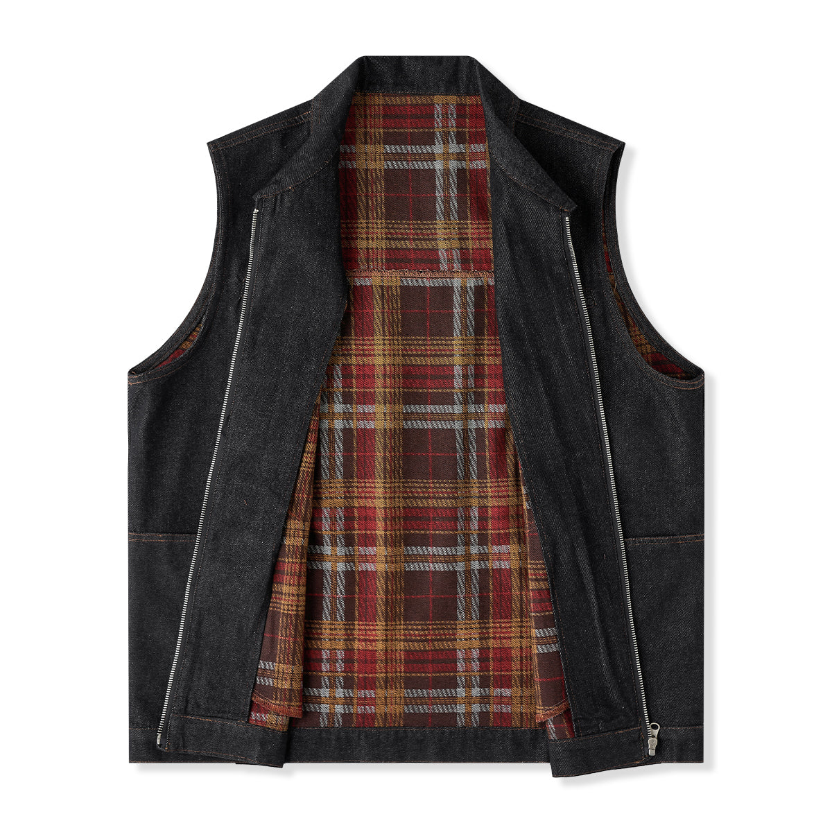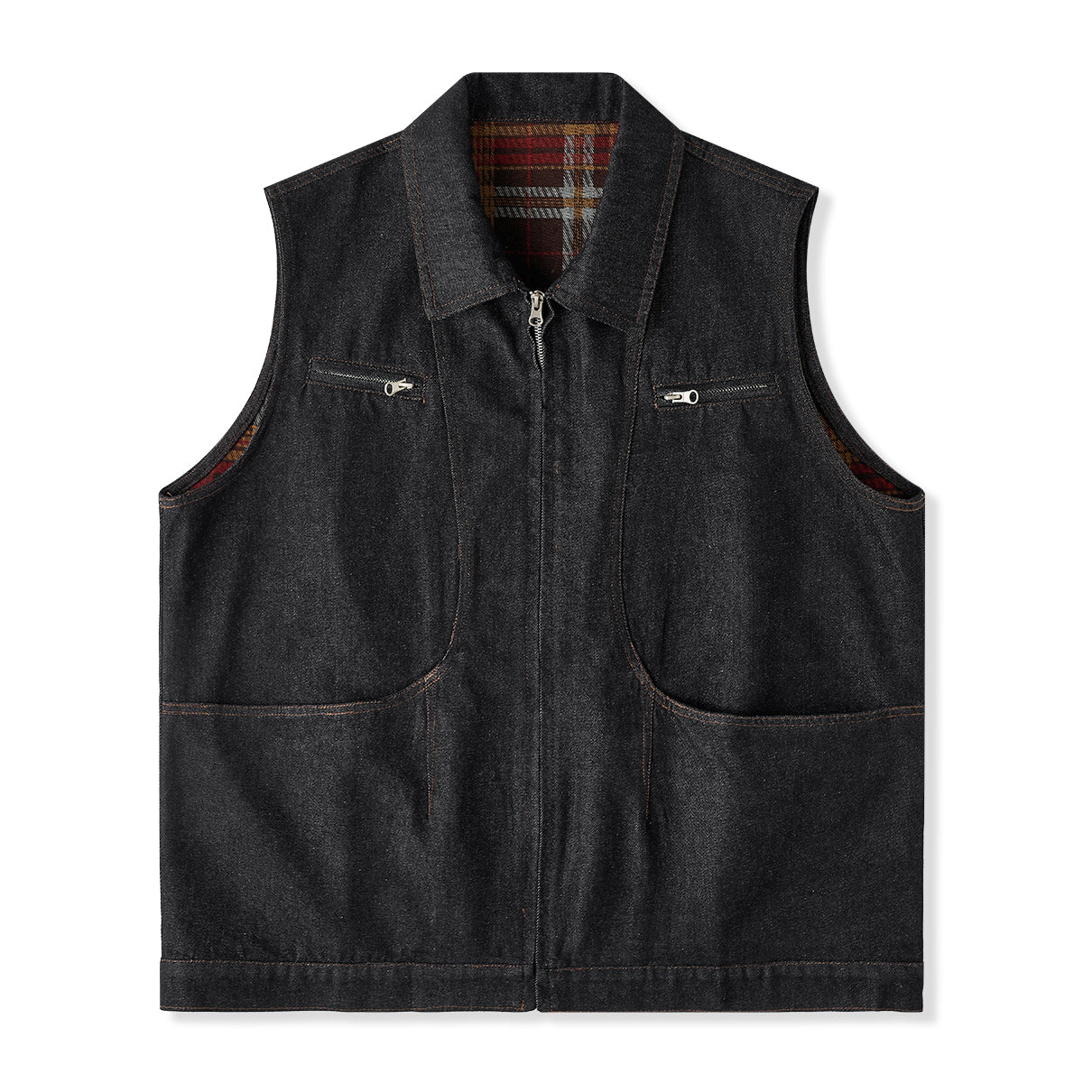 裏チェック柄 マルチポケット付きウォッシュド加工デニムベスト