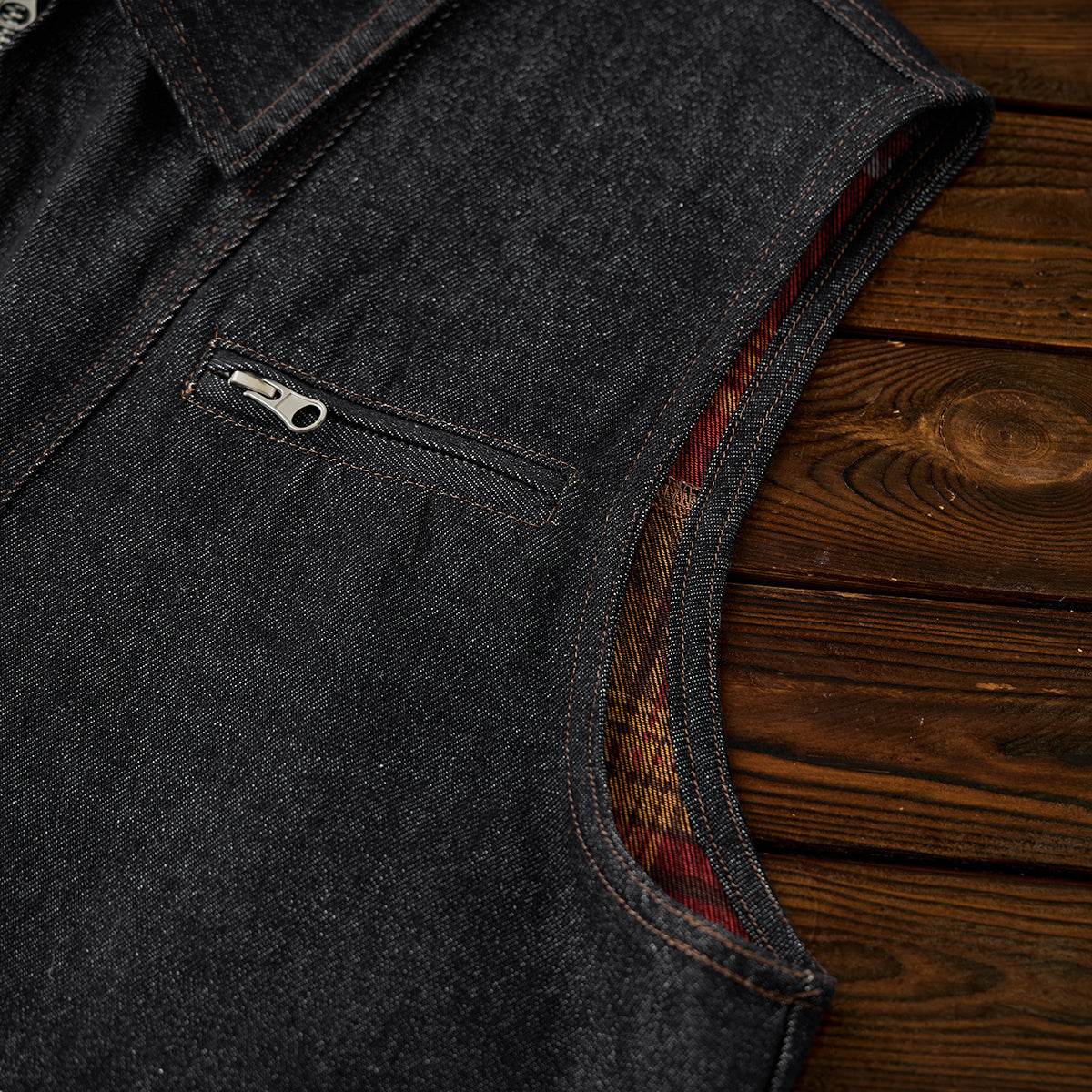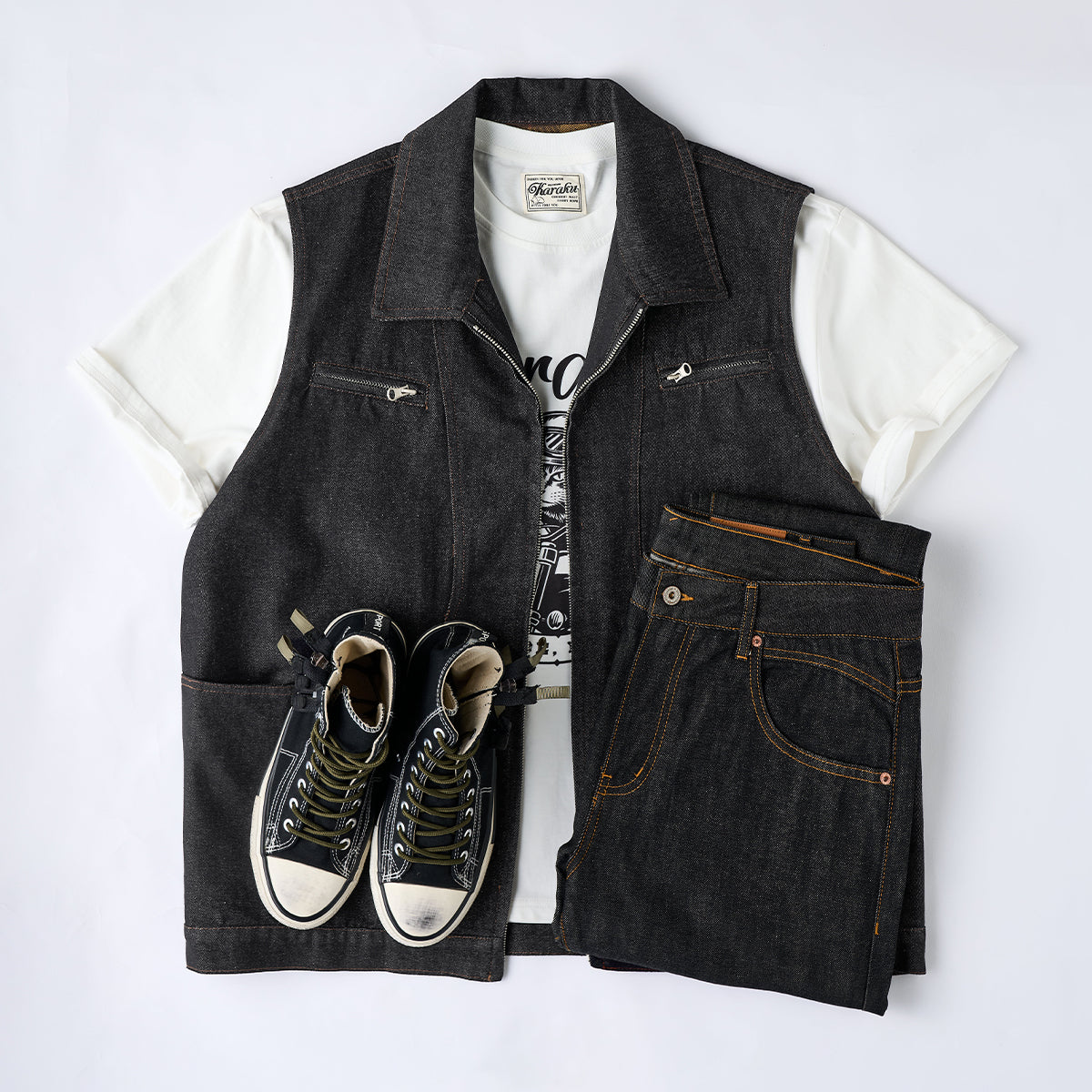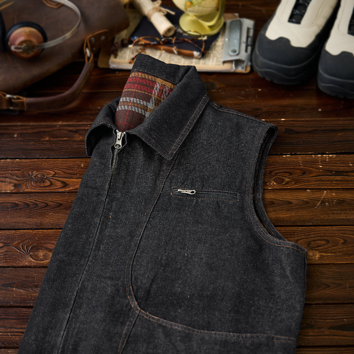ヴィンテージ感あふれるウォッシュド加工を施した、デニムベスト。程よく色落ちしたデニム生地がこなれた雰囲気を演出し、ワークやアウトドアテイストを感じさせる一着に仕上げました。裏地にはチェック柄を採用し、着脱時や動いたときにさりげなく覗く配色がアクセントとなり、ディテールまでこだわりを感じさせます。フロントには実用性の高いマルチポケットを多数配置し、小物の収納にも便利な機能的デザイン。シャツやTシャツの上から気軽に羽織るだけで、コーディネートに立体感と存在感をプラスしてくれます。カジュアルスタイルはもちろん、ワークテイストやアウトドアスタイルにも相性の良い、デイリーに活躍するデニムベストです。