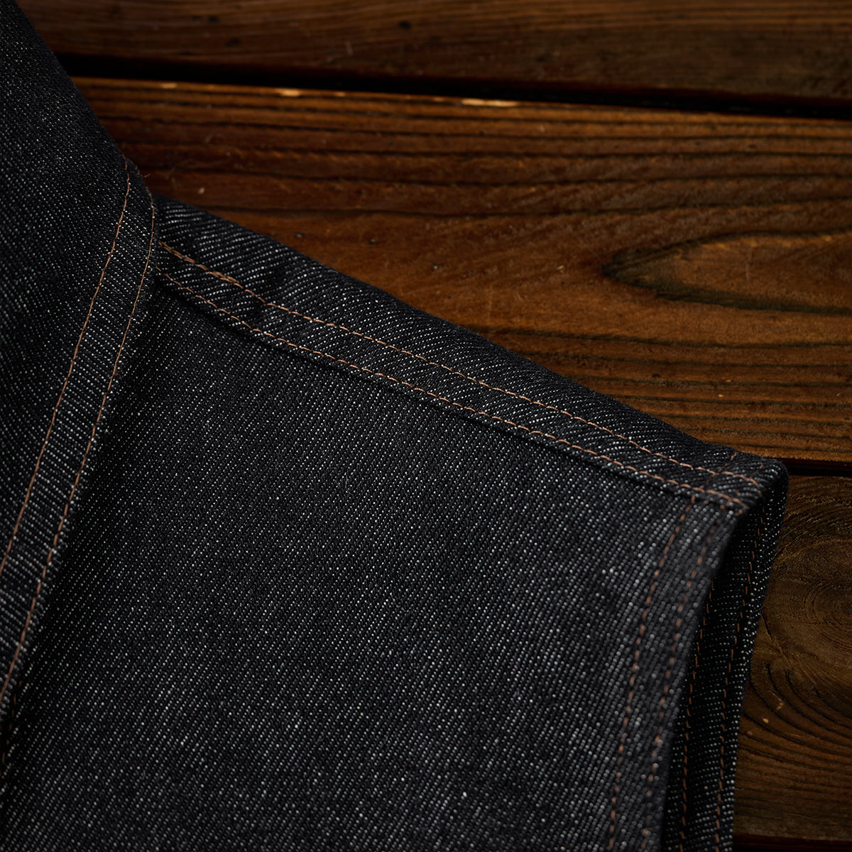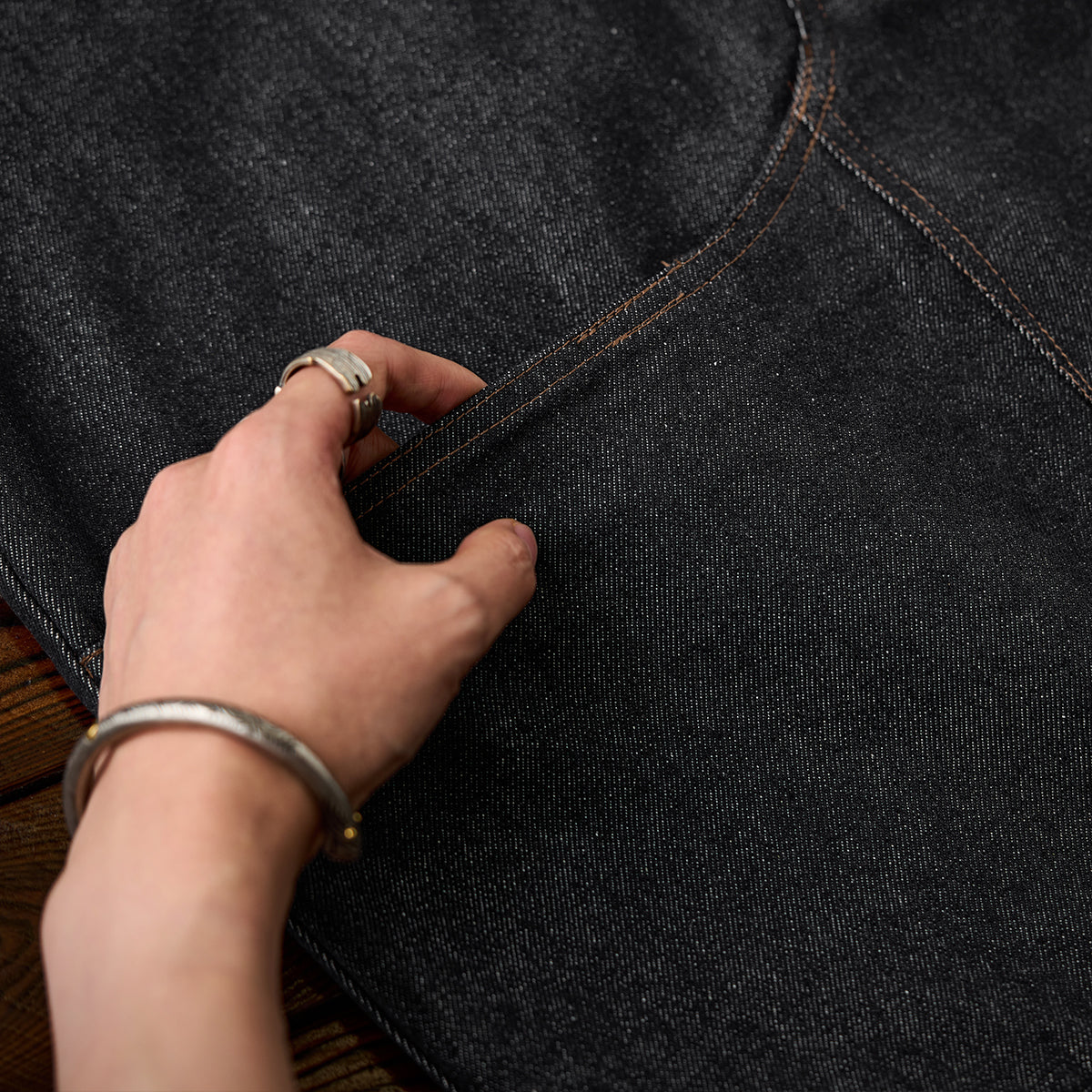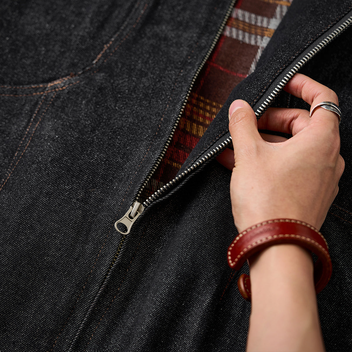 表地には耐久性と軽さを兼ね備えたデニム素材を使用し、裏地には肌触りのよいコットン素材をあしらうことで、快適な着心地と保温性を両立。