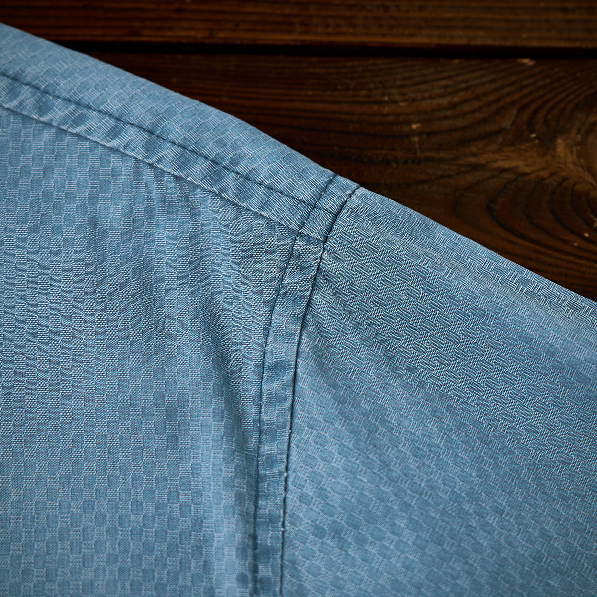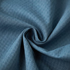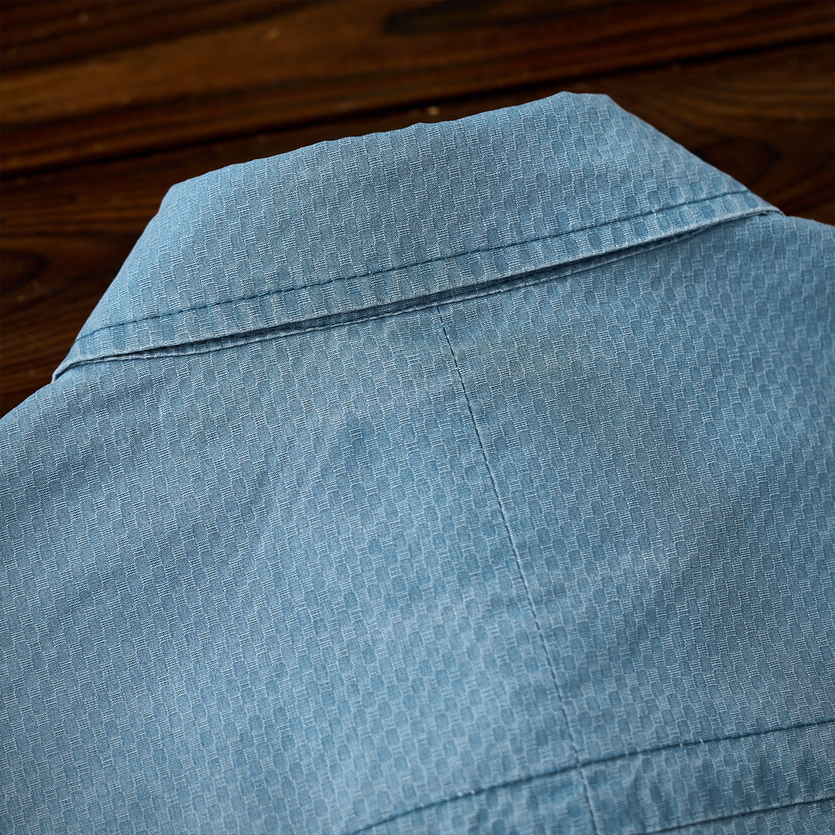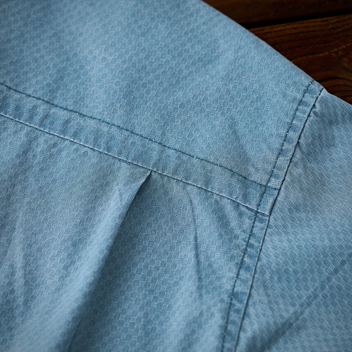 ジャカード織りの特徴的な細かい幾何学パターンが全体に施されており、生地に高級感と独自性を与えています。明るいブルーの色味は清潔感があり、カジュアルとフォーマルの中間的な使い方が可能です。