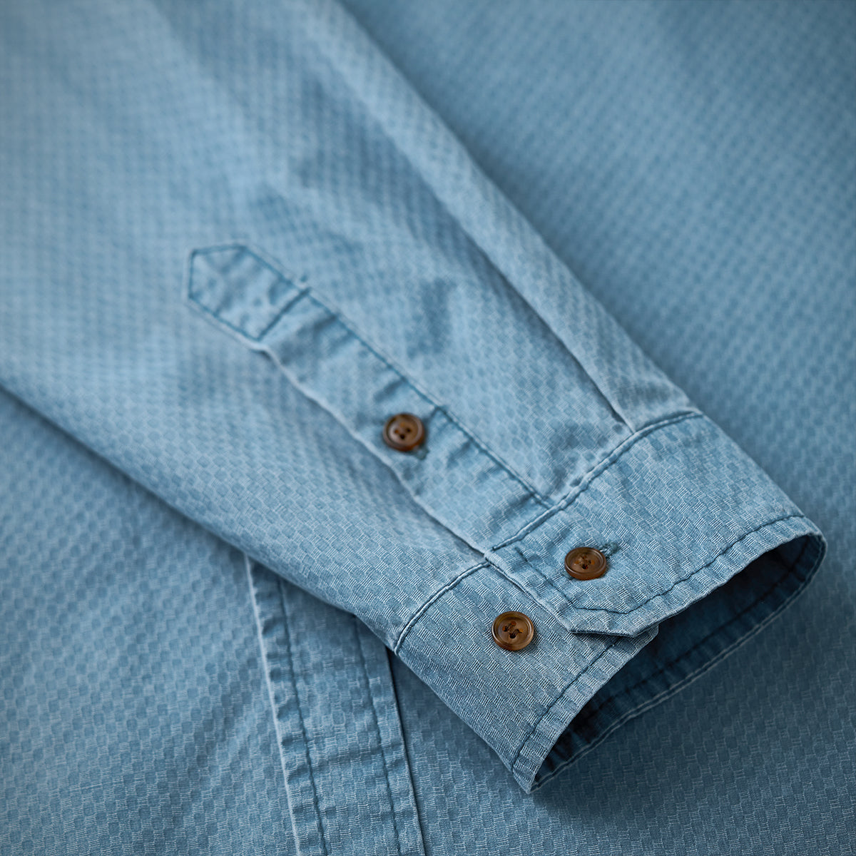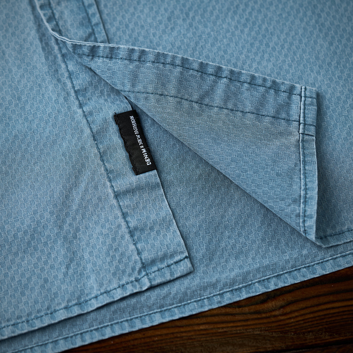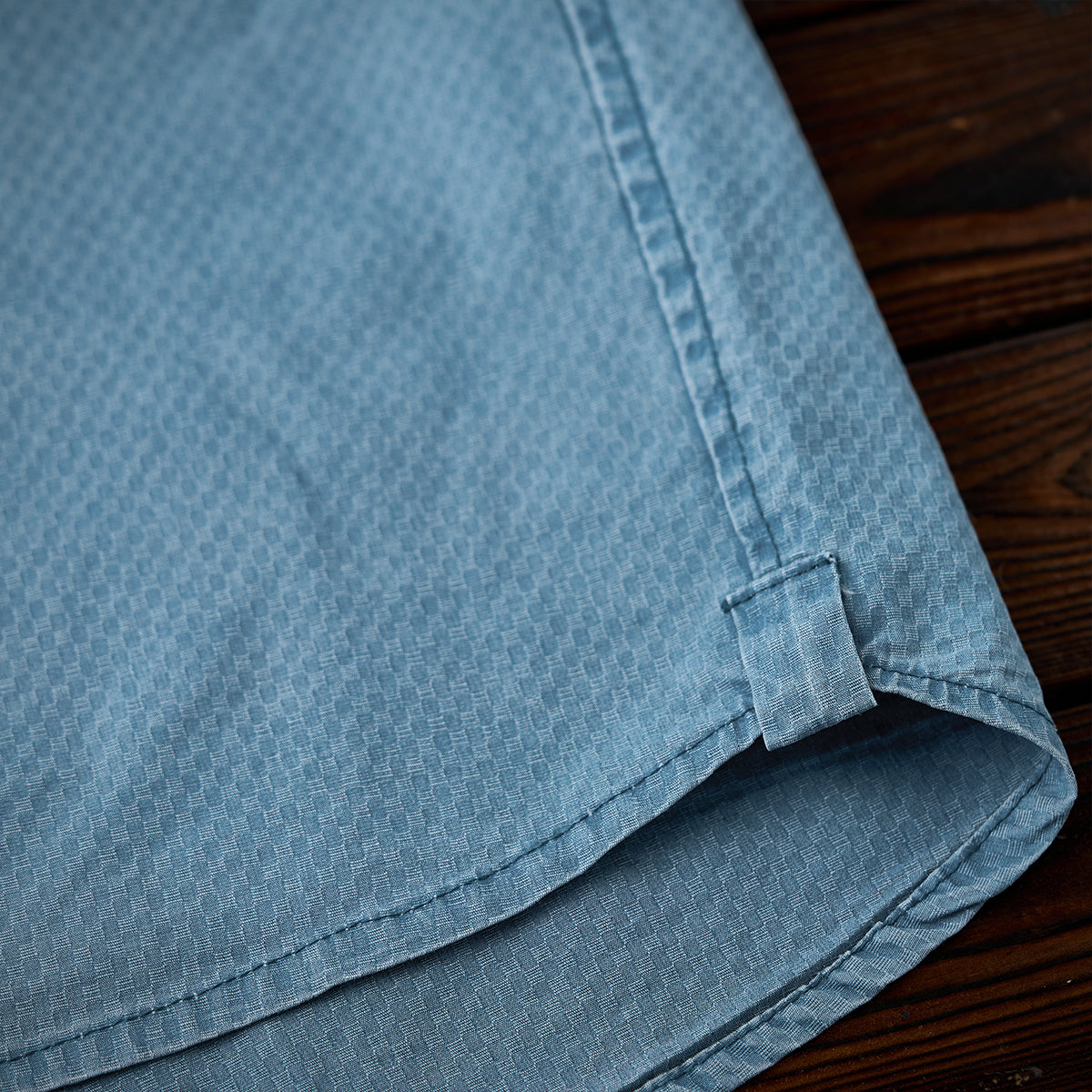 ジャカード織りの特徴的な細かい幾何学パターンが全体に施されており、生地に高級感と独自性を与えています。明るいブルーの色味は清潔感があり、カジュアルとフォーマルの中間的な使い方が可能です。