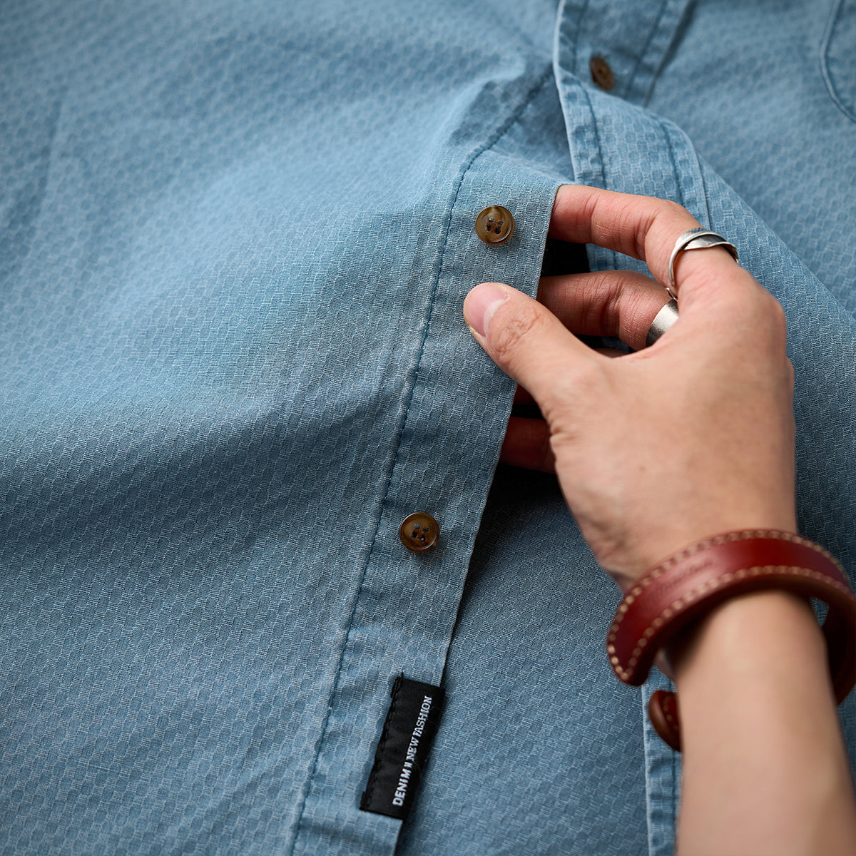ウッド調のボタンがアクセントとなり、ナチュラルでほのかなヴィンテージ感を演出します。片側に付けられたポケットは実用性とデザイン性を兼ね備えています。ボタン付きで物が落ちにくい仕様です。