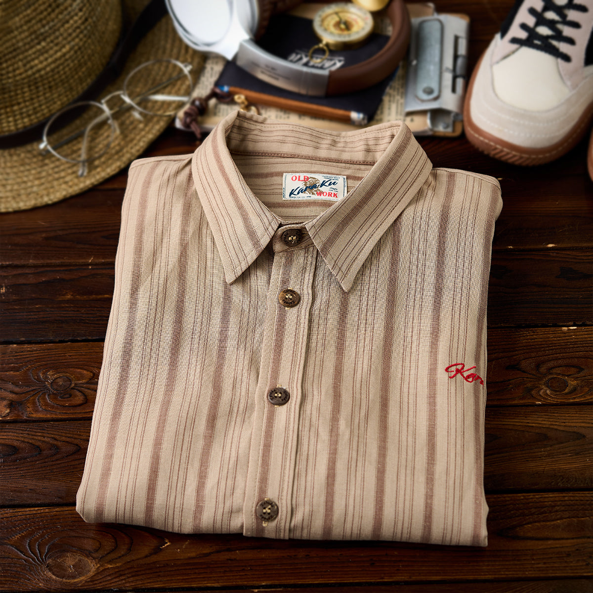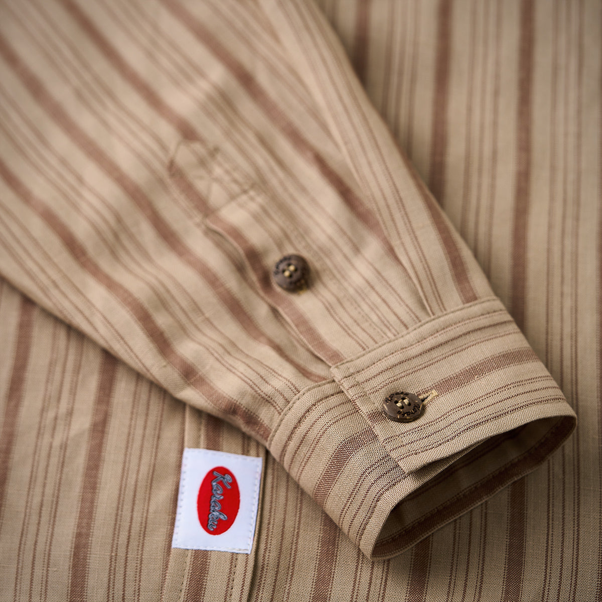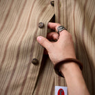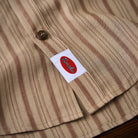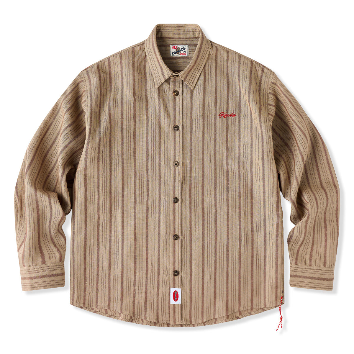 左胸に「STAY TRUE」刺繍ワッペンが付いており、シンプルながらもユニークなポイントになっています。ナチュラルなウッド調のボタンが使われており、全体のクラシックな雰囲気を強調しています。裾部分に付けられた紅白ひもは、ユニークで遊びごころのある要素を加えています。