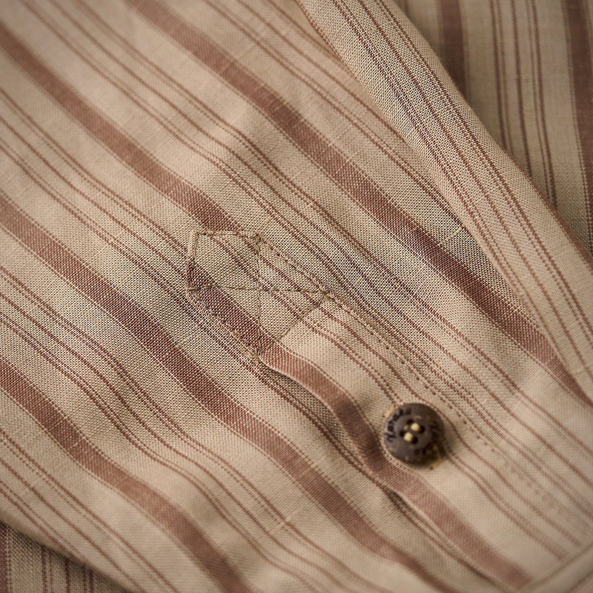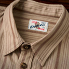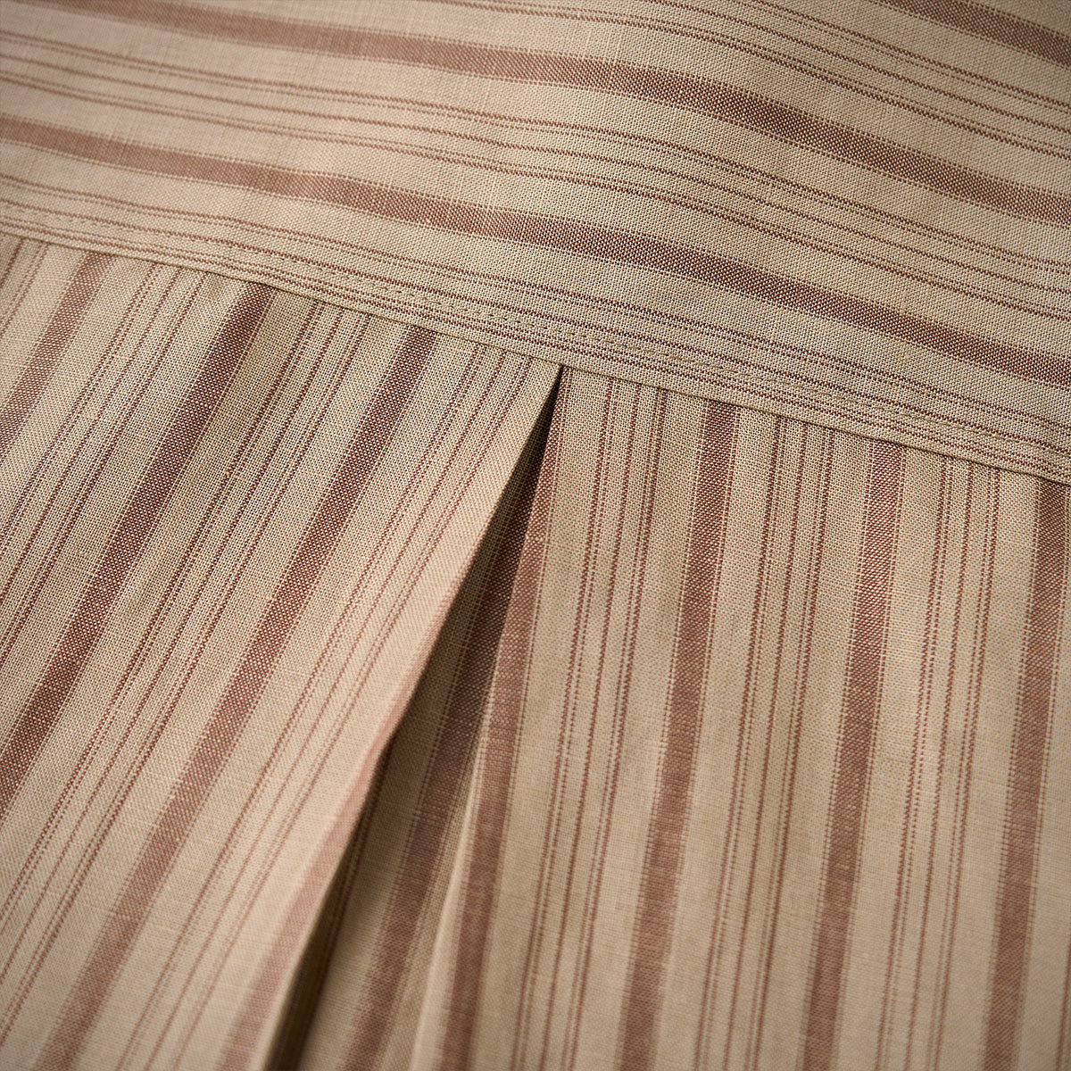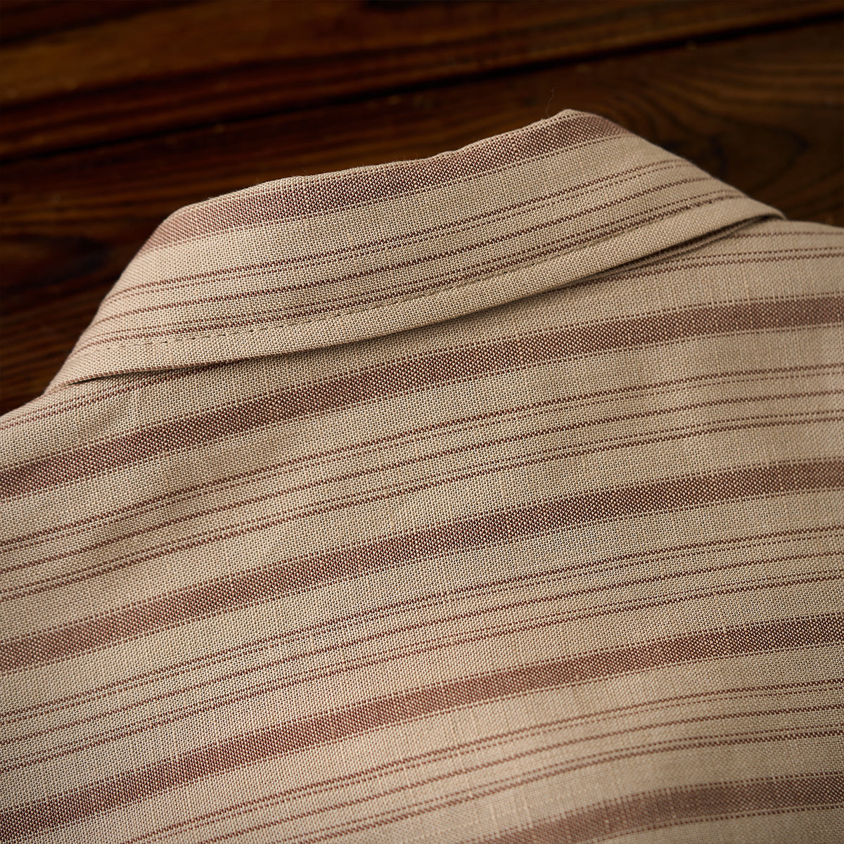 カーキ系を基調とした落ち着いた色味のストライプが特徴で、クラシックでヴィンテージ感のあるデザインです。ストライプの太さがランダムに配置されており、視覚的なリズムかんを生み出しています。