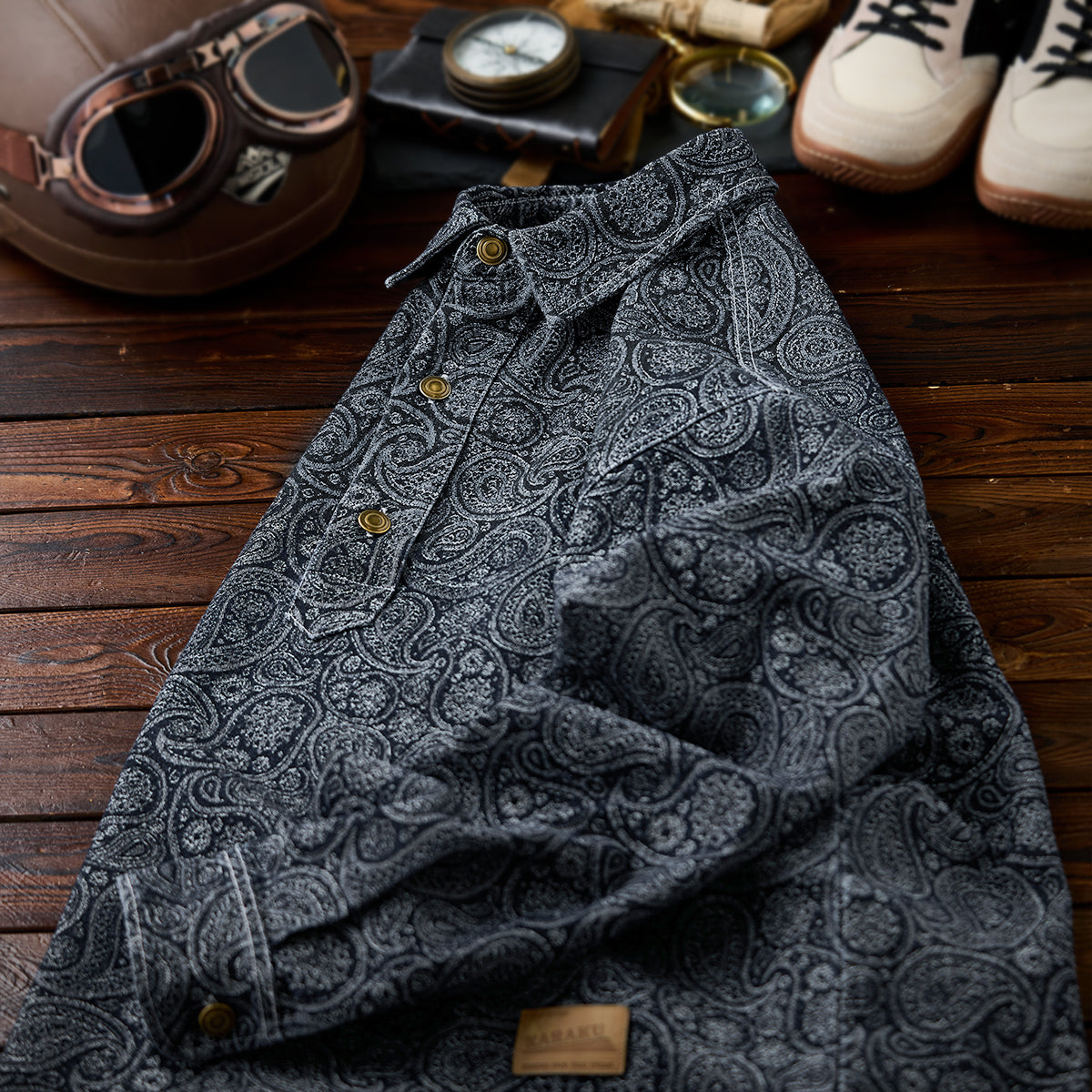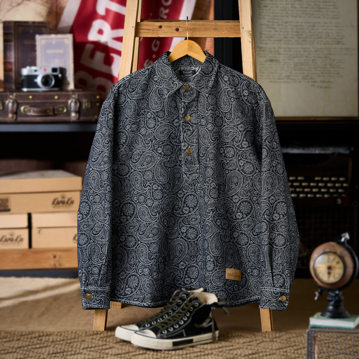 クラシカルなペイズリー柄を、ジャカード織りで立体的に表現したデニムプルオーバーシャツ。プリントでは味わえない、織りならではの奥行きと表情が、シンプルな中に確かな存在感を与えます。フロントはハーフボタン仕様を採用し、ヴィンテージワークシャツを思わせるクラシックな佇まいに。被りタイプならではのリラックス感がありつつ、首元の開閉で表情の変化も演出できます。一枚で主役になるのはもちろん、インナーとしても程よく映えるデザイン。素材感と柄の奥行きを楽しみたい、大人のためのデニムシャツです。