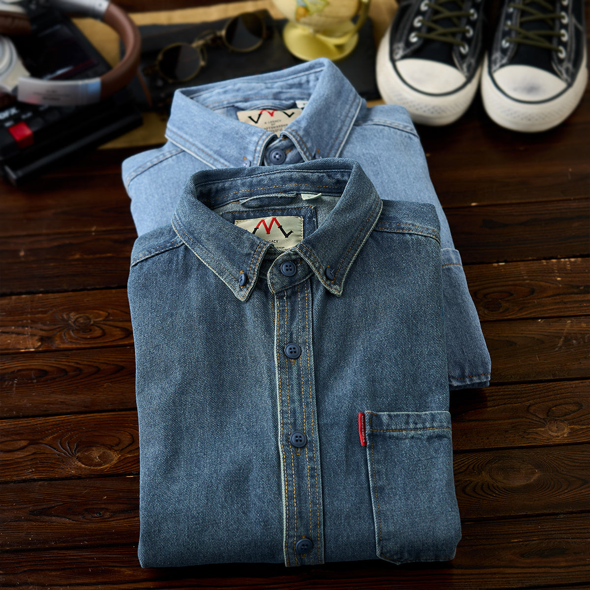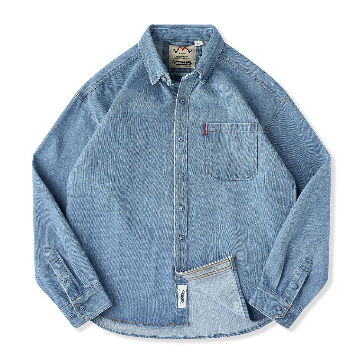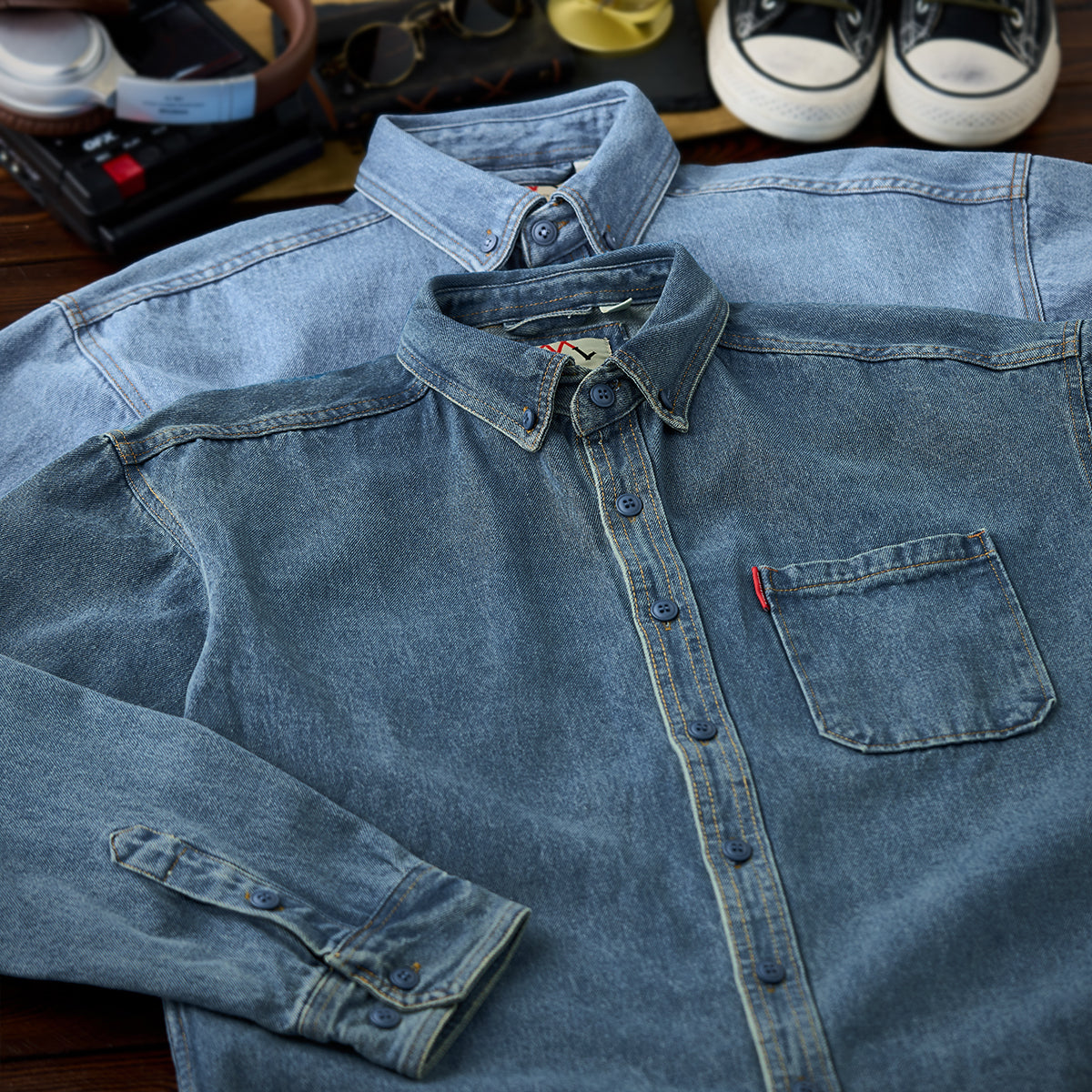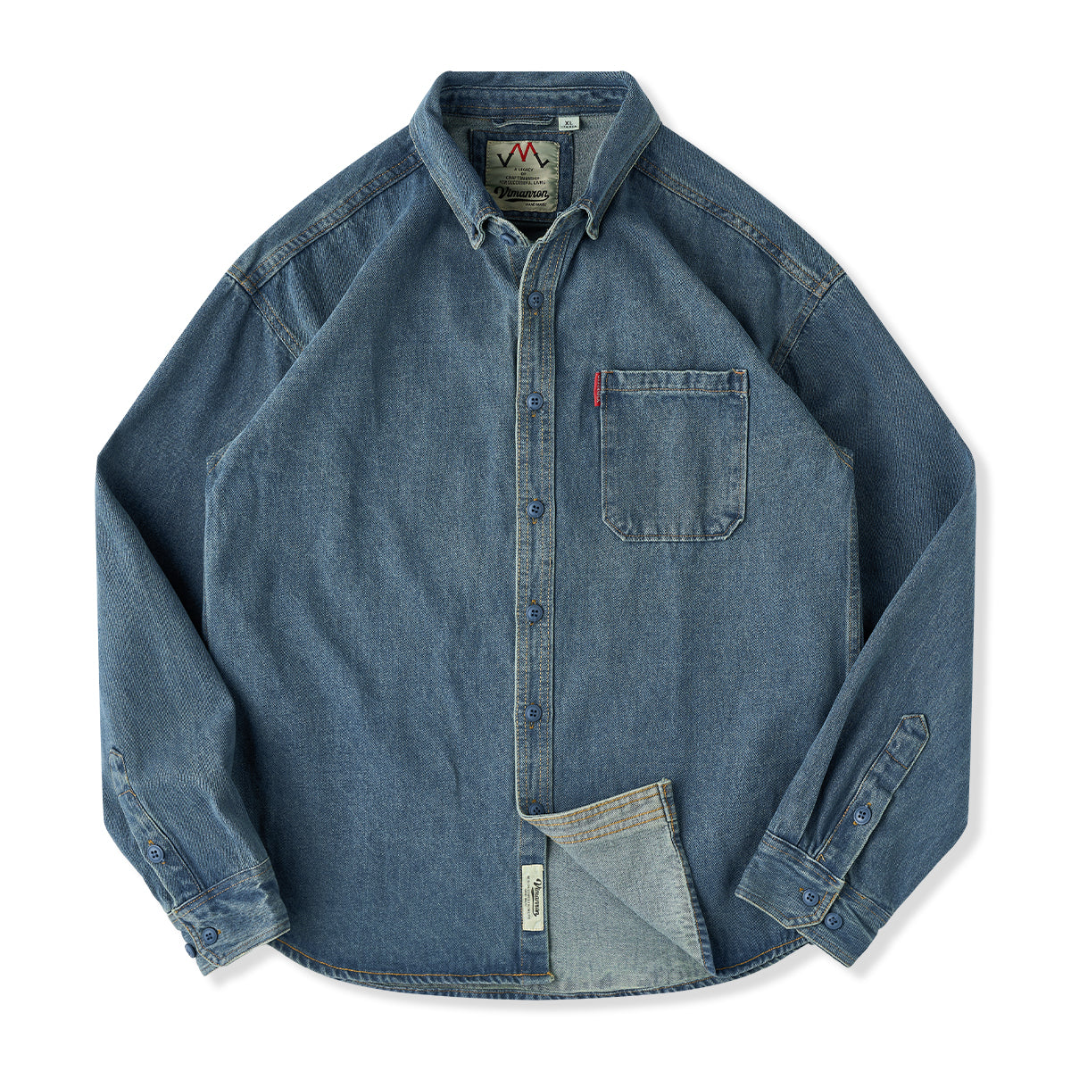 ワークシャツの無骨さに、着こなしやすさを加えたデニムワークシャツ。ウォッシュド加工を施すことで、程よく色落ちしたヴィンテージライクな表情と、初めて袖を通した瞬間から馴染む柔らかな風合いを実現しました。裾は丸みのあるラウンドヘム仕様。一枚で着てもバランスが取りやすく、タックアウトはもちろん、軽く羽織ったスタイルやレイヤードにも対応します。前後差のあるシルエットが、動きのある着こなしを演出します。カラーは雰囲気の異なる2色展開。