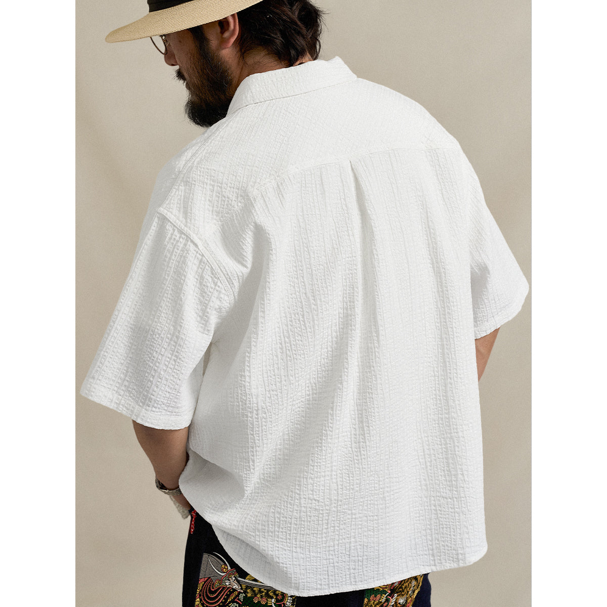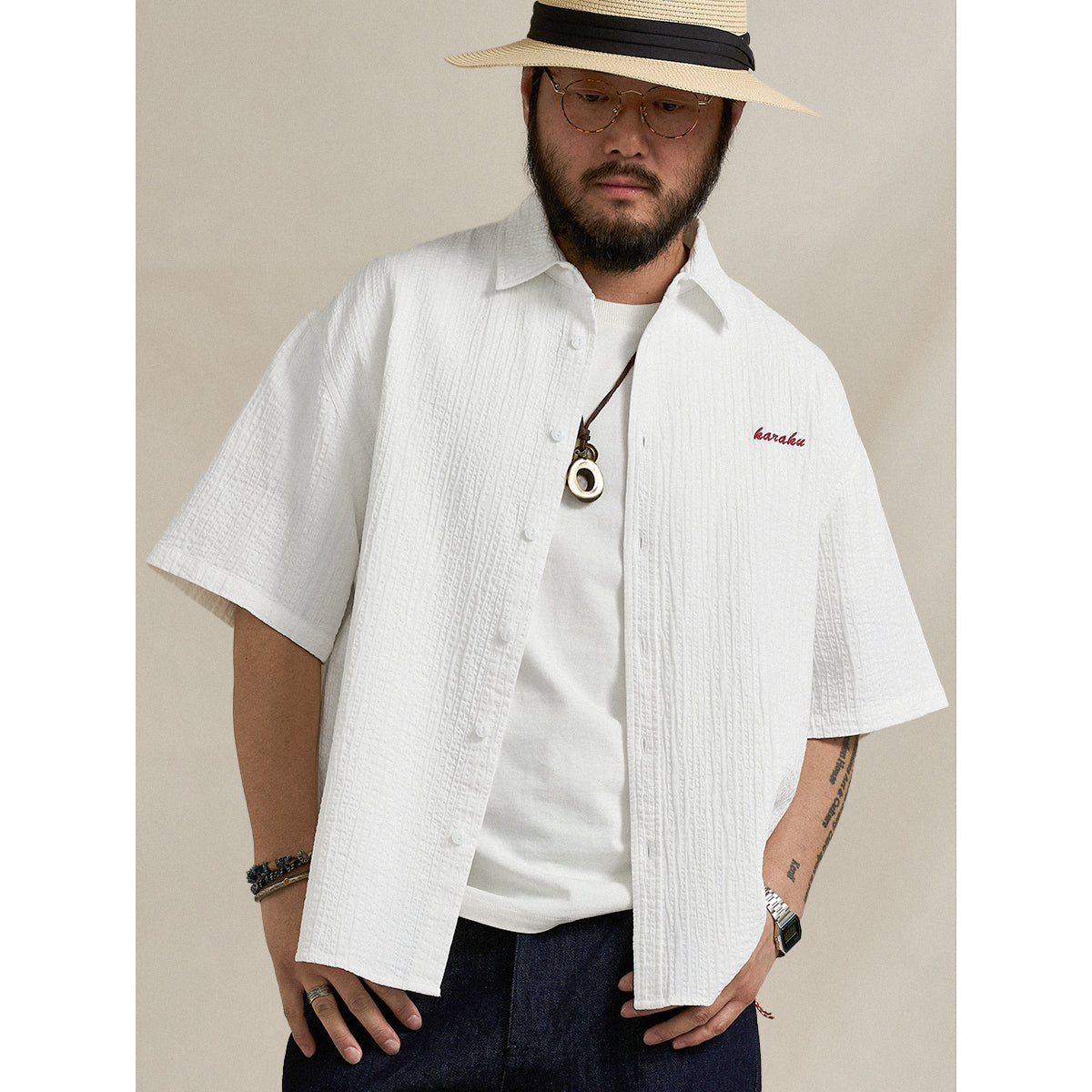 【予約】「Karaku」ワンポイント刺繍入り 赤ヒモ付きテクスチャー半袖シャツ