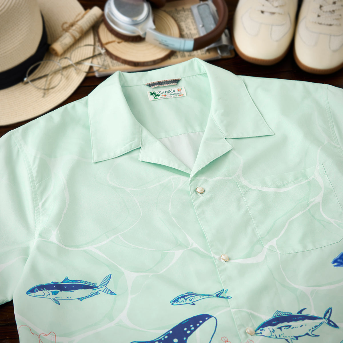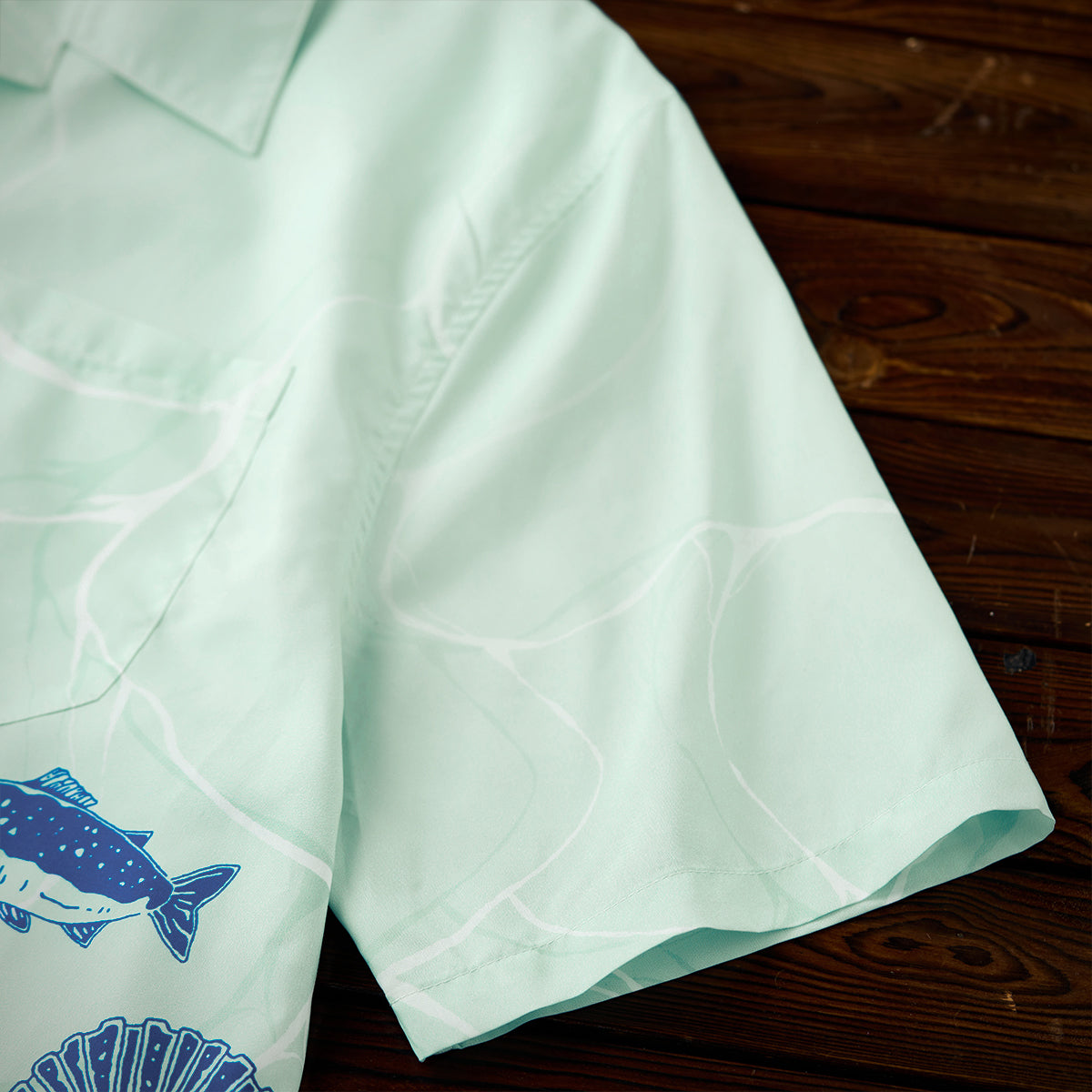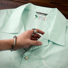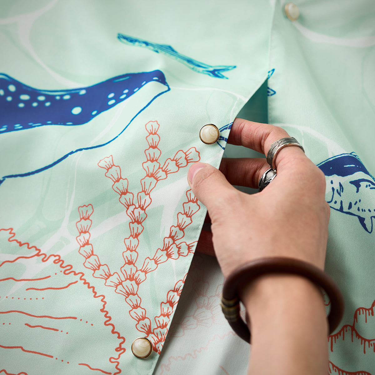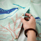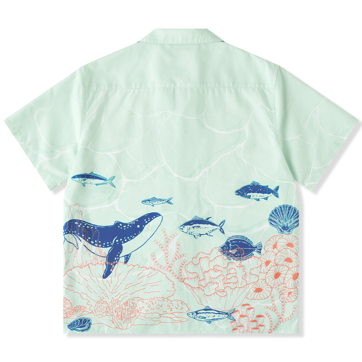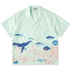 夏の海をそのまま閉じ込めたような、遊び心あふれる一枚。ブルーオレンジのコントラストラインで描かれたクジラやマグロ、サンゴ、貝殻などの海洋生物が、まるで海中を行進するパレードのようにリズミカルに広がる総柄デザインです。ベースには、涼やかな浅ミントグリーンを採用。そこに白い水波紋のような模様を重ねることで、海底に差し込む光の揺らめきを思わせる、透明感のある表情を演出しました。リラックス感のあるシルエットとオープンカラー仕様で、肩の力を抜いた夏の装いを演出します。リゾート感のある開放的な雰囲気をまといながら、街でも自然に映えるデザイン。