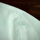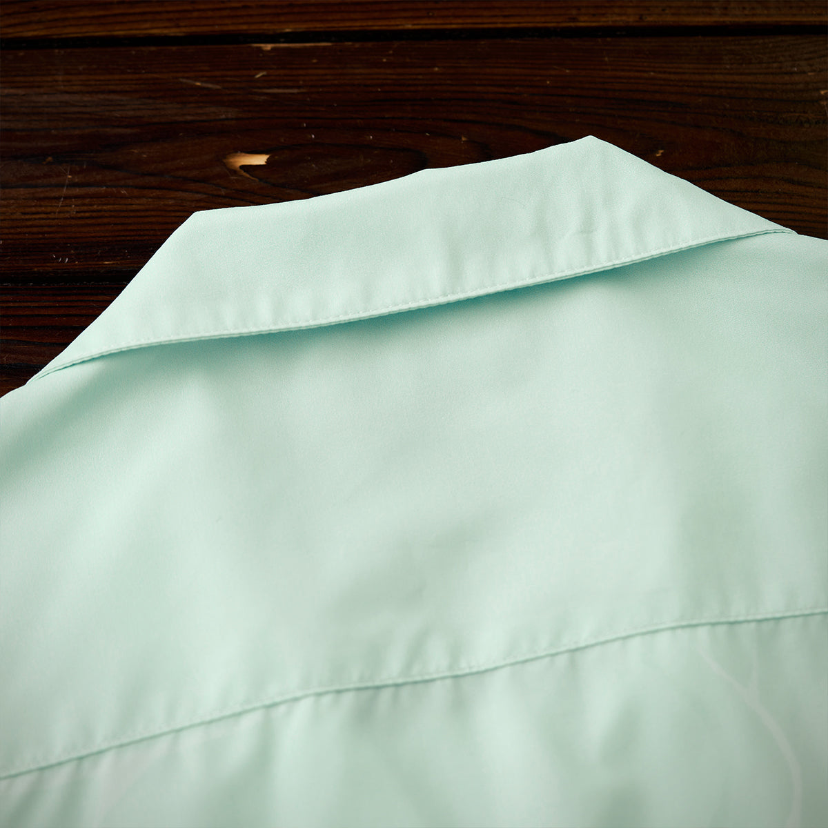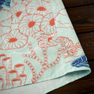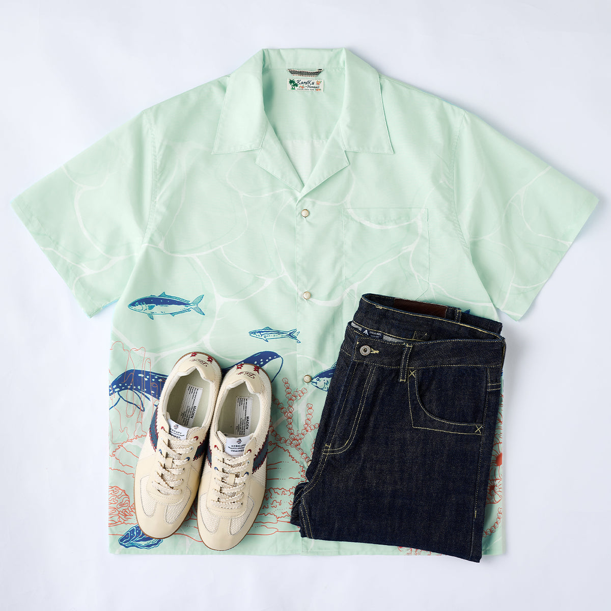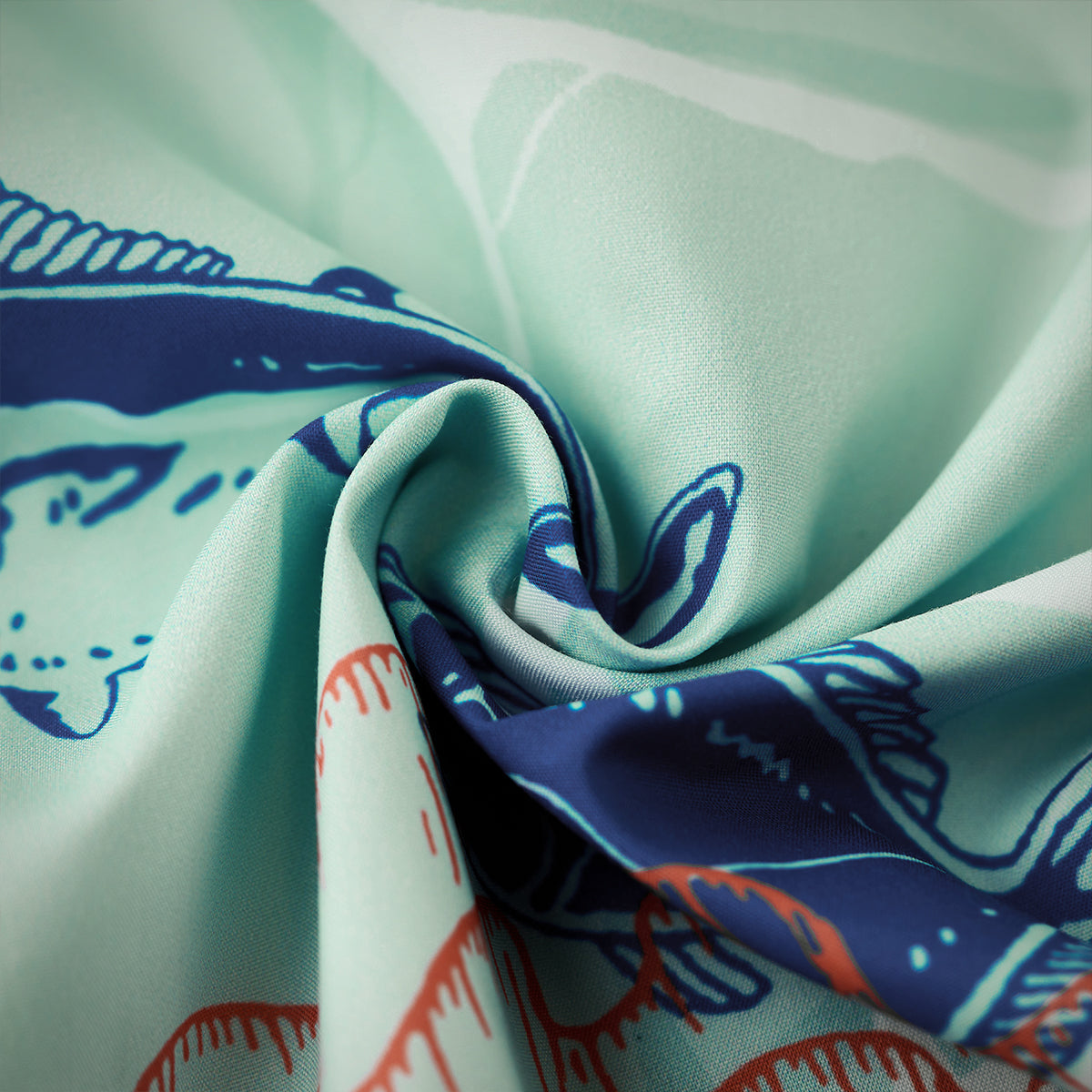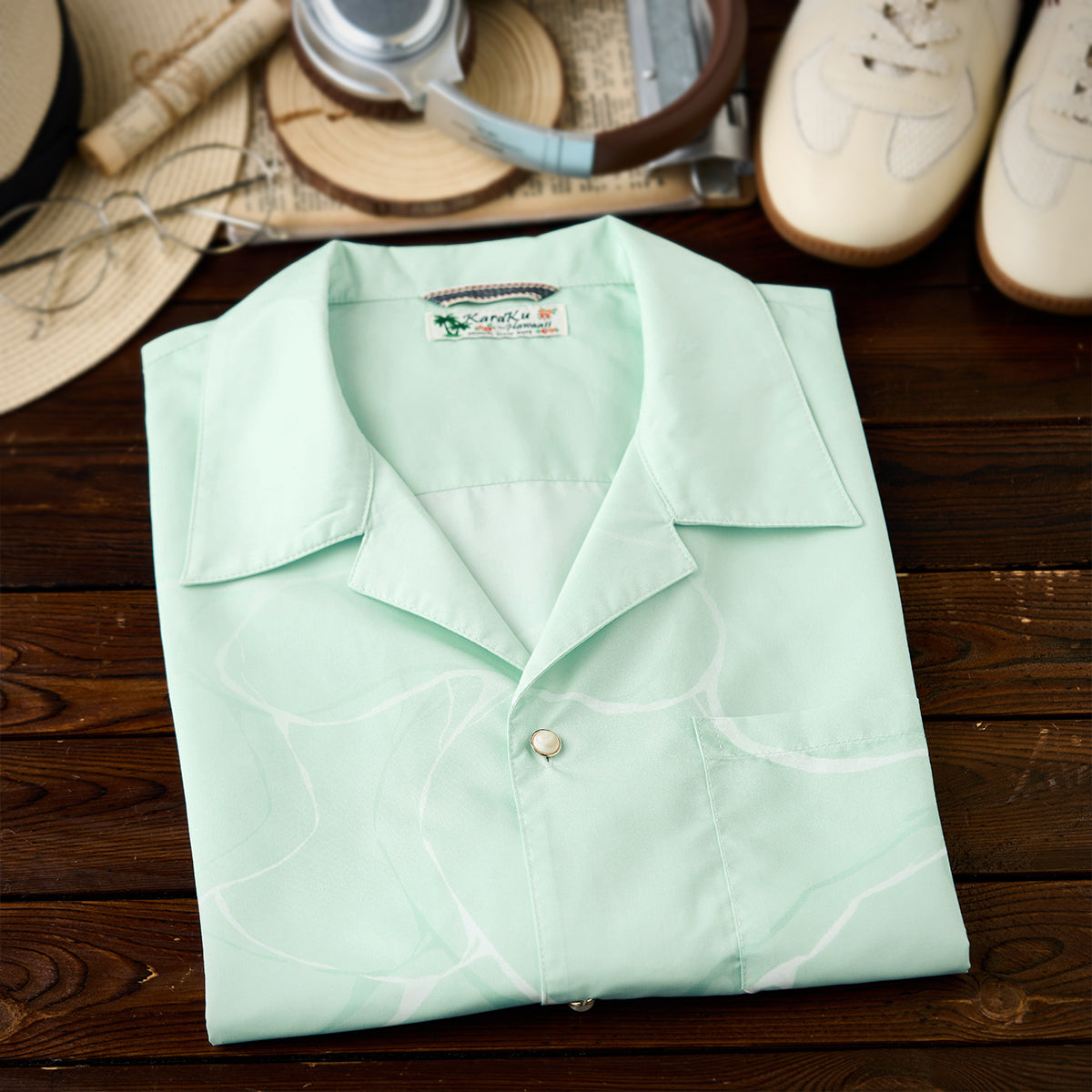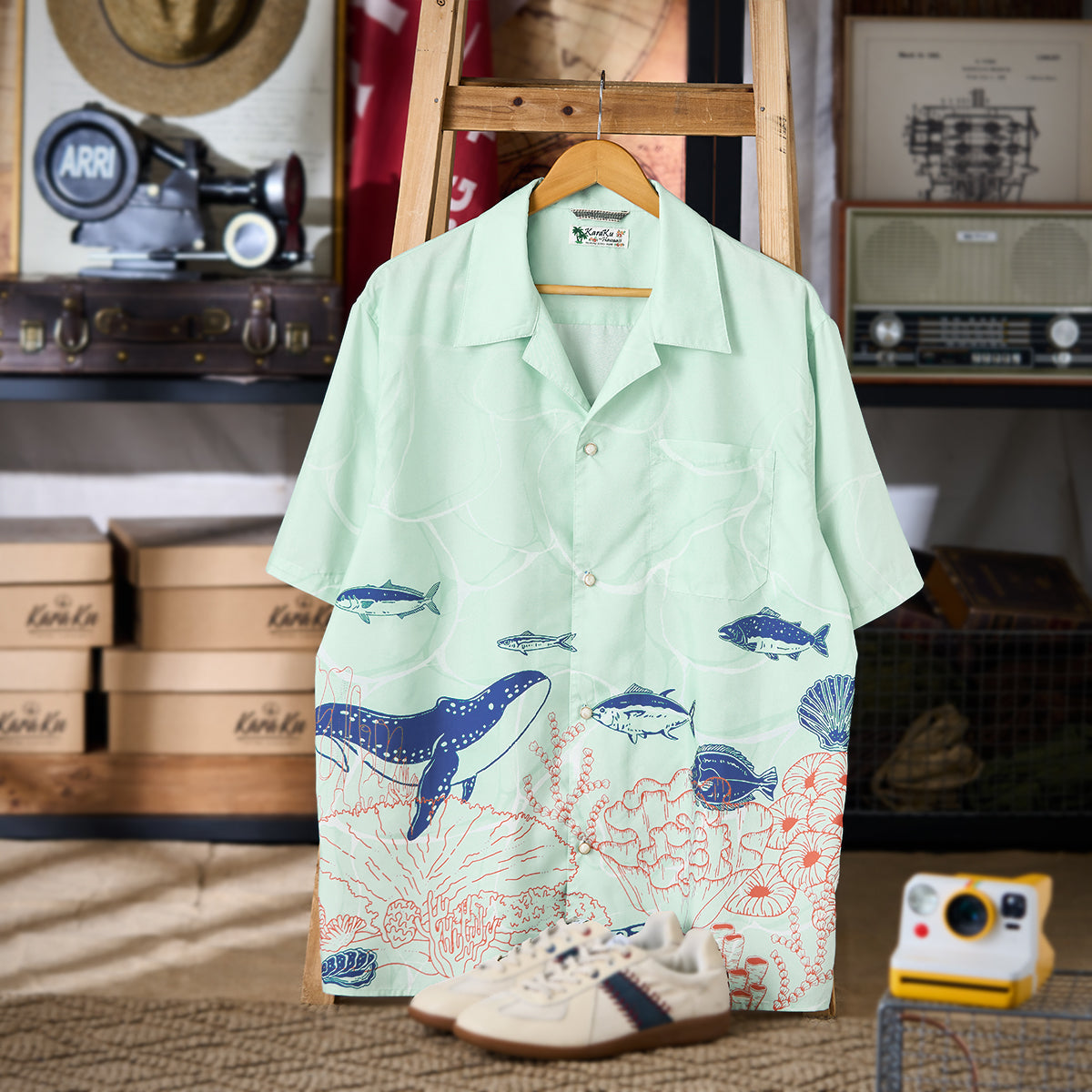 夏の海をそのまま閉じ込めたような、遊び心あふれる一枚。ブルーオレンジのコントラストラインで描かれたクジラやマグロ、サンゴ、貝殻などの海洋生物が、まるで海中を行進するパレードのようにリズミカルに広がる総柄デザインです。ベースには、涼やかな浅ミントグリーンを採用。そこに白い水波紋のような模様を重ねることで、海底に差し込む光の揺らめきを思わせる、透明感のある表情を演出しました。リラックス感のあるシルエットとオープンカラー仕様で、肩の力を抜いた夏の装いを演出します。リゾート感のある開放的な雰囲気をまといながら、街でも自然に映えるデザイン。