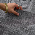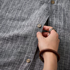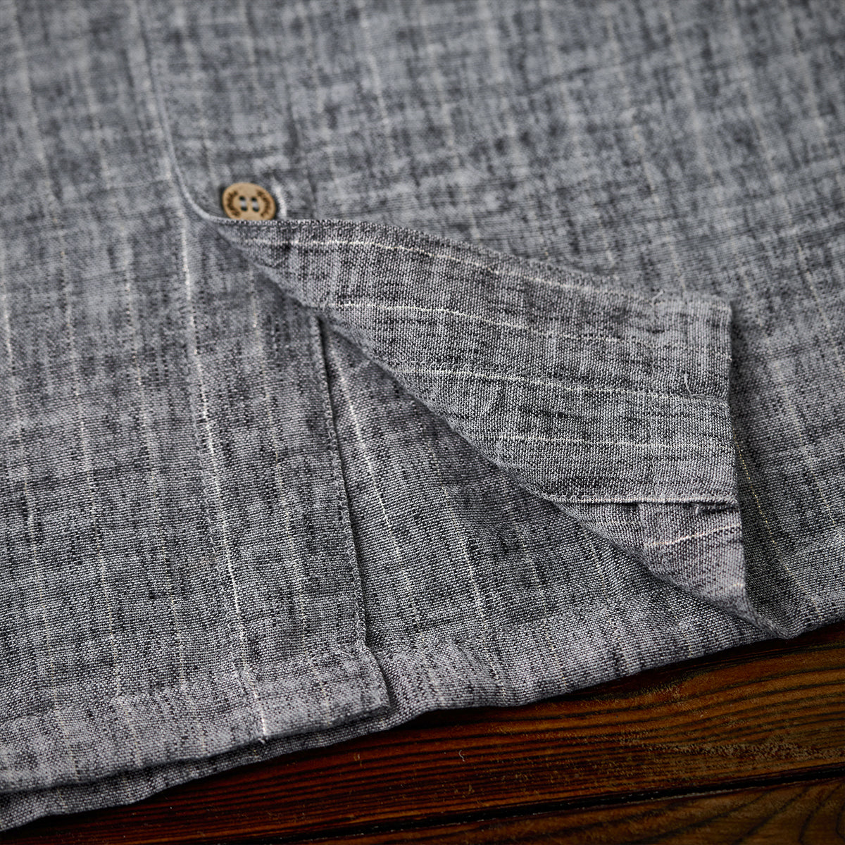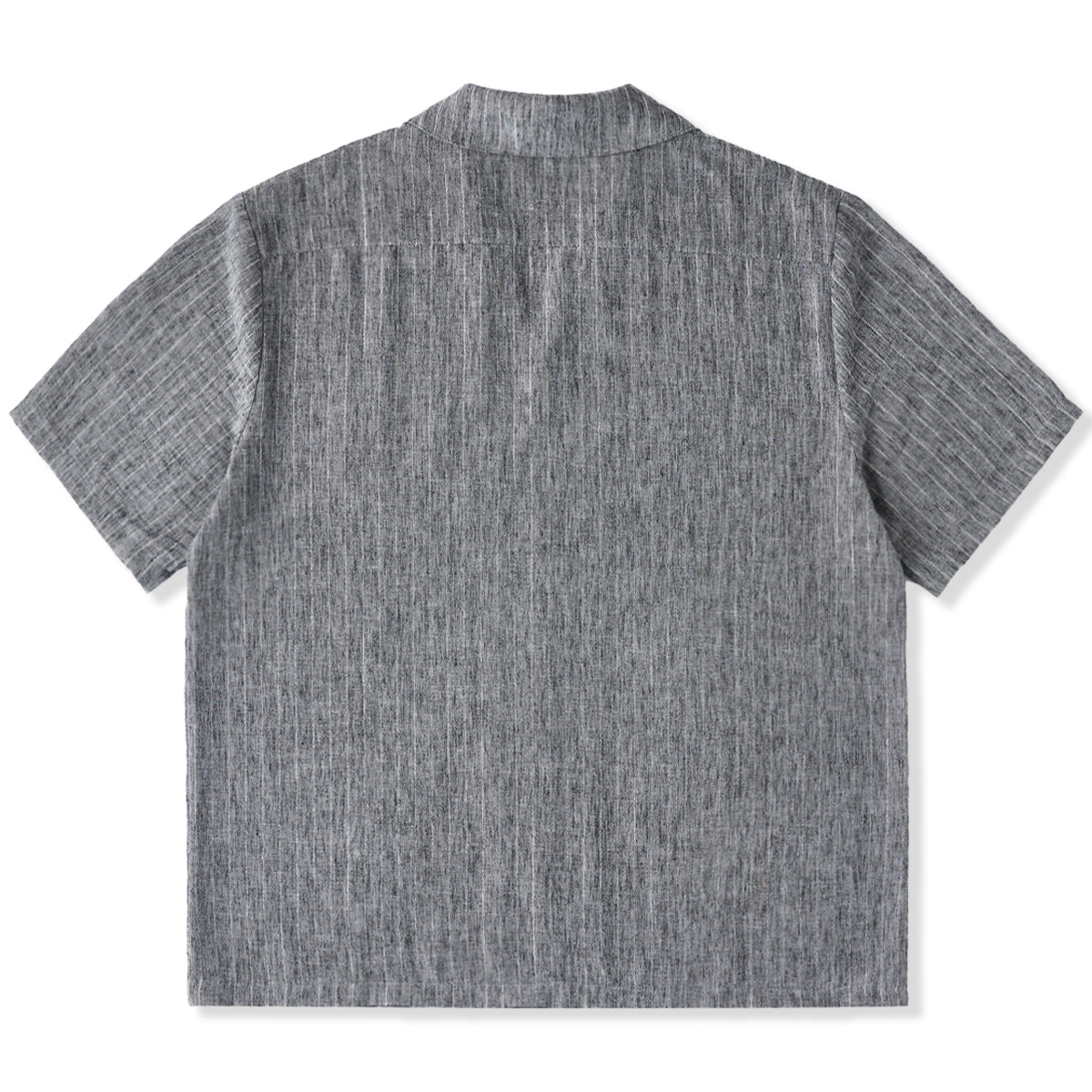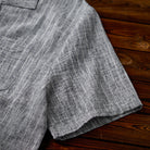 オープンカラーはリラックスした雰囲気を持ち、カジュアルなスタイルに最適です。シンプルなスクエア型の胸ポケットが1つ配置されています。ウッド調のナチュラルなボタンが使用されており、シャツ全体のリラックスした雰囲気を強調しています。