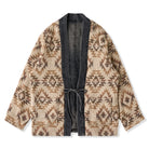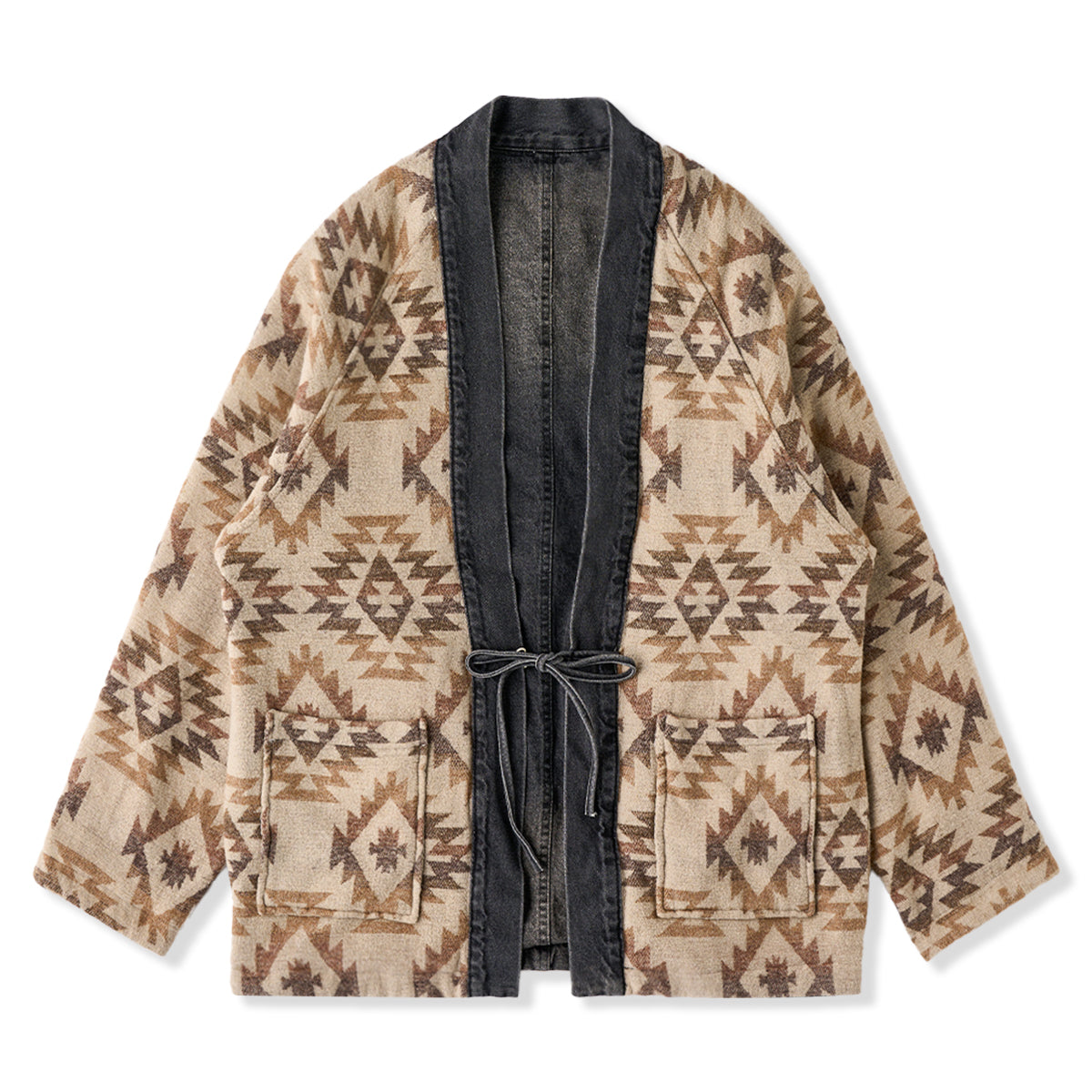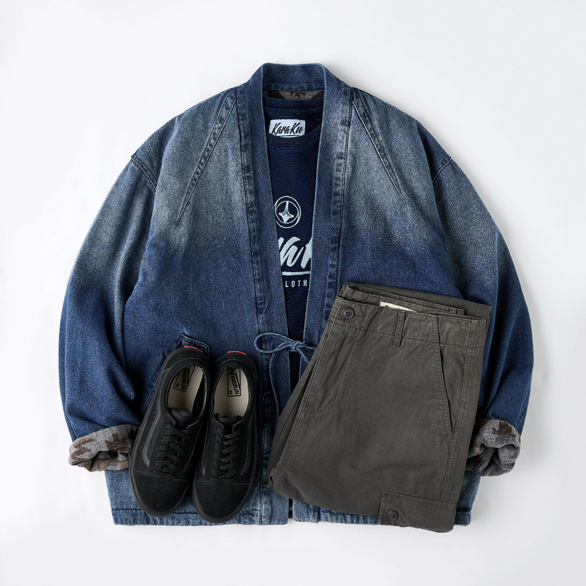 日本伝統の半纏の形状をベースにして、フロント部分の紐結びや直線的なシルエットが特徴。モダンな要素としてデニム素材やエスニック柄を取り入れることで、伝統と現代の融合が見られる。