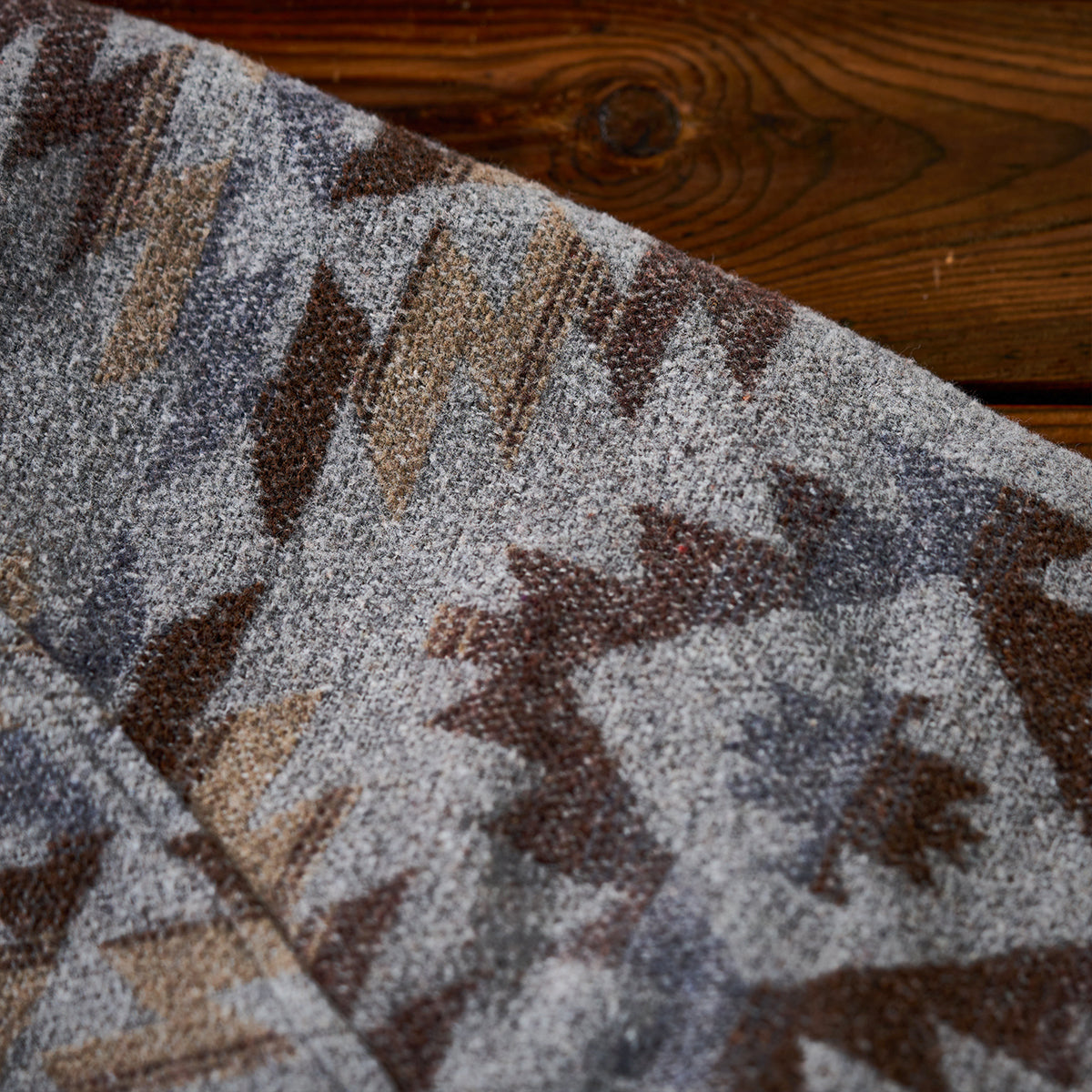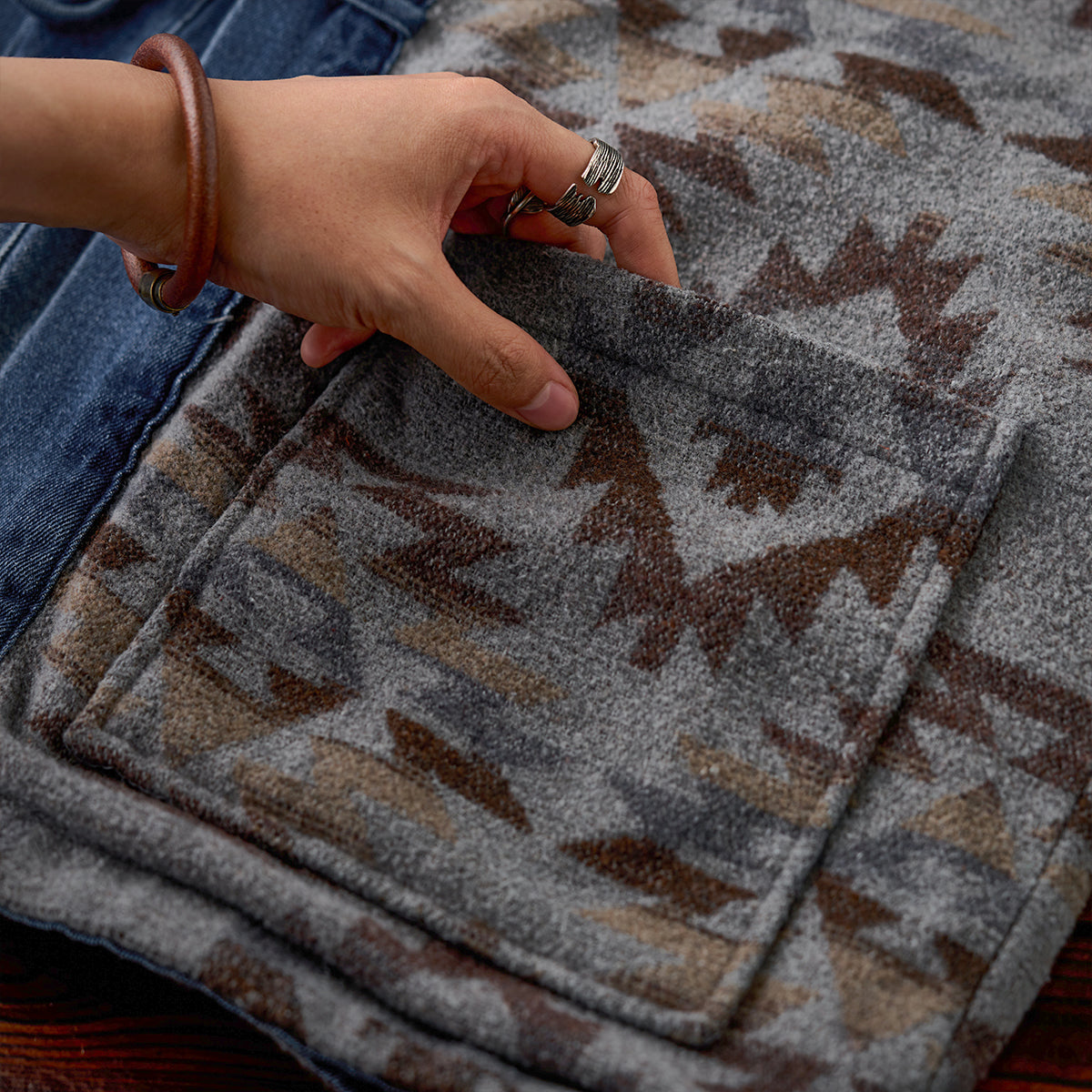 A面はシンプルな無地デザインで、主にデニム素材を使用したカジュアルな印象。B面はエスニック柄が施されて、伝統的な幾何学模様がモダンな要素を引き立てています。