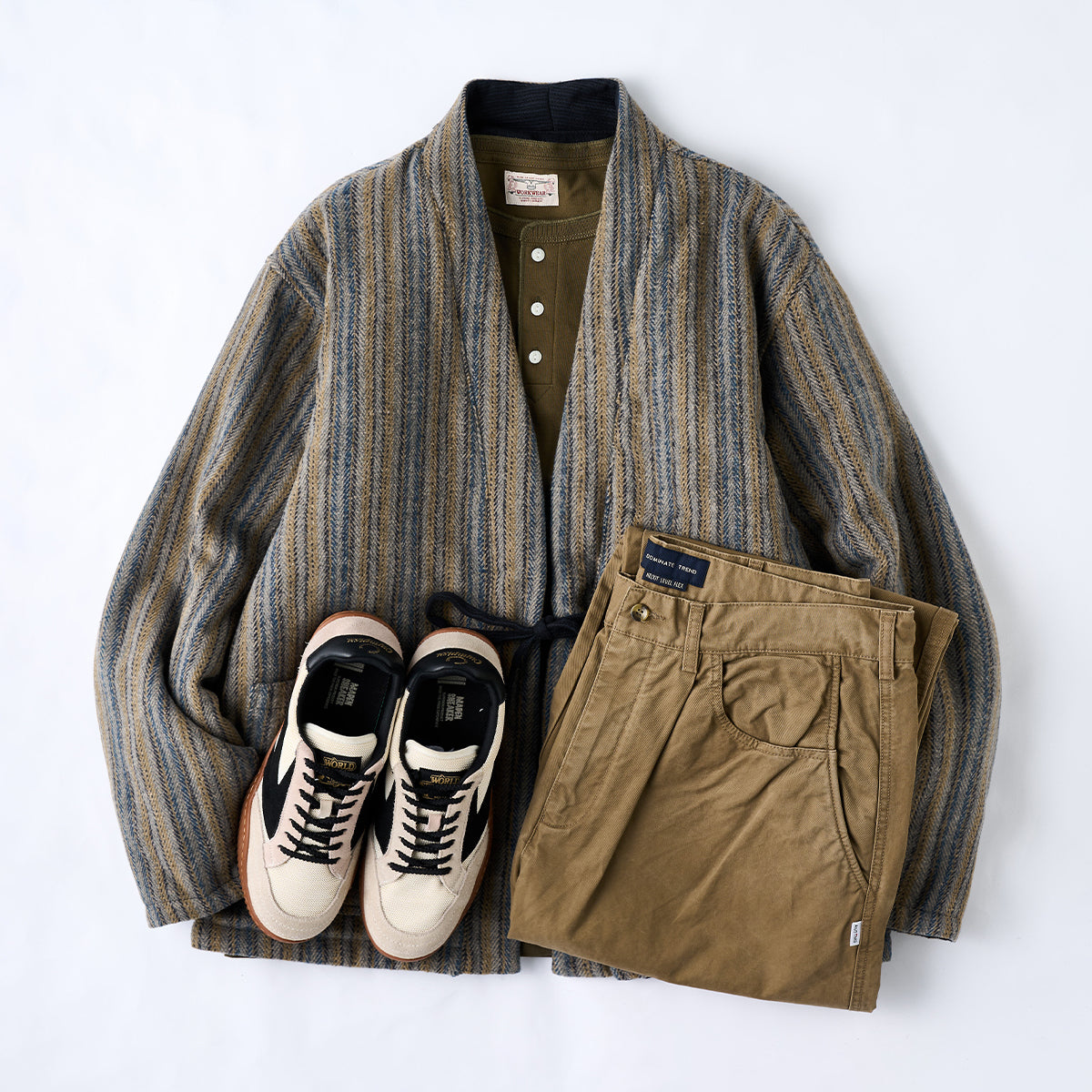 デニムパンツやチノパンと合わせることで、休日のリラックススタイルに最適です。スニーカーやブーツなどカジュアルな足元と好相性です。