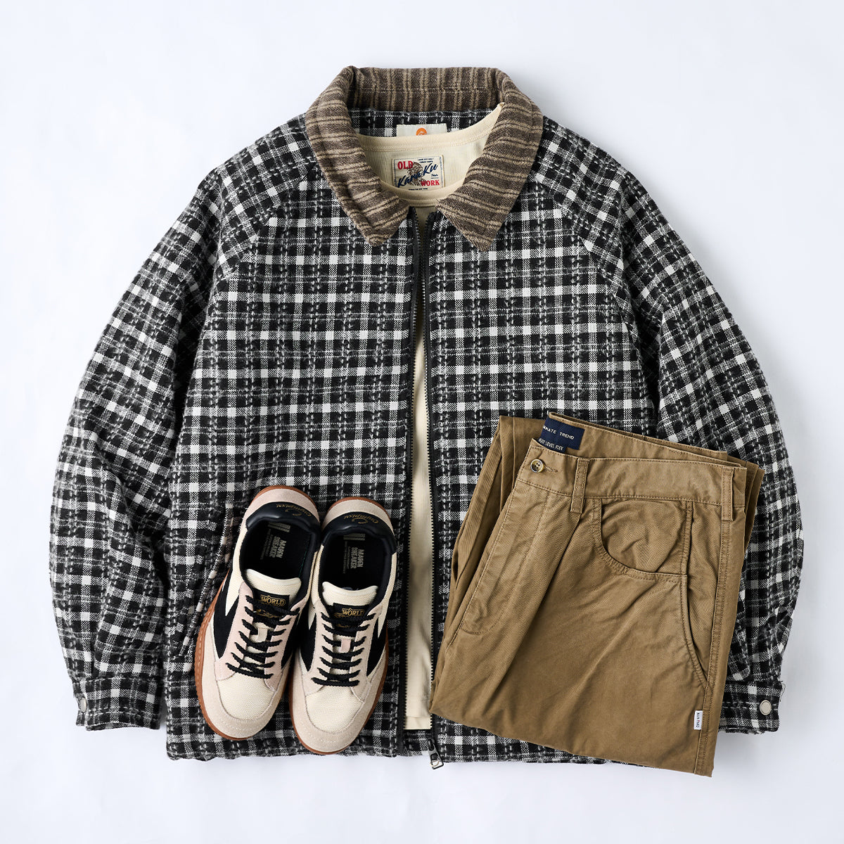 ジーンズやチノパンと合わせることで、統一感のあるカジュアルコーデが可能。ワークブーツやスニーカーと合わせると、全体にアウトドア感やヴィンテージ感が増します。