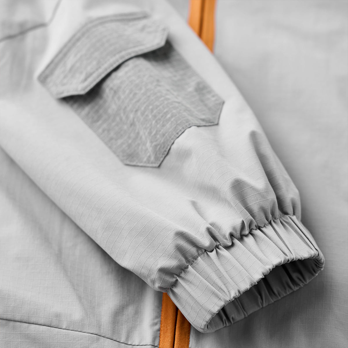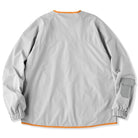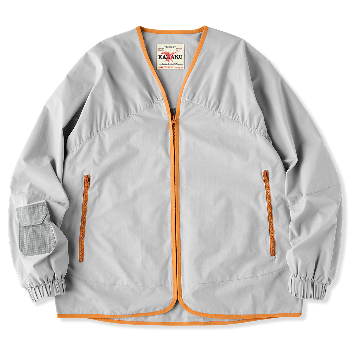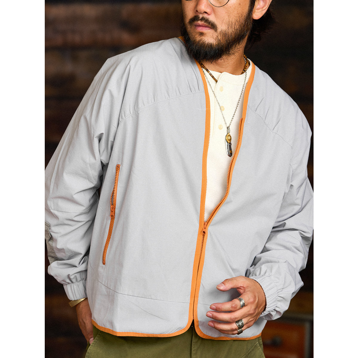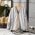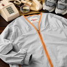 ジッパーと裾、首回りに施されたオレンジのパイピングはアクセントとして目を引きます。グレーの本体色とのコントラストが強調され、全体のデザインにモダンな雰囲気を加えています。