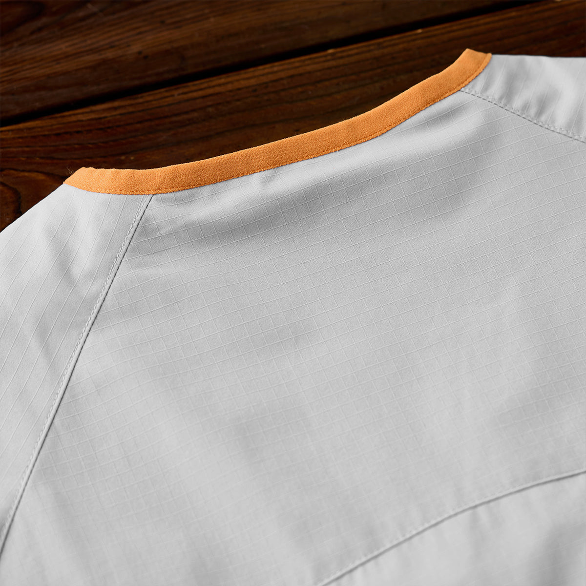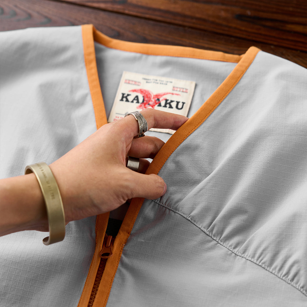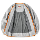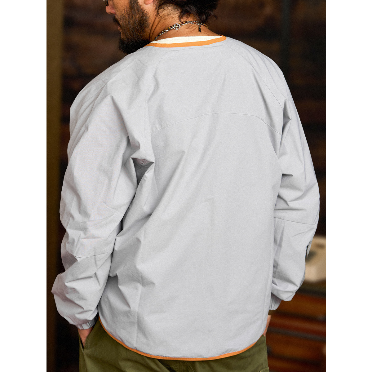 ジッパーと裾、首回りに施されたオレンジのパイピングはアクセントとして目を引きます。グレーの本体色とのコントラストが強調され、全体のデザインにモダンな雰囲気を加えています。
