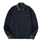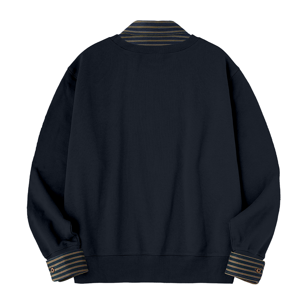このデザインは、スウェットの下にシャツを重ね着しているように見えるフェイクレイヤード仕様です。実際には一体形のデザインで、重ね着する手間を省きつつ、スタイリッシュな見た目を実現しています。