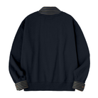 襟元、袖口、裾部分にシャツのストライプ模様が取り入れられています。ストライプはネイビーやゴールド系の落ち着いたカラーで、クラシカルながらモダンな印象を与えます。