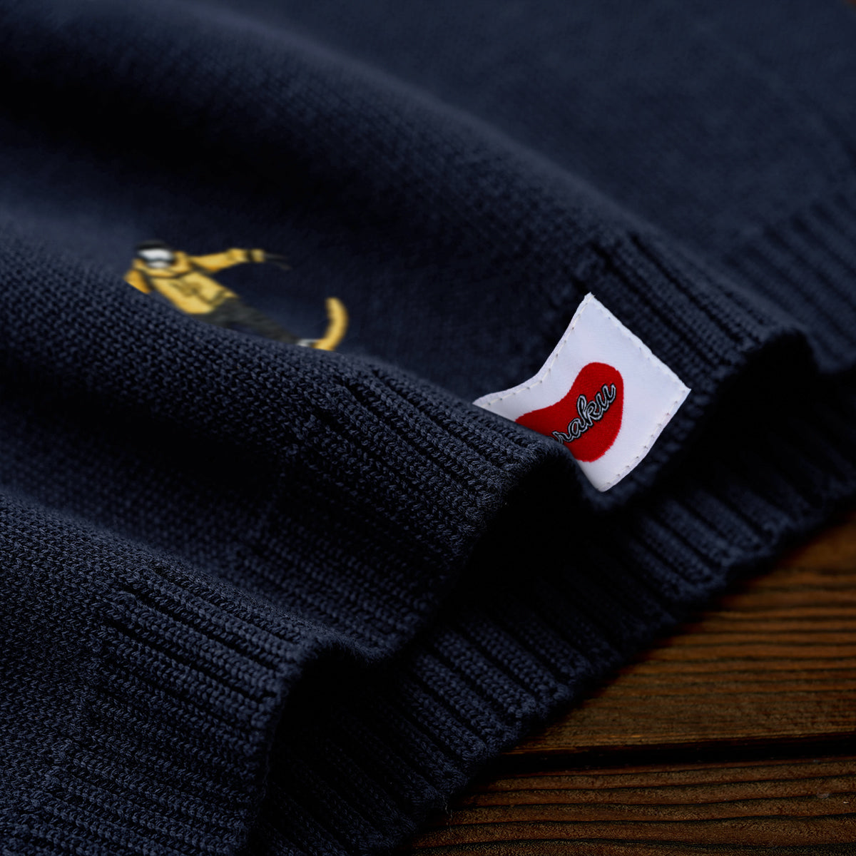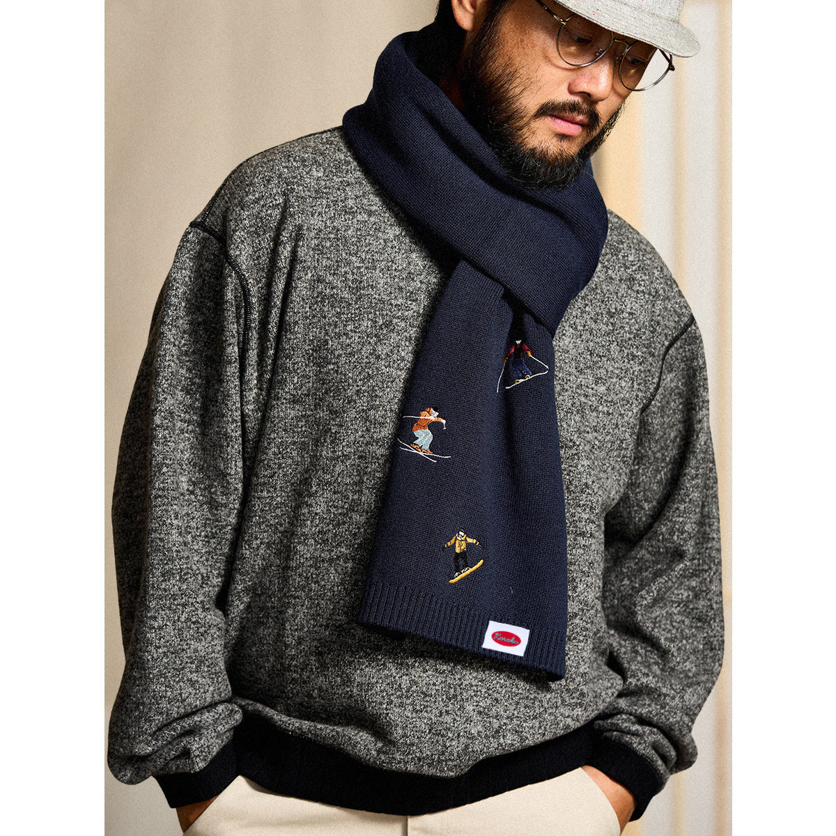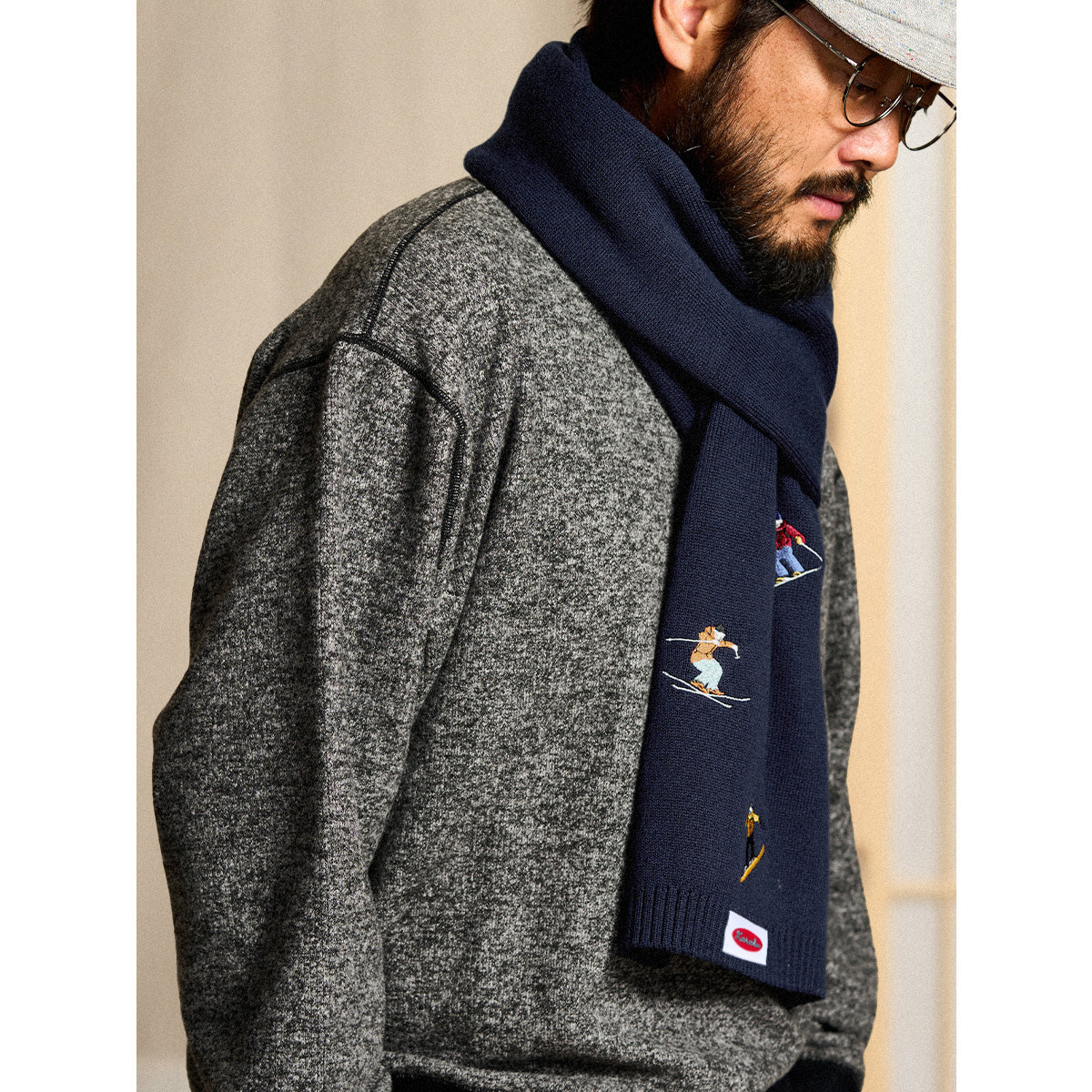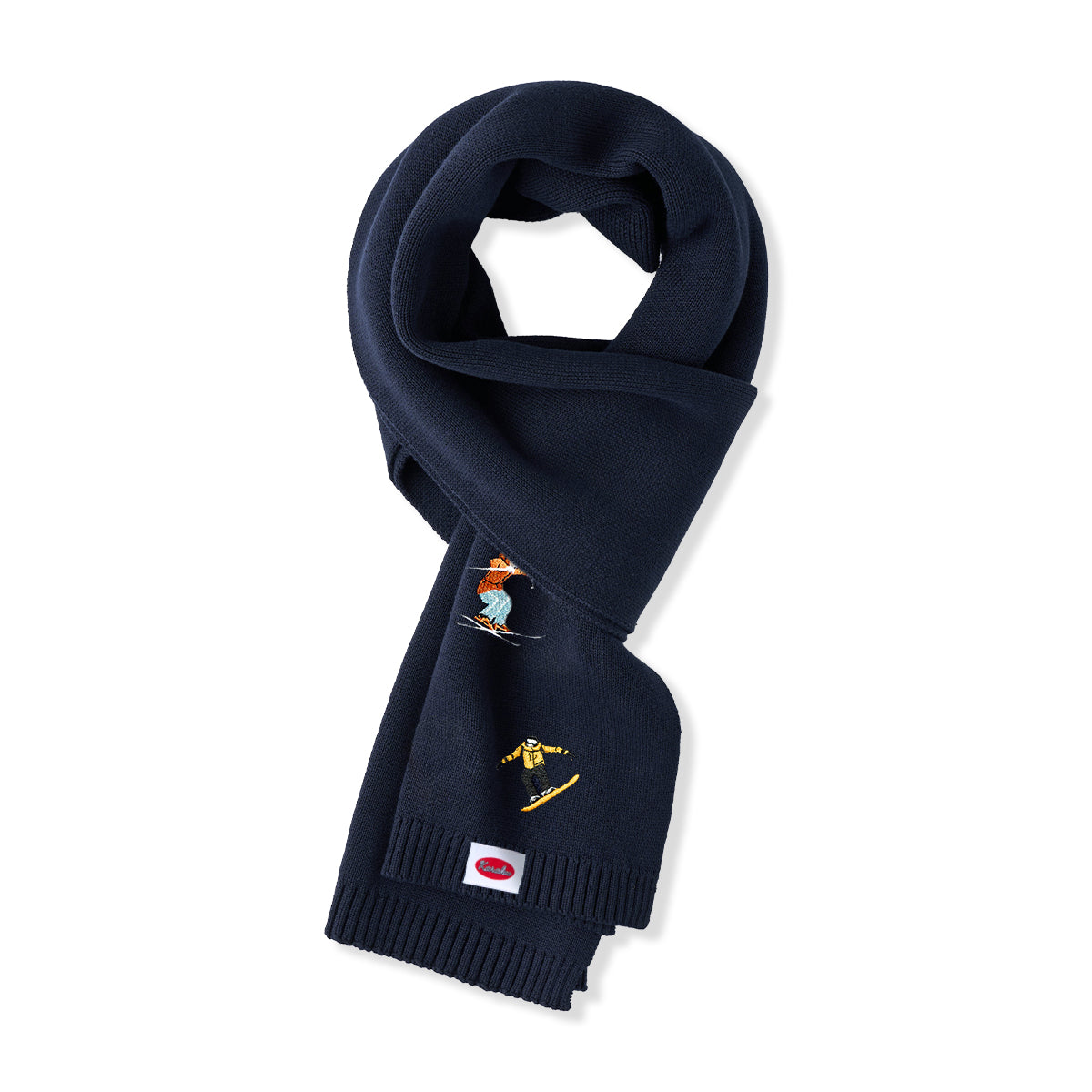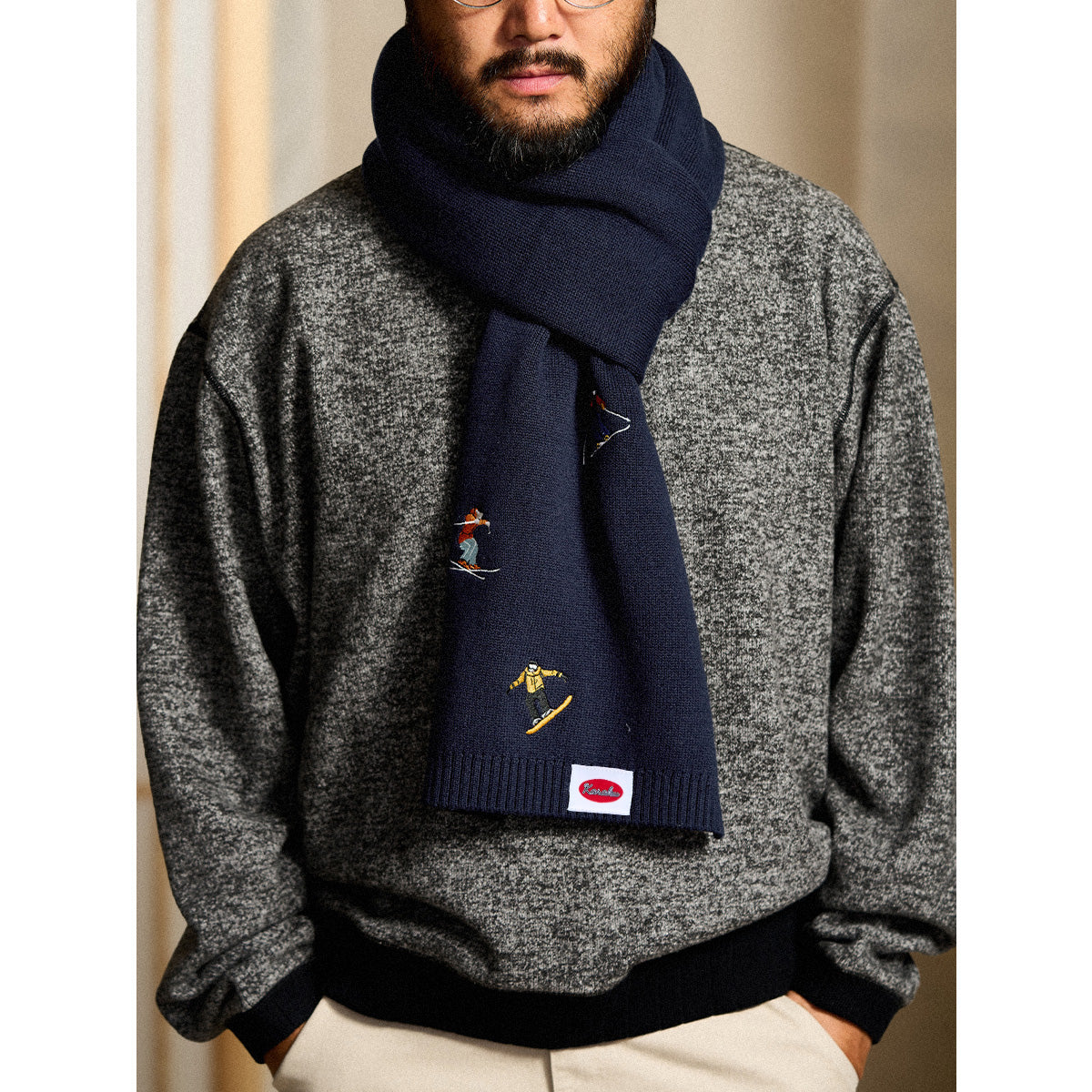 「雪山のスキーヤー」刺繍入り ネイビーニットマフラー