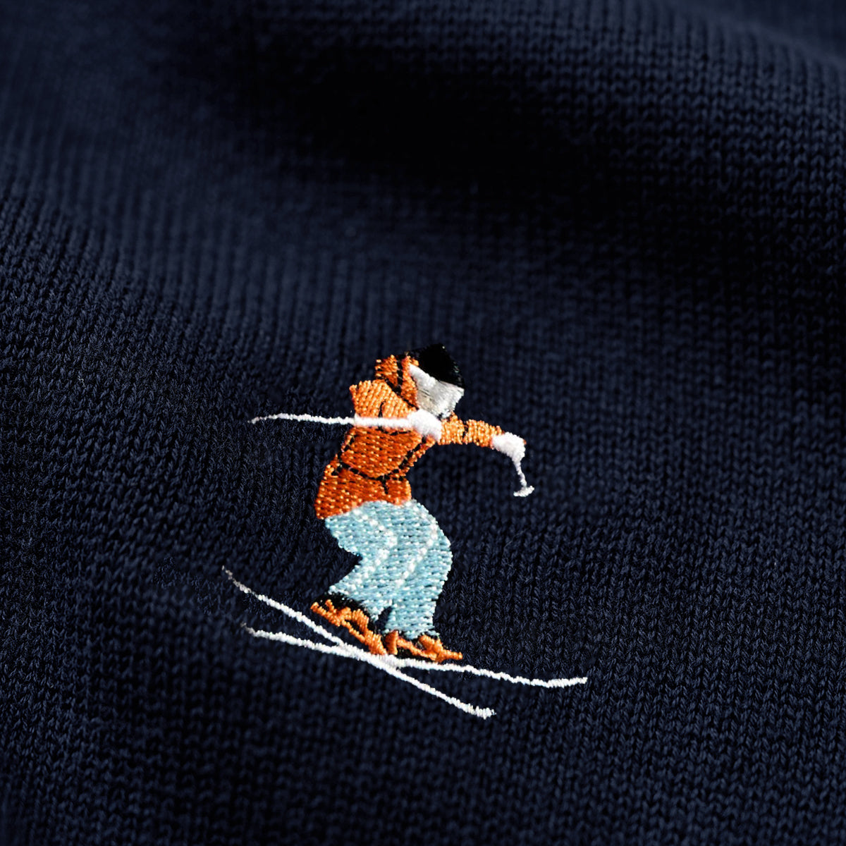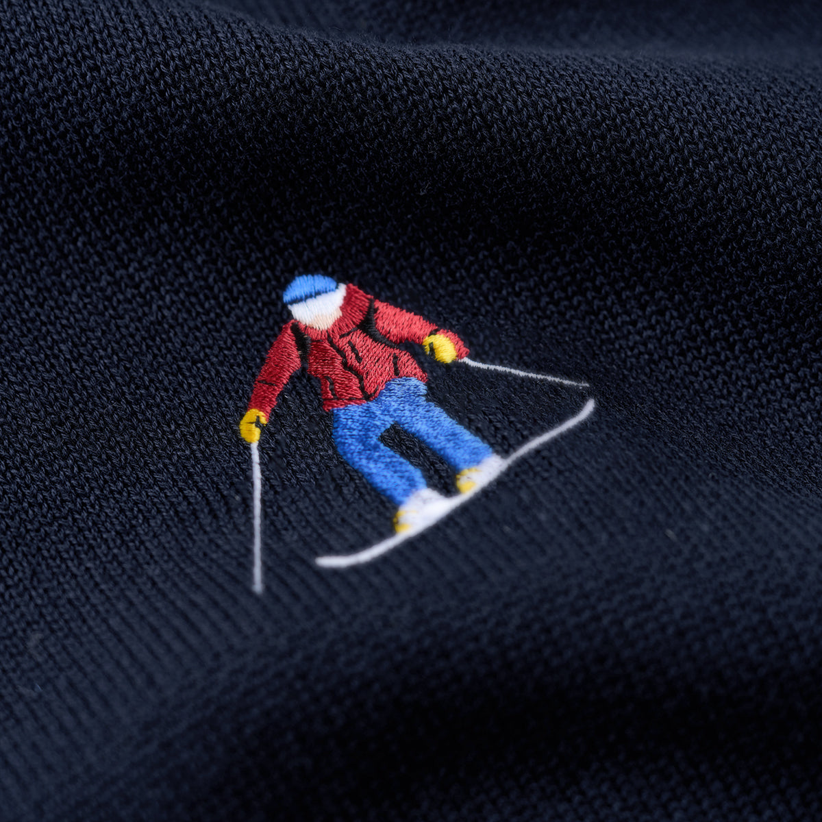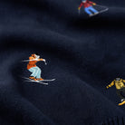 刺繍には2人のスキーヤーと1人のスノーボーダーが描かれ、各キャラクターが異なるポーズで配置されて、躍動感とリズム感が感じられる。スキーヤーやスノーボーダーが滑降しているような自然な流れがあり、見る人にウィンタースポーツの爽快感を伝えます。