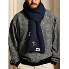 マフラーの幅と長さは適度で、様々な巻き方に対応可能。首元をしっかりと保温しながら、刺繍デザインを見せることもできます。ネイビーは冬のファッションで人気のあるカラーであり、他のアイテムと合わせやすい。