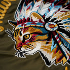 このジャケットの最大の特徴は、背中に大胆に施された「インディアン酋長猫」の刺繍ワッペンで、ネイティブアメリカンの酋長の羽根冠をまとった猫という独創的で遊び心のあるデザインが魅力です。どこか誇り高くもユーモラスな表情が、見る人の心をくすぐります。また「Native American Indian Chief」の英文字刺繍をあしらい、ブランドらしいこだわりと個性をしっかり主張。フライトジャケットの定番スタイルである短めの丈とリブ編みの裾・袖口に、軍服風のエポレットがデザインアクセントとして付いています。ジャケットのフィット感を高め、冷気の侵入を防ぐ工夫がされています。