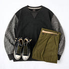 ボディ部分にはスウェット特有の柔らかさとカジュアル感が、袖のデザイン性とバランスを取っています。襟元のV字ステッチがさりげなくスポーティーなアクセントを加えています。裾と袖口にはリブが施されて、フィット感と快適さを両立しています。