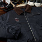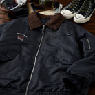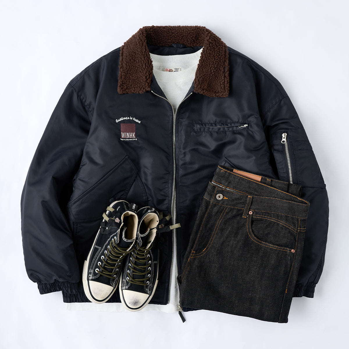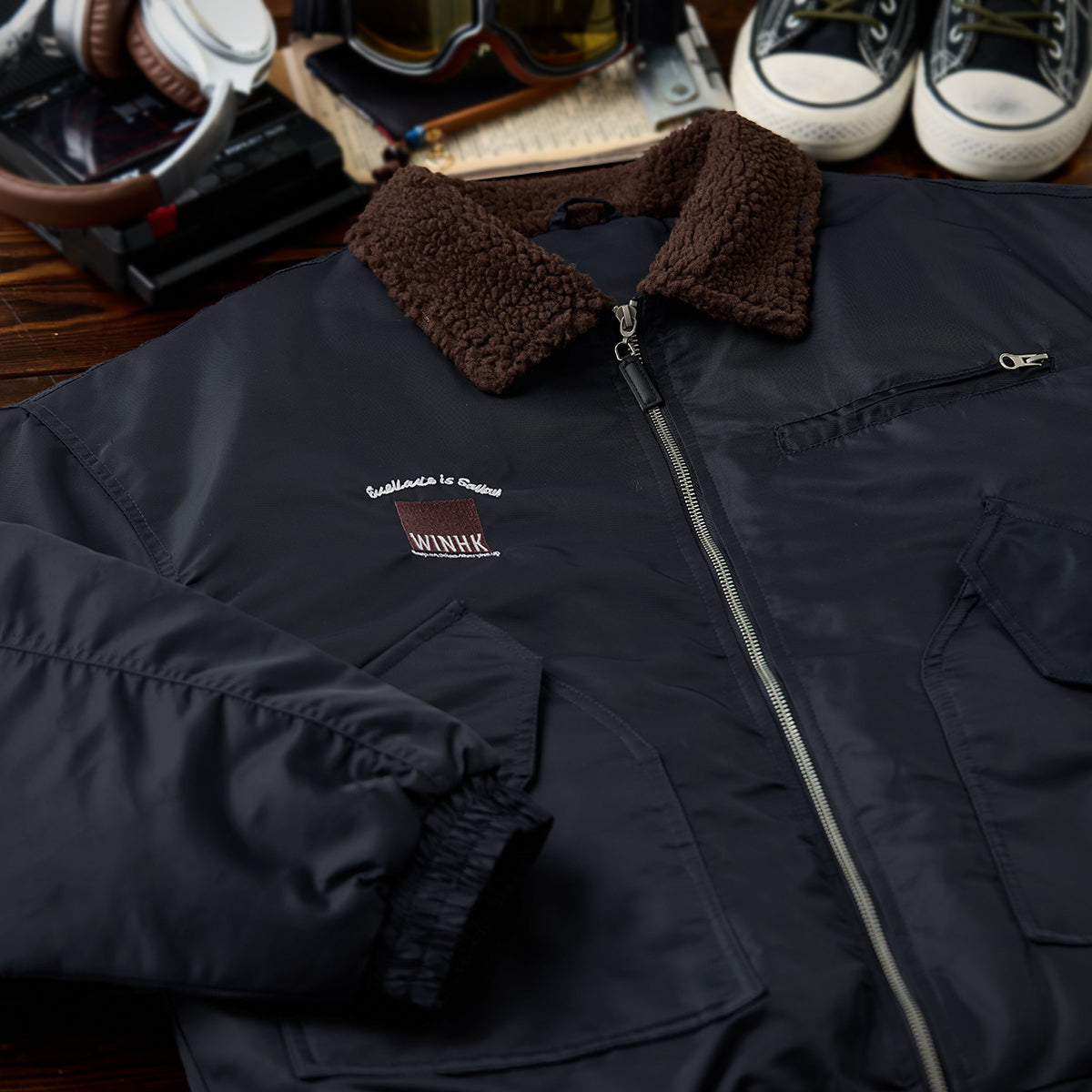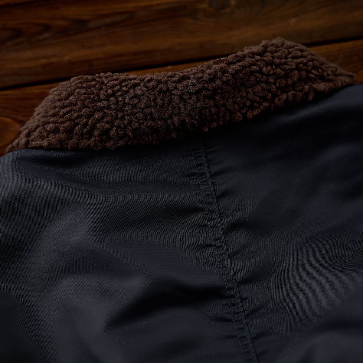 ブラウンのボア素材が襟に採用されて、見た目のアクセントと機能性を両立。左胸部分に刺繍の文字やワッペン部分のレイアウトは、ミリタリーウェアの階級章やパッチデザインを彷彿とさせる。ジッパー付きのスリットポケットが左胸に配置されて、機能性を高めている。左袖にはジップ式のスリーブポケットがあり、ペンや小物の収納が可能。フロント部分には大きなフラップポケットが2つ配置されて、日常的な収納スペースとしても十分な容量を確保。