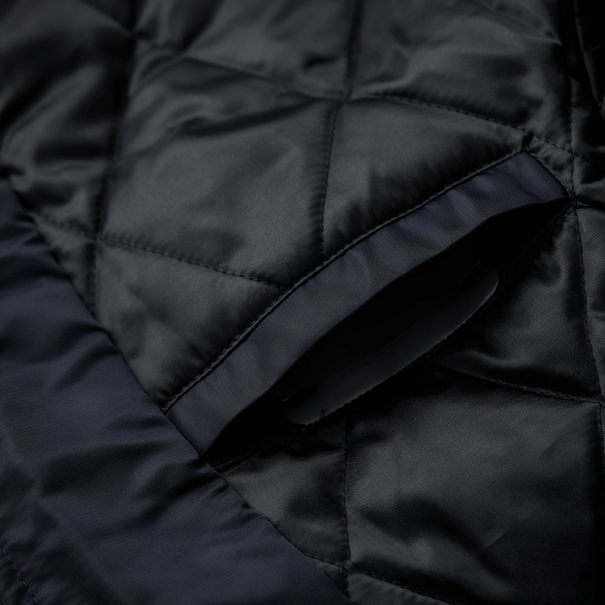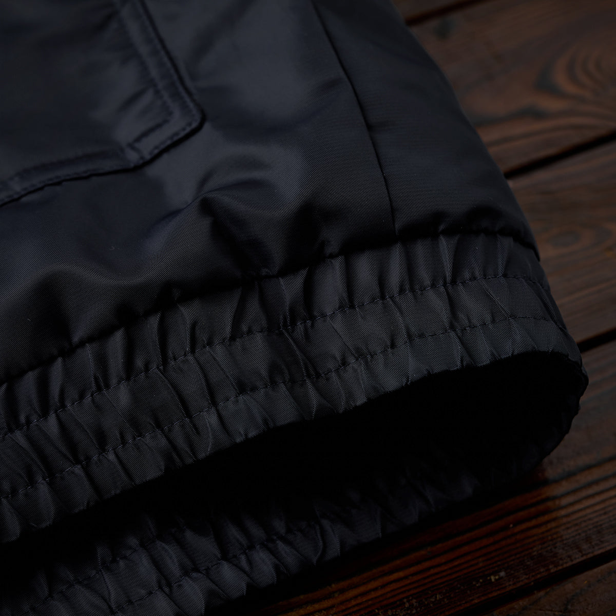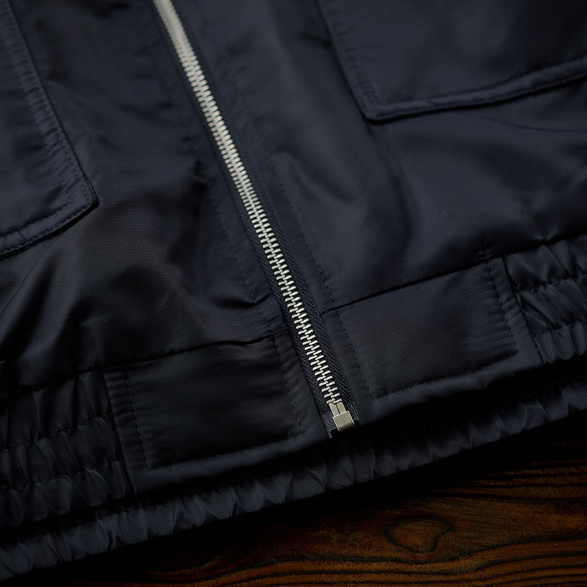 表地のナイロン素材は、光沢があり高級感を感じさせる仕上がり。  耐久性が高く、摩耗や引き裂きに強いため、長期間の使用が可能。防風性・撥水性があり、軽量であるため、秋冬のアウターとして理想的。